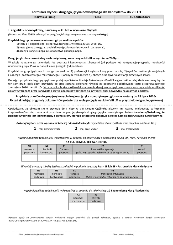 Formularz wyboru drugiego języka nowożytnego dla kandydatów do VIII LO Nazwisko i imię PESEL Tel. Kontaktowy J. angielski - obowiązkowy, nauczany w kl. I-III w wymiarze 3h/tydz. (Dodatkowo klasa IG-EKA od klasy 2 uczy się j.angielskiego w wymiarze rozszerzonym 6h/tyg.) Przydział do grup zaawansowania nastąpi po analizie wyników: 1) testu z j. angielskiego przeprowadzonego 1 września 2016r. w VIII LO, 2) testu gimnazjalnego z j.angielskiego (poziom podstawowy i rozszerzony), 3) oceny z j.angielskiego ze świadectwa gimnazjalnego. Drugi język obcy nowożytny – obowiązkowy, nauczany w kl.I-III w wymiarze 2h/tydz. W szkole nauczane są: j.niemiecki (od podstaw i kontynuacja), j.francuski (od podstaw lub kontynuacja-przypadku możliwości utworzenia grupy 15 os. w danej klasie), j.rosyjski (od podstaw). Przydział do grup językowych nastąpi po analizie: 1) preferencji i wyboru klasy przez ucznia, 2)wyników testów gimnazjalnych z j.obcego (podstawowego i rozszerzonego), 3)oceny ze świadectwa z j. obcego oraz 4)warunków organizacyjnych szkoły. Decyzję o przydziale do grupy językowej podejmuje Szkolna Komisja Rekrutacyjno-Kwalifikacyjna. Jeśli w całej klasie nauczany będzie ten sam drugi język obcy, przydziały do grup zostaną dokonane również na podstawie dodatkowego testu przeprowadzonego 1 września 2016r. w VIII LO. W przypadku braku możliwości utworzenia danej grupy językowej szkoła zastrzega sobie możliwość zmiany wybranego przez kandydata II języka obcego nowożytnego na inny język obcy nowożytny nauczany od podstaw. Przydziały uczniów do grup językowych drugiego języka nowożytnego ogłoszone zostaną do 18 lipca 2016r. Uczeń składając oryginały dokumentów potwierdza wolę podjęcia nauki w VIII LO w przydzielonej grupie językowej Oświadczam, że ubiegam się o przyjęcie do I klasy w VIII Liceum Ogólnokształcącym im. Adama Mickiewicza w Poznaniu i zapoznałam/łem się z zasadami przydziału do grup językowych drugiego języka nowożytnego. Jestem świadoma/świadomy, że poniższy wybór nie jest jednoznaczny z przydziałem, którego ostatecznie dokonuje Szkolna Komisja Rekrutacyjno-Kwalifikacyjna Dokonaj wyboru przez wpisanie w tabelkę odpowiednich cyfr (wypełniasz dla wszystkich wskazanych w podaniu klas) 1 – mój pierwszy wybór 2 – mój drugi wybór 3 – mój trzeci wybór Wypełnij poniższą tabelkę jeśli wskazałaś/eś w podaniu do szkoły klasy z poszerzoną nauką inf., mat., fizyki lub chemii 1A IKA, 1B MKA, 1C FKA, 1D ChKA N1 niemiecki podstawa N2 niemiecki kontynuacja F1 francuski podstawa F2 francuski kontynuacja (tylko w przypadku zebrania 15 os. grupy w klasie) R1 rosyjski podstawa Wypełnij poniższą tabelkę jeśli wskazałaś/eś w podaniu do szkoły klasy 1E lub 1F - Patronackie Klasy Medyczne N1 niemiecki podstawa N2 niemiecki kontynuacja F1 francuski podstawa F2 francuski kontynuacja (tylko w przypadku zebrania 15 os. grupy w klasie) Wypełnij poniższą tabelkę jeśli wskazałaś/eś w podaniu do szkoły klasę 1G Ekonomiczną Klasę Akademicką N2 niemiecki kontynuacja R1 rosyjski podstawa Wyrażam zgodę na przetwarzanie danych osobowych mojego syna/córki dla potrzeb rekrutacji, zgodnie z ustawą o ochronie danych osobowych z dnia 29 sierpnia 1997 r. (Dz. U. z 2002 r. Nr 101, poz. 926, z późn. zm.) ………………………………….…………………………………… ………………………………………………….……… (data i podpis rodzica/prawnego opiekuna kandydata) (data i podpis kandydata)