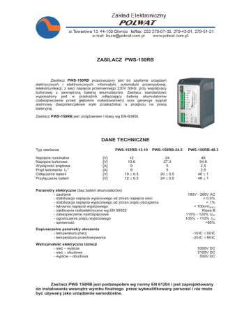 ZASILACZ PWS-150RB Zasilacz PWS-150RB przeznaczony jest do zasilania urządzeń elektrycznych i elektronicznych: informatyki, automatyki przemysłowej, telekomunikacji, z sieci napięcia przemiennego 230V 50Hz, przy współpracy buforowej z zewnętrzną baterią akumulatorów. Zasilacz standardowo wyposażony jest w przekaźnik odłączający baterię akumulatorów (zabezpieczenie przed głębokim rozładowaniem) oraz generuje sygnał alarmowy (bezpotencjałowe styki przekaźnika) o przejściu na pracę bateryjną. Zasilacz PWS-150RB jest urządzeniem I klasy wg EN-60950. DANE TECHNICZNE Typ zasilacza Napięcie nominalne Napięcie buforowe Wydajność prądowa Prąd ładowania Ib * Odłączenie baterii Przyłączenie baterii [V] [V] [A] [A] [V] [V] PWS-150RB-12.10 PWS-150RB-24.5 PWS-150RB-48.3 12 13.6 9 9 10 ± 0.3 12 ± 0.3 24 27.3 5 5 20 ± 0.5 24 ± 0.5 48 54.6 2.5 2.5 40 ± 1 48 ± 1 Parametry elektryczne (bez baterii akumulatorów) - zasilanie - stabilizacja napięcia wyjściowego od zmian napięcia sieci - stabilizacja napięcia wyjściowego od zmian prądu obciążenia - tętnienia napięcia wyjściowego - zakłócenia radioelektryczne wg EN 55022 - zabezpieczenie nadnapięciowe - ograniczenie prądu wyjściowego - sprawność Dopuszczalne parametry otoczenia - temperatura pracy - temperatura przechowywania Wytrzymałość elektryczna izolacji - sieć – wyjścia - sieć – obudowa - wyjście – obudowa 180V - 265V AC < 0.5% < 1% < 100mV(p-p.) Klasa B 115% - 120% Uon 105% - 110% Ion >85% -10°C ÷ 55°C -25°C ÷ 85°C 5300V DC 2100V DC 500V DC Zasilacz PWS 150RB jest podzespołem wg normy EN 61204 i jest zaprojektowany do instalowania wewnątrz wyrobu finalnego przez wykwalifikowany personel i nie może być używany jako urządzenie samodzielne. Schemat blokowy zasilacza PWS-150RB. Wymiary gabarytowe zasilacza PWS-150RB. Obszar pracy zasilacza PWS-150RB.
