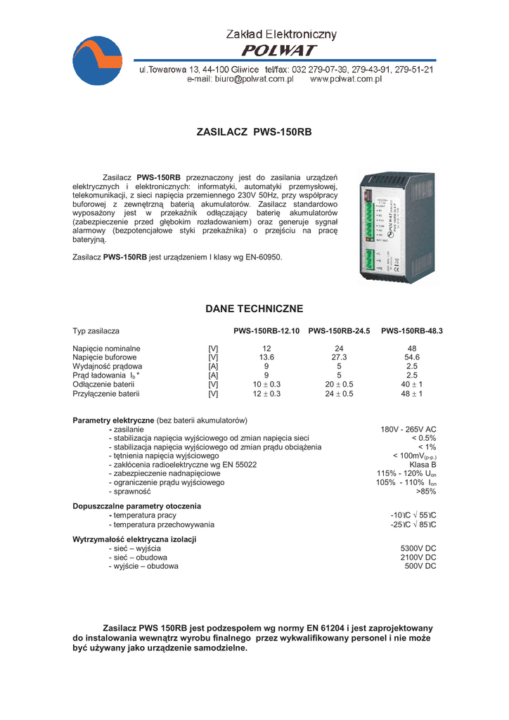 ZASILACZ PWS-150RB DANE TECHNICZNE