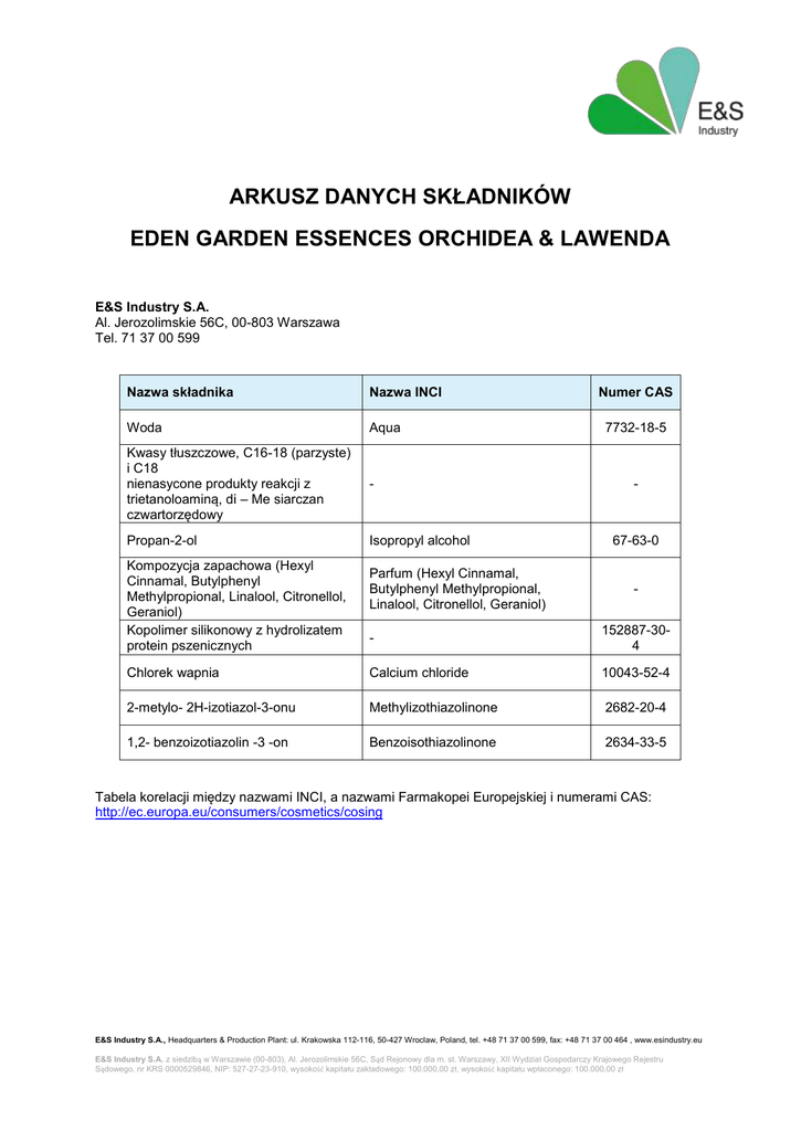 ARKUSZ DANYCH SKŁADNIKÓW EDEN GARDEN ESSENCES ORCHIDEA & LAWENDA E&S Industry S.A. Al. Jerozolimskie 56C, 00-803 Warszawa Tel. 71 37 00 599 Nazwa składnika Nazwa INCI Woda Aqua Kwasy tłuszczowe, C16-18 (parzyste) i C18 nienasycone produkty reakcji z trietanoloaminą, di – Me siarczan czwartorzędowy - Propan-2-ol Isopropyl alcohol Kompozycja zapachowa (Hexyl Cinnamal, Butylphenyl Methylpropional, Linalool, Citronellol, Geraniol) Kopolimer silikonowy z hydrolizatem protein pszenicznych Parfum (Hexyl Cinnamal, Butylphenyl Methylpropional, Linalool, Citronellol, Geraniol) Numer CAS 7732-18-5 - 67-63-0 - - 152887-304 Chlorek wapnia Calcium chloride 10043-52-4 2-metylo- 2H-izotiazol-3-onu Methylizothiazolinone 2682-20-4 1,2- benzoizotiazolin -3 -on Benzoisothiazolinone 2634-33-5 Tabela korelacji między nazwami INCI, a nazwami Farmakopei Europejskiej i numerami CAS: http://ec.europa.eu/consumers/cosmetics/cosing E&S Industry S.A., Headquarters & Production Plant: ul. Krakowska 112-116, 50-427 Wroclaw, Poland, tel. +48 71 37 00 599, fax: +48 71 37 00 464 , www.esindustry.eu E&S Industry S.A. z siedzibą w Warszawie (00-803), Al. Jerozolimskie 56C, Sąd Rejonowy dla m. st. Warszawy, XII Wydział Gospodarczy Krajowego Rejestru Sądowego, nr KRS 0000529846, NIP: 527-27-23-910, wysokość kapitału zakładowego: 100.000,00 zł, wysokość kapitału wpłaconego: 100.000,00 zł