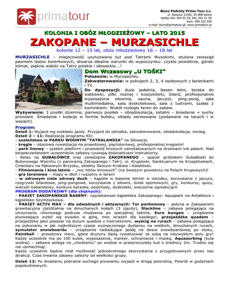 Biuro Podróży Prima Tour s.c. ul. Staszica 1/205, 25-008 Kielce tel/fax 041 344 53 29, 041 343 31 50 kom. 509 222 020 e-mail: [email protected], www.primatour.pl KOLONIA I OBÓZ MŁODZIEŻOWY – LATO 2015 ZAKOPANE – MURZASICHLE kolonie 12 – 15 lat, obóz młodzieżowy 16 – 18 lat MURZASICHLE – miejscowość usytuowana tuż pod Tatrami Wysokimi, otulona zewsząd pasmem lasów świerkowych, stwarza idealne warunki do wypoczynku: czyste powietrze, górski klimat, piękne widoki na Tatry polskie i słowackie...! Dom Wczasowy „U TOŚKI” Położenie: w Murzasichlu. Zakwaterowanie: w pokojach 2, 3, 4 osobowych z łazienkami i TV. Do dyspozycji: duża jadalnia, basen letni, boiska do siatkówki, piłki nożnej i koszykówki, bilard, profesjonalnie wyposażona siłownia, sauna, jacuzzi, ping-pong, sala multimedialna, sala dyskotekowa, sala z lustrami, szałas z kominkiem. Wokół rozległy teren do zabaw. Wyżywienie: 3 posiłki dziennie, pierwszy posiłek – obiadokolacja, ostatni – śniadanie + suchy prowiant. Śniadania i kolacje w formie bufetu, obiady serwowane (podawane na tacach i w wazach). Program: Dzień 1: Wyjazd wg rozkładu jazdy. Przyjazd do ośrodka, zakwaterowanie, obiadokolacja, nocleg. Dzień 2 – 11: Realizacja programu KO: - szaleństwo w PARKU WODNYM “TATRALANDIA” na Słowacji; - kręgle – obozowa rywalizacja na prawdziwej, pięciotorowej, profesjonalnej kręgielni! - park linowy – system platform i przeszkód linowych zainstalowanych na drzewach lub palach. Nad bezpieczeństwem uczestników zabawy czuwają doświadczeni instruktorzy. - Relax na GUBAŁÓWCE oraz zwiedzanie ZAKOPANEGO – spacer grzbietem Gubałówki do Butorowego Wierchu (z panoramą Zakopanego i Tatr), ul. Krupówki, Sanktuarium na Krzeptówkach, Cmentarz na Pęksowym Brzysku, obiekty Skoczni Krokiew i Kalatówki. - Filmomania i kino letnie – „noc hitów kinowych” (na świeżym powietrzu na Polach Krupowych)! - gra terenowa – mapy w dłoń i ruszamy w teren! - w zdrowym ciele zdrowy duch – kąpiele w basenie letnim w ośrodku, korzystanie z jacuzzi, rozgrywki bilardowe, ping-pongowe, korzystanie z siłowni, boisk sportowych, gry, konkursy, quizy, wieczór kabaretowy, konkurs karaoke, podchody, dyskoteki, wieczorne ognisko/gril. PROGRAM DODATKOWY (dla chętnych): - PAKIET ZAKOPAŃSKIE BASENY: najciekawsze kąpieliska Zakopanego: Aquapark na Antałówce i kąpielisko Szymoszkowa. - PAKIET ACTIV MAX – dla odważnych i aktywnych: Tor pontonowy – jedyna w Zakopanem grawitacyjna zjeżdżalnia na dmuchanych kołach (3 zjazdy), Slackline – zabawa polegająca na utrzymaniu równowagi podczas chodzenia po specjalnej taśmie, Euro bungee – urządzenie pozwalające wybić się wysoko w górę, moc wrażeń dla każdego!, przejażdżka quadem – przejażdżka jako pasażer na dużym quadzie z instruktorem, wyścig na rurach – zabawa polegająca na pokonaniu w jak najkrótszym czasie wyznaczonego dystansu na wielkich, dmuchanych rurach, symulator snowboardu – urządzenie naśladujące jazdę na desce snowboardowej po stoku, Paintball – prawdziwy mecz, gdzie drużyny będą rywalizować ze sobą na niezwykłym polu gry! Każdy uczestnik ma po 100 kulek, wyposażenie, marker, ochraniacze i maskę, Aquazorbing (kula wodna) – zabawa polega na „chodzeniu” po wodzie w przezroczystej kuli o średnicy 2m. Trudno się nie uśmiechnąć. Każdy uczestnik będzie miał możliwość jednokrotnego skorzystania z przygotowanych przez nas atrakcji. Czas trwania zabawy zależny od wielkości grupy. Dzień 12: Po śniadaniu pobranie suchego prowiantu wyjazd w drogę powrotną. Powrót w godzinach popołudniowych. Biuro Podróży Prima Tour s.c. ul. Staszica 1/205, 25-008 Kielce tel/fax 041 344 53 29, 041 343 31 50 kom. 509 222 020 e-mail: [email protected], www.primatour.pl termin 28.06 – 09.07.2015 10.07 – 21.07.2015 cena 1 439 zł 1 439 zł Cena obejmuje: - zakwaterowanie 11 noclegów, - wyżywienie (3 posiłki dziennie), suchy prowiant, - opiekę wychowawców, przewodnika, - wycieczkę autokarową na Słowację i bilety wstępu do TATRALANDII (wymagany paszport lub dowód osobisty). - zabawę w Parku Linowym ADVENTURE. - kręgle – turniej, - wstępy do Tatrzańskiego Parku Narodowego (wymagane odpowiednie obuwie), - ubezpieczenie NNW, - program rekreacyjno-sportowy wg opisu. Dodatkowo płatne: - dojazd na miejsce autokarem (wg rozkładu jazdy): dojazd własny – bez dopłaty; Częstochowa, Katowice, Kraków (+ 100 zł); Kielce, Łódź, Opole, Piotrków Tryb., Radom, Warszawa, Wrocław (+ 130 zł); Lublin, Poznań (+ 160 zł); Gdańsk (+ 190 zł); - bezpieczenie od kosztów rezygnacji z imprezy (dobrowolne, zalecamy wykupienie) + 50 zł. - Pakiet Zakopiańskie Baseny + 40 zł. - Pakiet Activ Max + 150 zł. - Dom „do góry nogami” + 5 zł. - Góralska potańcówka, czyli pokaz i nauka tańca przy dźwiękach kapeli góralskiej w strojach ludowych, konkurs tańca dla "ceprów" (realizowana przy min. 10 osobach) + 35 zł/os. UWAGI: Należy ze sobą zabrać: paszport lub dowód, wygodne obuwie do pieszych wędrówek, mały plecak, kurtkę przeciwdeszczową, ciepły sweter, mały plecak, strój kąpielowy, ręcznik kąpielowy, nakrycie głowy od słońca, okulary przeciwsłoneczne. Proponowane min. kieszonkowe 150 – 200 PLN.