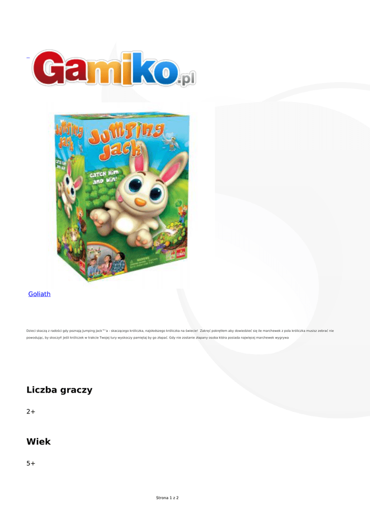 Goliath Dzieci skaczą z radości gdy poznają Jumping Jack™'a - skaczącego króliczka, najsłodszego króliczka na świecie! Zakręć pokrętłem aby dowiedzieć się ile marchewek z pola króliczka musisz zebrać nie powodując, by skoczył! Jeśli króliczek w trakcie Twojej tury wyskoczy pamiętaj by go złapać. Gdy nie zostanie złapany osoba która posiada najwięcej marchewek wygrywa Liczba graczy 2+ Wiek 5+ Strona 1 z 2 Wydanie zagraniczne Instrukcja angielska Strona 2 z 2