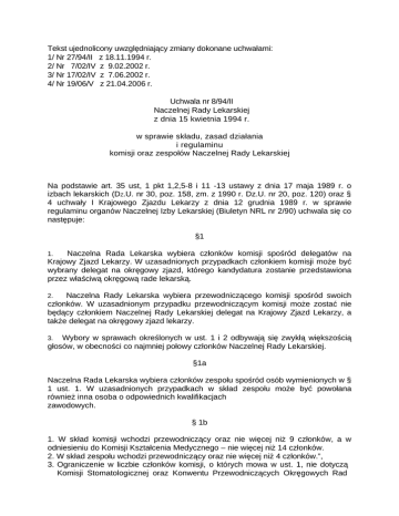 Tekst ujednolicony uwzględniający zmiany dokonane uchwałami: 1/ Nr 27/94/II z 18.11.1994 r. 2/ Nr 7/02/IV z 9.02.2002 r. 3/ Nr 17/02/IV z 7.06.2002 r. 4/ Nr 19/06/V z 21.04.2006 r. Uchwala nr 8/94/II Naczelnej Rady Lekarskiej z dnia 15 kwietnia 1994 r. w sprawie składu, zasad działania i regulaminu komisji oraz zespołów Naczelnej Rady Lekarskiej Na podstawie art. 35 ust, 1 pkt 1,2,5-8 i 11 -13 ustawy z dnia 17 maja 1989 r. o izbach lekarskich (DZ.U. nr 30, poz. 158, zm. z 1990 r. Dz.U. nr 20, poz. 120) oraz § 4 uchwały I Krajowego Zjazdu Lekarzy z dnia 12 grudnia 1989 r. w sprawie regulaminu organów Naczelnej Izby Lekarskiej (Biuletyn NRL nr 2/90) uchwala się co następuje: §1 Naczelna Rada Lekarska wybiera członków komisji spośród delegatów na Krajowy Zjazd Lekarzy. W uzasadnionych przypadkach członkiem komisji może być wybrany delegat na okręgowy zjazd, którego kandydatura zostanie przedstawiona przez właściwą okręgową rade lekarską. 1. Naczelna Rady Lekarska wybiera przewodniczącego komisji spośród swoich członków. W uzasadnionym przypadku przewodniczącym komisji może zostać nie będący członkiem Naczelnej Rady Lekarskiej delegat na Krajowy Zjazd Lekarzy, a także delegat na okręgowy zjazd lekarzy. 2. Wybory w sprawach określonych w ust. 1 i 2 odbywają się zwykłą większością głosów, w obecności co najmniej połowy członków Naczelnej Rady Lekarskiej. 3. §1a Naczelna Rada Lekarska wybiera członków zespołu spośród osób wymienionych w § 1 ust. 1. W uzasadnionych przypadkach w skład zespołu może być powołana również inna osoba o odpowiednich kwalifikacjach zawodowych. § 1b 1. W skład komisji wchodzi przewodniczący oraz nie więcej niż 9 członków, a w odniesieniu do Komisji Kształcenia Medycznego – nie więcej niż 14 członków. 2. W skład zespołu wchodzi przewodniczący oraz nie więcej niż 4 członków.”, 3. Ograniczenie w liczbie członków komisji, o których mowa w ust. 1, nie dotyczą Komisji Stomatologicznej oraz Konwentu Przewodniczących Okręgowych Rad Lekarskich. § 1c Nie można być członkiem więcej niż dwóch komisji lub stałych zespołów. §2 Przewodniczącego oraz członków komisji wybiera się na okres kadencji Naczelnej Rady Lekarskiej. 1. W czasie kadencji Naczelna Rada Lekarska może dokonywać zmian w składzie osobowym komisji, a także na stanowisku przewodniczącego komisji, 2. 2a. Naczelna Rada Lekarska może odwołać członka komisji lub zespołu, na wniosek przewodniczącego, w razie nieobecności na 3 kolejnych posiedzeniach komisji lub zespołu. Kadencja komisji kończy się po upływie trzech miesięcy od zakończenia kadencji Naczelnej Rady Lekarskiej. 3. §3 1. Naczelna Rada Lekarska określa zadania poszczególnych komisji. Zadania, o których mowa w ust. 1 wynikają z uchwal Krajowego Zjazdu Lekarzy, Naczelnej Rady Lekarskiej oraz jej Prezydium. 2. 3. Komisja może podejmować zadania także z własnej inicjatywy. §4 Przewodniczący Komisji składa Naczelnej Radzie Lekarskiej sprawozdanie roczne z działalności Komisji oraz Krajowemu Zjazdowi Lekarzy sprawozdanie kadencyjne. 1. Naczelna Rada Lekarska może żądać sprawozdania Komisji z wykonania określonego zadania w określonym terminie. 2. §5 Naczelna Rada Lekarska określa w uchwale budżetowej limit środków na pokrycie kosztów związanych z działalnością komisji. Obejmują one: 1. zwrot kosztów podróży, noclegów, diet lub kosztów posiłków członków komisji i ekspertów 2. koszty ekspertyz. §6 Ustanawia się ramowy regulamin komisji, stanowiący załącznik do uchwały. Komisja uchwala własny regulamin uwzględniający postanowienia ramowego regulaminu. §7 Obsługę administracyjną komisji zapewnia biuro Naczelnej Rady Lekarskiej. § 7a Przepisy uchwały dotyczące komisji stosuje się odpowiednio do zespołów powołanych przez Naczelną Radę Lekarską. §8 Uchwała wchodzi w życie z dniem podjęcia. Sekretarz dr n. med. Bożena Pietrzykowska Prezes dr Krzysztof Madej Ramowy regulamin komisji Naczelnej Rady Lekarskiej §1 Komisja na pierwszym-posiedzeniu wybiera ze swego składu wiceprzewodniczącego (ych), sekretarza i zastępcę sekretarza. §2 Przewodniczący, wiceprzewodniczący, sekretarz i zastępca sekretarza stanowią prezydium komisji. §3 Przewodniczący zwołuje posiedzenia komisji w zależności od potrzeb. §4 W posiedzeniach komisji oprócz jej członków mogą brać udział, z głosem doradczym, na wniosek i na koszt okręgowych izb lekarskich, inni upoważnieni przedstawiciele tych rad. §5 Komisja może powołać stale lub doraźne zespoły problemowe. Do pracy w zespołach mogą być zapraszani lekarze spoza składu komisji. 2. W uzasadnionych przypadkach komisji może zasięgnąć opinii eksperta lub zespołu ekspertów. 1. §6 1. Przewodniczący komisji: 1/ organizują pracę komisji, 2/ przewodniczy jej posiedzeniom, 3/ przygotowuje projekt rocznego planu wydatków komisji, 4/ czuwa nad prawidłową realizacją wydatków komisji, 5/reprezentuje komisje na posiedzeniach Naczelnej Rady Lekarskiej, 6/ składa sprawozdania z działalności komisji Naczelnej Radzie Lekarskiej oraz sprawozdanie kadencyjne Krajowemu Zjazdowi Lekarzy, 7/ podpisuje korespondencję i dokumenty komisji. 3. W czasie nieobecności przewodniczącego jego obowiązki pełni wiceprzewodniczący. §7 1. Sekretarz komisji: 1/ przygotowuje posiedzenia, 2/ sporządza protokół posiedzenia, 3/ prowadzi korespondencję i dokumentację. 2. W czasie nieobecności sekretarza jego obowiązki pełni zastępca sekretarza. §8 1. Komisja przedstawia wyniki swojej pracy Naczelnej Radzie Lekarskiej w formie: 1/ stanowiska - w określonej sprawie, 2/opinii na temat określonej osoby, przedmiotu działania 3/oświadczenia - wyrażającego intencje lub wolę działania. lub dokumentu, Stanowisko, opinię lub oświadczenie Komisja uchwala zwykłą większością głosów przy obecności ponad polowy członków komisji. 3
