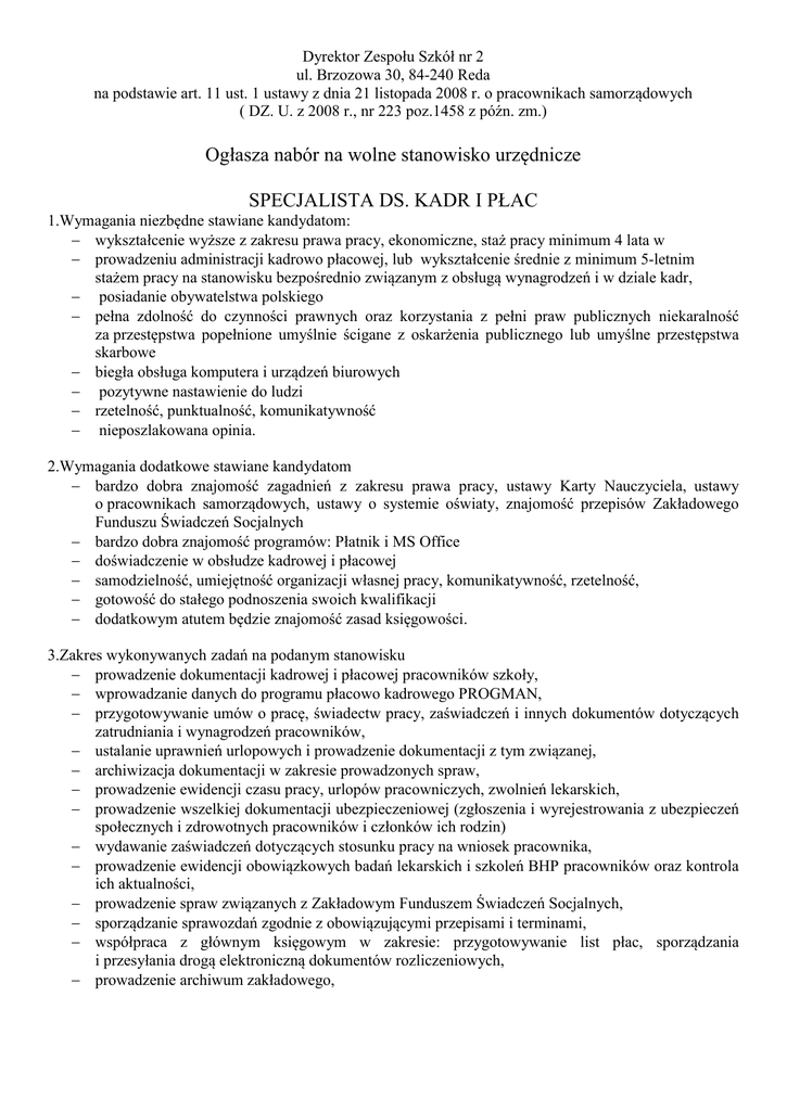 Dyrektor Zespołu Szkół nr 2 ul. Brzozowa 30, 84-240 Reda na podstawie art. 11 ust. 1 ustawy z dnia 21 listopada 2008 r. o pracownikach samorządowych ( DZ. U. z 2008 r., nr 223 poz.1458 z późn. zm.) Ogłasza nabór na wolne stanowisko urzędnicze SPECJALISTA DS. KADR I PŁAC 1.Wymagania niezbędne stawiane kandydatom: wykształcenie wyższe z zakresu prawa pracy, ekonomiczne, staż pracy minimum 4 lata w prowadzeniu administracji kadrowo płacowej, lub wykształcenie średnie z minimum 5-letnim stażem pracy na stanowisku bezpośrednio związanym z obsługą wynagrodzeń i w dziale kadr, posiadanie obywatelstwa polskiego pełna zdolność do czynności prawnych oraz korzystania z pełni praw publicznych niekaralność za przestępstwa popełnione umyślnie ścigane z oskarżenia publicznego lub umyślne przestępstwa skarbowe biegła obsługa komputera i urządzeń biurowych pozytywne nastawienie do ludzi rzetelność, punktualność, komunikatywność nieposzlakowana opinia. 2.Wymagania dodatkowe stawiane kandydatom bardzo dobra znajomość zagadnień z zakresu prawa pracy, ustawy Karty Nauczyciela, ustawy o pracownikach samorządowych, ustawy o systemie oświaty, znajomość przepisów Zakładowego Funduszu Świadczeń Socjalnych bardzo dobra znajomość programów: Płatnik i MS Office doświadczenie w obsłudze kadrowej i płacowej samodzielność, umiejętność organizacji własnej pracy, komunikatywność, rzetelność, gotowość do stałego podnoszenia swoich kwalifikacji dodatkowym atutem będzie znajomość zasad księgowości. 3.Zakres wykonywanych zadań na podanym stanowisku prowadzenie dokumentacji kadrowej i płacowej pracowników szkoły, wprowadzanie danych do programu płacowo kadrowego PROGMAN, przygotowywanie umów o pracę, świadectw pracy, zaświadczeń i innych dokumentów dotyczących zatrudniania i wynagrodzeń pracowników, ustalanie uprawnień urlopowych i prowadzenie dokumentacji z tym związanej, archiwizacja dokumentacji w zakresie prowadzonych spraw, prowadzenie ewidencji czasu pracy, urlopów pracowniczych, zwolnień lekarskich, prowadzenie wszelkiej dokumentacji ubezpieczeniowej (zgłoszenia i wyrejestrowania z ubezpieczeń społecznych i zdrowotnych pracowników i członków ich rodzin) wydawanie zaświadczeń dotyczących stosunku pracy na wniosek pracownika, prowadzenie ewidencji obowiązkowych badań lekarskich i szkoleń BHP pracowników oraz kontrola ich aktualności, prowadzenie spraw związanych z Zakładowym Funduszem Świadczeń Socjalnych, sporządzanie sprawozdań zgodnie z obowiązującymi przepisami i terminami, współpraca z głównym księgowym w zakresie: przygotowywanie list płac, sporządzania i przesyłania drogą elektroniczną dokumentów rozliczeniowych, prowadzenie archiwum zakładowego, 4. Informacja o warunkach pracy na stanowisku: Miejsce pracy: Praca w budynku Zespołu Szkół nr 2 w Redzie ul. Brzozowa 30. Wymiar czasu pracy: 40 godzin tygodniowo Zatrudnienie od 01.01.2016r. Stanowisko pracy związane jest z ponad czterogodzinnym czasem pracy przy komputerze, obsługą urządzeń biurowych, prowadzeniem rozmów telefonicznych, obsługą klientów wewnętrznych i sporadyczną zewnętrznych, przemieszczaniem się wewnątrz budynku. 5.Wymagane dokumenty aplikacyjne list motywacyjny CV kserokopie dokumentów potwierdzających wymagane kwalifikacje oraz staż pracy kserokopie dokumentów potwierdzających dodatkowe wykształcenie (dyplomy, świadectwa) kwestionariusz osobowy dla osoby ubiegającej się o zatrudnienie oświadczenie kandydata o niekaralności za przestępstwa popełnione umyślne ścigane z oskarżenia publicznego lub umyślne przestępstwa skarbowe (w przypadku zatrudnienia kandydat zobowiązany zostaje do dostarczenia zaświadczenia z Krajowego Rejestru Karnego) oświadczenie o pełnej zdolności do czynności prawnych i korzystaniu z pełni prac publicznych oraz o nieposzlakowanej opinii, oświadczenie o stanie zdrowia kandydata pozwalającym na zatrudnienie na stanowisku urzędniczym oryginały lub kopie referencji, o ile kandydat posiada. 6. Wskaźnik zatrudnienia osób niepełnosprawnych w szkole, w rozumieniu przepisów o rehabilitacji zawodowej i społecznej oraz zatrudnienia osób niepełnosprawnych, w miesiącu poprzedzającym upublicznienie ogłoszenia przekroczył 6 %. Wymagane dokumenty aplikacyjne składa się w zaklejonych i opisanych kopertach : „Nabór na stanowisko specjalista ds. kadr i płac’’ w sekretariacie Zespołu Szkół nr 2 w Redzie, ul. Brzozowa 30. Dokumenty należy składać do dnia 12.11.2015r. Aplikacje, które wpłyną po określonym terminie nie będą rozpatrywane. Dyrektor Zespołu Szkół nr 2 w Redzie zaprosi telefonicznie kandydatów wybranych spośród złożonych ofert na rozmowy kwalifikacyjne. Informacja o wynikach naboru będzie umieszczona w BIP Urząd Miasta Reda oraz na tablicy ogłoszeń w szkole. Kwestionariusz oraz Oświadczenie znajdują się na stronie internetowej szkoły lub można go nabyć w sekretariacie Zespołu Szkół nr 2 w Redzie ul. Brzozowa 30. Regulamin naboru na wolne stanowiska urzędnicze w Zespole Szkół nr 2 w Redzie jest dostępny na stronie www.zs2.reda.pl . Dokumenty aplikacyjne: list motywacyjny, CV powinny być opatrzone klauzulą; „Wyrażam zgodę na przetwarzanie moich danych osobowych zawartych w ofercie pracy dla potrzeb niezbędnych do realizacji procesu naboru zgodnie z ustawą z dnia 20 sierpnia 1997 r. o ochronie danych osobowych (Dz.U t.j. z 2014 r. poz. 1182) oraz ustawą z dnia 21 listopada 2008 r. o pracownikach samorządowych (t.j Dz. U z 2014 r. poz. 1202 ze zm.) z własnoręcznym podpisem. Reda, dnia 02.11.2015r. ……………………………. (nazwisko lub funkcja, podpis)