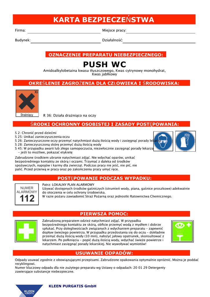 KARTA BEZPIECZEŃSTWA Firma: Miejsce pracy: Budynek: Działalność: OZNACZENIE PREPARATU NIEBEZPIECZNEGO: PUSH WC Amidoalkylobetaina kwasu tłuszczowego, Kwas cytrynowy monohydrat, Kwas jabłkowy OKREŚLENIE ZAGROŻENIA DLA CZŁOWIEKA I ŚRODOWISKA: R 36: Działa drażniąco na oczy ŚRODKI OCHRONNY OSOBISTEJ I ZASADY POSTĘPOWANIA: S S S S S 2: Chronić przed dziećmi 25: Unikać zanieczyszczenia oczu 26: Zanieczyszczone oczy przemyć natychmiast dużą ilością wody i zasięgnąć porady lekarza 28: Zanieczyszczoną skórę przemyć dużą ilością wody 45: W przypadku awarii lub złego samopoczucia, niezwłocznie zasięgnąć porady lekarza – jeśli to możliwe, pokazać etykietę Zabrudzone środkiem ubranie natychmiast zdjąć. Nie wdychać oparów, unikać bezpośredniego kontaktu ze skórą i oczami. Trzymać z daleka od środków spożywczych, napojów i karmy dla zwierząt. Podczas pracy nie jeść, nie pić, nie palić. Przed przerwą w pracy oraz po zakończeniu pracy umyć ręce. POSTĘPOWANIE PODCZAS WYPADKU: Patrz: LOKALNY PLAN ALARMOWY Używać dostępnych środków gaśniczych (strumień wody, piana, gaśnice proszkowe) adekwatnie do otoczenia w celu ochrony środowiska. W razie pożaru zawiadomić Straż Pożarną oraz jednostki Ratownictwa Chemicznego. PIERWSZA POMOC: Zabrudzoną preparatem odzież natychmiast zdjąć. W przypadku bezpośredniego kontaktu ze skórą, obficie przemyć wodą z mydłem i dobrze spłukać. Przy dolegliwościach związanych z wdychaniem preparatu – zapewnić dopływ świeżego powietrza. W przypadku przedostania się do oczu – dokładnie przemyć dużą ilością wody (10 min), nałożyć jałowy opatrunek, skonsultować z lekarzem. Po połknięciu – popić dużą ilością wody, wdychać świeże powietrze i natychmiast zasięgnąć porady lekarskiej. Nie wywoływać wymiotów! USUWANIE ODPADÓW: Odpady usuwać zgodnie z obowiązującymi przepisami. Zabrudzone opakowania optymalnie opróżnić. Można je poddać recyklingowi. Numer kluczowy odpadu dla nie zużytego preparatu wg Ustawy o odpadach: 20 01 29 Detergenty zawierające substancje niebezpieczne. KLEEN PURGATIS GmbH Dystrybutor w Polsce: BONUS-CZYSTOŚĆ www.bonus-czystosc.pl tel. 509-824-134