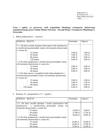 Załącznik Nr 1 do Uchwały Nr........... Rady Miasta Szczecin z dnia............... Ceny i opłaty za przewozy osób pojazdami lokalnego transportu zbiorowego organizowanego przez Gminę Miasto Szczecin - Zarząd Dróg i Transportu Miejskiego w Szczecinie. 1. Bilety jednorazowe – czasowe RODZAJ BILETU 1.1. Na linie zwykłe dzienne tramwajowe lub autobusowe z możliwością przesiadek ważny od momentu skasowania w czasie do : - 15 minut - 30 minut - 60 minut - 120 minut 1.2.Na linie pośpieszne z możliwością przesiadek ważny od momentu skasowania w czasie do : - 15 minut - 30 minut - 60 minut 1.3 Na linie nocne z wyjątkiem linii indywidualnych z możliwością przesiadek ważny od momentu skasowania w czasie do : - 15 minut - 30 minut - 60 minut - 120 minut Normalny Ulgowy 2,00 zł 3,00 zł 4,00 zł 6,00 zł 1,00 zł 1,50 zł 2,00 zł 3,00 zł 4,00 zł 6,00 zł 8,00 zł 2,00 zł 3,00 zł 4,00 zł 2,00 zł 3,00 zł 4,00 zł 6,00 zł 1,00 zł 1,50 zł 2,00 zł 3,00 zł 2. Karnety 10 - przejazdowe ( 9 + 1 gratis ) RODZAJ BILETU 2.1. Na linie zwykłe dzienne i nocne tramwajowe lub autobusowe z możliwością przesiadek ważny od momentu skasowania w czasie do: - 15 minut - 30 minut - 60 minut 2.2.Na linie pośpieszne z możliwością przesiadek ważny od momentu skasowania w czasie do : - 15 minut - 30 minut - 60 minut Normalny Ulgowy 18,00 zł 27,00 zł 36,00 zł 9,00 zł 13,50 zł 18,00 zł 36,00 zł 54,00 zł 72,00 zł 18,00 zł 27,00 zł 36,00 zł 3. Bilety dobowe i wielodobowe - sieciowe na okaziciela Na wszystkie linie: zwykłe, pośpieszne, nocne z wyjątkiem linii indywidualnych OKRES WAŻNOŚCI 1. 24 godziny od skasowania (dobowy) 2. 5-cio dobowy 3. 10-cio dobowy Normalny Ulgowy 12,00 zł 35,00 zł 60,00 zł 6,00 zł 17,50 zł 30,00 zł 4. Bilety miesięczne Rodzaj biletu 4.1. Imienny na 1 linię zwykłą dzienną. 4.2. Imienny sieciowy na linie zwykłe dzienne i nocne. 4.3. Imienny na 1 linię pośpieszną 4.4.Imienny sieciowy na wszystkie linie: dzienne, pośpieszne, nocne z wyj. indywidualnych. 4.5. Sieciowy na okaziciela na wszystkie linie. Normalny Ulgowy 70,00 zł 35,00 zł 100,00 zł 106,00 zł 50,00 zł 53,00 zł 162,00 zł 81,00 zł 170,00 zł 5. Bilety 3 miesięczne Rodzaj biletu Normalny Ulgowy 5.1. Imienny na 1 linię zwykłą dzienną. 5.2. Imienny sieciowy na linie zwykłe dzienne i nocne. 5.3. Imienny na 1 linię pośpieszną. 5.4.Imienny sieciowy na wszystkie linie: dzienne. pośpieszne, nocne z wyjątkiem indywidualnych. 182,00 zł 91,00 zł 260,00 zł 276,00 zł 130,00 zł 138,00 zł 422,00 zł 211,00 zł 6. Bilety okresowe semestralne – wyłącznie dla uprawnionych do ulg uczniów i studentów. Rodzaj biletu 6.1. Imienny na 1 linię zwykłą dzienną. 6.2. Imienny sieciowy na linie zwykłe dzienne i nocne. 6.3. Imienny na 1 linię pośpieszną. 6.4.Imienny sieciowy na wszystkie linie: dzienne. pośpieszne, nocne z wyjątkiem indywidualnych. Czteromiesięczne Pięciomiesięczne 119,00 zł 147,00 zł 170,00 zł 180,00 zł 210,00 zł 223,00 zł 275,00 zł 340,00 zł 7. Bilet seniora – obowiązuje dla osób od ukończenia 68 do 70 roku życia. - 6-miesięczny – 60,00 zł - 12-miesięczny – 100,00 zł 8. Bilety rodzinne weekendowe – jednodniowe ważny na wszystkich liniach dziennych, z wyjątkiem linii turystycznych, w soboty, niedziele i święta dla obojga lub jednego rodzica ( lub opiekuna prawnego) z co najmniej 1 dzieckiem do lat 16 - 14,00 zł. 9. Bilety grupowe – ważne do 1 godziny od skasowania dla grup uprawnionych do ulgi i ich opiekunów: 1) do 15 osób + 1 opiekun - 18,00 zł 2) do 25 osób + 2 opiekunów - 25,00 zł 10. Bilety turystyczne: 1) normalny 2) ulgowy – 3,50 zł – 2,50 zł