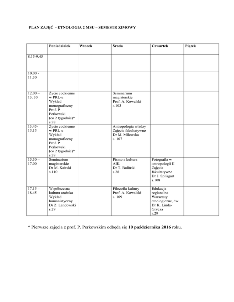 PLAN ZAJĘĆ - ETNOLOGIA 2 MSU – SEMESTR ZIMOWY Poniedziałek Wtorek Środa Czwartek 8.15-9.45 10.00 11.30 12.00 – 13. 30 13.4515.15 15.30 – 17.00 17.15 – 18.45 Życie codzienne w PRL-u Wykład monograficzny Prof. P Perkowski (co 2 tygodnie)* s.28 Życie codzienne w PRL-u Wykład monograficzny Prof. P Perkowski (co 2 tygodnie)* s.28 Seminarium magisterskie Dr M. Kairski s.110 Seminarium magisterskie Prof. A. Kowalski s.103 Pismo a kultura AIK Dr T. Buliński s.28 Fotografia w antropologii II Zajęcia fakultatywne Dr J. Splisgart s.108 Współczesna kultura arabska Wykład humanistyczny Dr Z. Landowski s.29 Filozofia kultury Prof. A. Kowalski s. 109 Edukacja regionalna Warsztaty etnologiczne, ćw. Dr K. LindaGrycza s.29 Antropologia władzy Zajęcia fakultatywne Dr M. Milewska s. 107 * Pierwsze zajęcia z prof. P. Perkowskim odbędą się 10 października 2016 roku. Piątek