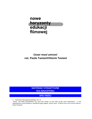 Cezar musi umrzeć reż. Paolo TavianiVittorio Taviani MATERIAŁY DYDAKTYCZNE DLA NAUCZYCIELI SPIS TREŚCI 1. Scenariusz lekcji języka polskiego. (str. 2) Temat: „Od kiedy dowiedziałem się, czym jest sztuka, ta cela stała się dla mnie więzieniem” – o sile oddziaływania sztuki Szekspira i aktualności jego tragedii „Juliusz Cezar” w filmie Cezar musi umrzeć Vittorio i Paolo Tavianich. SCENARIUSZ LEKCJI JĘZYKA POLSKIEGO Opracowała: Małgorzata Wiśniewska Temat: „Od kiedy dowiedziałem się, czym jest sztuka, ta cela stała się dla mnie więzieniem” – o sile oddziaływania sztuki Szekspira i aktualności jego tragedii „Juliusz Cezar” w filmie Cezar musi umrzeć Vittorio i Paolo Tavianich. CELE LEKCJI: Po lekcji uczeń powinien: znać sylwetkę Juliusz Cezara i tematykę tragedii Szekspira „Juliusz Cezar”; rozumieć mechanizmy adaptacji teatralno-filmowej dzieła literackiego; charakteryzować koncept (pomysł inscenizacyjny) reżyserów, pracę aktorów nad tekstem oraz poetykę i strukturę filmu; dostrzegać oddziaływanie tekstu i wymowy sztuki na aktorów-więźniów; rozumieć funkcje sztuki; umieć funkcjonalnie korzystać z zasobów Internetu lub innych źródeł wiedzy. METODY I FORMY PRACY sporządzanie notatki w domu; pogadanka nauczyciela; prezentacja ucznia; burza mózgów; dyskusja problemowa; praca ze słownikiem, praca z tekstem filmowym; ŚRODKI DYDAKTYCZNE film Vittorio i Paolo Tavianich Cezar musi umrzeć Włochy 2012; William Szekspir, Juliusz Cezar, Kraków 2007; Allan Bloom, Szekspir i polityka, Kraków 1995; Słownik pojęć i tekstów kultury, pod redakcją Ewy Szczęsnej, WSiP, Warszawa 2002; www.imperiumromanum.edu.pl; recenzje ze stron: www.wyborcza.pl; www.dwutygodnik.com; www.rp.pl; www.filmweb.pl; Krzysztof Łapiński, Camorra wystawia Szekspira. O filmie „Cezar musi umrzeć” braci Taviani „Kultura Liberalna” nr 211 (4/2013) z 22 stycznia 2013 r. POJĘCIA KLUCZOWE: Wszelkie prawa do materiałów dydaktycznych zastrzeżone dla Stowarzyszenia Nowe Horyzonty 2 paradokument adaptacja teatralna intertekstualność świadomość tragiczna CZAS 2 lekcje PRZEBIEG LEKCJI 1. Kim był Juliusz Cezar? – sprawdzanie pracy domowej Młodzież miała za zadanie przygotować przed pokazem notatkę o Juliuszu Cezarze, ze zwróceniem szczególnej uwagi na okoliczności jego śmierci, np.: Gajusz Juliusz Cezar (12 lipca 100 - 15 marca 44 p.n.e.) Jeden z członków stronnictwa popularów w Rzymie, które forsowało projekty zmian w państwie. Piastował kolejno urzędy kwestora, edyla, pretora, konsula i dyktatora. Sławę zdobył dzięki namiestnictwu w Galii. Pomoc żołnierzy pozwoliła mu na pokonanie opozycji, skupionej wokół senatu i Pompejusza, i przejęcie władzy w Rzymie. Cezar przeprowadził liczne reformy, mające podnieść państwo z anarchii i wojen. Został jedynowładcą Rzymu, a Senat stał się instytucją fasadową, ponieważ przewagę uzyskali w nim jego zwolennicy. W odróżnieniu od poprzedników Cezar nie mordował ani nie skazywał na banicję swoich przeciwników, głosząc zasadę „łagodności rządów”. Nie mścił się na swych dawnych przeciwnikach politycznych, cofając nawet konfiskaty majątków. Mimo to został szybko znienawidzony przez starą arystokrację za okazywanie niemal całkowitej pogardy dla starych instytucji republikańskich. Po rozgromieniu armii synów Pompejusza, wrócił do stolicy Imperium jako niekwestionowany władca. 14 lutego 44 roku p.n.e. Senat obwołał Cezara dyktatorem wieczystym (dictator in perpetuum), najwyższym kapłanem, imperatorem i „ojcem ojczyzny”. Próbowano go obwołać królem Rzymu, ale Cezar odmówił, gdyż nadal starał się zachowywać pozory republikańskiej legalności.Wówczas ma czele opozycji wobec Cezara stanął Gajusz Kasjusz Longinus i Marek Juniusz Brutus. Byli oni związani wcześniej z obozem Pompejusza, po klęsce pod Farsalos poddali się Cezarowi, nadal jednak głosili wobec niego swoją niechęć. Cezara ostrzegano przed zamachem na jego życie, jednak dyktator lekceważył przepowiednie wróżbitów i ostrzeżenia żony, która w dniu, kiedy zamordowano władcę, miała zły sen. Oto opis zabójstwa: „Na ostatnim posiedzeniu senatu 15 marca 44 roku p.n.e. w dniu id marcowych, Cezar zajął miejsce na złoconym krześle. Podszedł do niego Tulliusz Cymber, prosząc o łaskę dla wygnanego brata, a za nim zaczęli podchodzić inni wtajemniczeni. Cezar rozdrażniony tą natarczywością próbował wstać, ale wtedy Cymber ściągnął mu togę, co miało być umówionym znakiem dla wszystkich do ataku. Pierwszy cios zadał Publiusz Serwiliusz Kaska, jednak uderzenie było za słabe. Cezar odpłacił się mu ciosem w ramię, jednak wtedy posypały się na niego, wedle tradycji, 23 ciosy zadane sztyletami. Ostatni cios, zadany ręką Brutusa, którego Cezar uważał za przyjaciela, okazał się śmiertelny. W chwili jego zadawania, Cezar miał Wszelkie prawa do materiałów dydaktycznych zastrzeżone dla Stowarzyszenia Nowe Horyzonty 3 wyszeptać: „I ty, Brutusie, przeciw mnie?” (Et tu, Brute, contra me?). Jak się później okazało Cezar w swym testamencie ustanowił swoim spadkobiercą Oktawiana, wnuka jego córki, Julii. 2. W jaki sposób Szekspir ukazał sylwetkę Juliusza Cezara w swoim dramacie? – pogadanka nauczyciela/prezentacja ustna wybranego ucznia Szekspir skupił się na spisku na życie Cezara, ukazując przy tej okazji nieposkromioną żądzę władzy, której ulega wybitny wódz i bohater. Szekspir portretuje człowieka samotnego, nieufnego, zmagającego się z własnymi słabościami, który nie chce utracić swej pozycji, ale też nie czuje się szczęśliwy. Tragizm dotyczy też drugiej ważnej postaci tragedii, czyli Brutusa. Namówiony przez Kasjusza, który potrzebuje jego autorytetu i szacunku, jakim cieszy się w Rzymie, przystępuje do spisku, wiedziony szlachetnymi intencjami – obroną zagrożonych prz