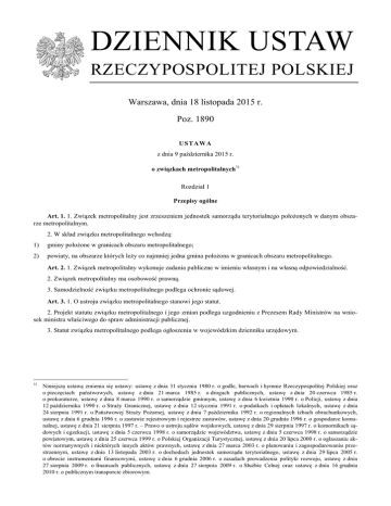 DZIENNIK USTAW RZECZYPOSPOLITEJ POLSKIEJ Warszawa, dnia 18 listopada 2015 r. Poz. 1890 US T AW A z dnia 9 października 2015 r. o związkach metropolitalnych1) Rozdział 1 Przepisy ogólne Art. 1. 1. Związek metropolitalny jest zrzeszeniem jednostek samorządu terytorialnego położonych w danym obszarze metropolitalnym. 2. W skład związku metropolitalnego wchodzą: 1) gminy położone w granicach obszaru metropolitalnego; 2) powiaty, na obszarze których leży co najmniej jedna gmina położona w granicach obszaru metropolitalnego. Art. 2. 1. Związek metropolitalny wykonuje zadania publiczne w imieniu własnym i na własną odpowiedzialność. 2. Związek metropolitalny ma osobowość prawną. 3. Samodzielność związku metropolitalnego podlega ochronie sądowej. Art. 3. 1. O ustroju związku metropolitalnego stanowi jego statut. 2. Projekt statutu związku metropolitalnego i jego zmian podlega uzgodnieniu z Prezesem Rady Ministrów na wniosek ministra właściwego do spraw administracji publicznej. 3. Statut związku metropolitalnego podlega ogłoszeniu w wojewódzkim dzienniku urzędowym. 1) Niniejszą ustawą zmienia się ustawy: ustawę z dnia 31 stycznia 1980 r. o godle, barwach i hymnie Rzeczypospolitej Polskiej oraz o pieczęciach państwowych, ustawę z dnia 21 marca 1985 r. o drogach publicznych, ustawę z dnia 20 czerwca 1985 r. o prokuraturze, ustawę z dnia 8 marca 1990 r. o samorządzie gminnym, ustawę z dnia 6 kwietnia 1990 r. o Policji, ustawę z dnia 12 października 1990 r. o Straży Granicznej, ustawę z dnia 12 stycznia 1991 r. o podatkach i opłatach lokalnych, ustawę z dnia 24 sierpnia 1991 r. o Państwowej Straży Pożarnej, ustawę z dnia 7 października 1992 r. o regionalnych izbach obrachunkowych, ustawę z dnia 6 grudnia 1996 r. o zastawie rejestrowym i rejestrze zastawów, ustawę z dnia 20 grudnia 1996 r. o gospodarce komunalnej, ustawę z dnia 21 sierpnia 1997 r. – Prawo o ustroju sądów wojskowych, ustawę z dnia 29 sierpnia 1997 r. o komornikach sądowych i egzekucji, ustawę z dnia 5 czerwca 1998 r. o samorządzie województwa, ustawę z dnia 5 czerwca 1998 r. o samorządzie powiatowym, ustawę z dnia 25 czerwca 1999 r. o Polskiej Organizacji Turystycznej, ustawę z dnia 20 lipca 2000 r. o ogłaszaniu aktów normatywnych i niektórych innych aktów prawnych, ustawę z dnia 27 marca 2003 r. o planowaniu i zagospodarowaniu przestrzennym, ustawę z dnia 13 listopada 2003 r. o dochodach jednostek samorządu terytorialnego, ustawę z dnia 29 lipca 2005 r. o obrocie instrumentami finansowymi, ustawę z dnia 6 grudnia 2006 r. o zasadach prowadzenia polityki rozwoju, ustawę z dnia 27 sierpnia 2009 r. o finansach publicznych, ustawę z dnia 27 sierpnia 2009 r. o Służbie Celnej oraz ustawę z dnia 16 grudnia 2010 r. o publicznym transporcie zbiorowym. Dziennik Ustaw –2– Poz. 1890 Rozdział 2 Tworzenie związków metropolitalnych Art. 4. 1. Rada Ministrów w drodze rozporządzenia: 1) ustala granice poszczególnych obszarów metropolitalnych na potrzeby tworzenia związków metropolitalnych przez wskazanie gmin wchodzących w skład obszarów metropolitalnych; 2) tworzy w poszczególnych obszarach metropolitalnych związki metropolitalne, ustalając jednocześnie ich nazwy. 2. Wydając rozporządzenia, o których mowa w ust. 1, Rada Ministrów uwzględnia: 1) koncepcję przestrzennego zagospodarowania kraju oraz plan zagospodarowania przestrzennego województwa; 2) powiązania funkcjonalne oraz zaawansowanie procesów urbanizacyjnych; 3) jednorodność układu osadniczego i przestrzennego, uwzględniającego więzi społeczne, gospodarcze i kulturowe. Art. 5. Za obszar metropolitalny w rozumieniu ustawy uznaje się spójną pod względem przestrzennym strefę oddziaływania miasta będącego siedzibą wojewody lub sejmiku województwa, chrakteryzującą się istnieniem silnych powiązań funkcjonalnych oraz zaawansowaniem procesów urbanizacyjnych, zamieszkałą przez co najmniej 500 000 mieszkańców. Art. 6. 1. Rozporządzenie, o którym mowa w art. 4 ust. 1 pkt 2, może zostać wydane także na wniosek rady gminy położonej w granicach obszaru metropolitalnego. 2. Do wniosku, o którym mowa w ust. 1, dołącza się uzasadnienie oraz niezbędne dokumenty, w tym mapy. 3. Rada Ministrów określi, w drodze rozporządzenia, tryb postępowania w sprawie składania wniosku, o którym mowa w ust. 1, oraz zakres dokumentów, które należy dołączyć do wniosku, uwzględniając terminy wynikające z ustawy, sprawność postępowania oraz konieczność udokumentowania istotnych dla rozstrzygnięcia wniosku okoliczności oraz przesłanek. Art. 7. 1. Wydanie rozporządzenia, o którym mowa w art. 4 ust. 1 pkt 2, wymaga zasięgnięcia opinii: 1) rad gmin położonych w granicach obszaru metropolitalnego poprzedzonych przeprowadzeniem konsultacji z mieszkańcami; 2) rad powiatów, na obszarze których leży co najmniej jedna gmina położona w granicach obszaru metropolitalnego; 3) sejmiku województwa; 4) wojewody. 2. W przypadku niewyrażenia opinii, o której mowa w ust. 1, w terminie 3 miesięcy od dnia otrzymania wystąpienia o opinię, wymóg zasięgnięcia opinii uznaje się za spełniony. 3. W przypadku nieprzeprowadzenia konsultacji, o których mowa w ust. 1 pkt 1, w terminie 3 miesięcy od dnia otrzymania wystąpienia o przeprowadzenie konsultacji, wymóg przeprowadzenia konsultacji uznaje się za spełniony. 4. Wydanie rozporządzenia, o którym mowa w art. 4 ust. 1 pkt 2, wymaga pozytywnej opinii: 1) rad co najmniej 70% miast na prawach powiatu położonych w granicach obszaru metropolitalnego; 2) rad co najmniej 70% gmin niemających statusu miasta na prawach powiatu położonych w granicach obszaru metropolitalnego; 3) rad co najmniej 50% powiatów, na obszarze których leży co najmniej jedna gmina położona w granicach obszaru metropolitalnego. Art. 8. 1. Rozporządzenie, o którym mowa w art. 4 ust. 1 pkt 2, jest wydawane nie później ni