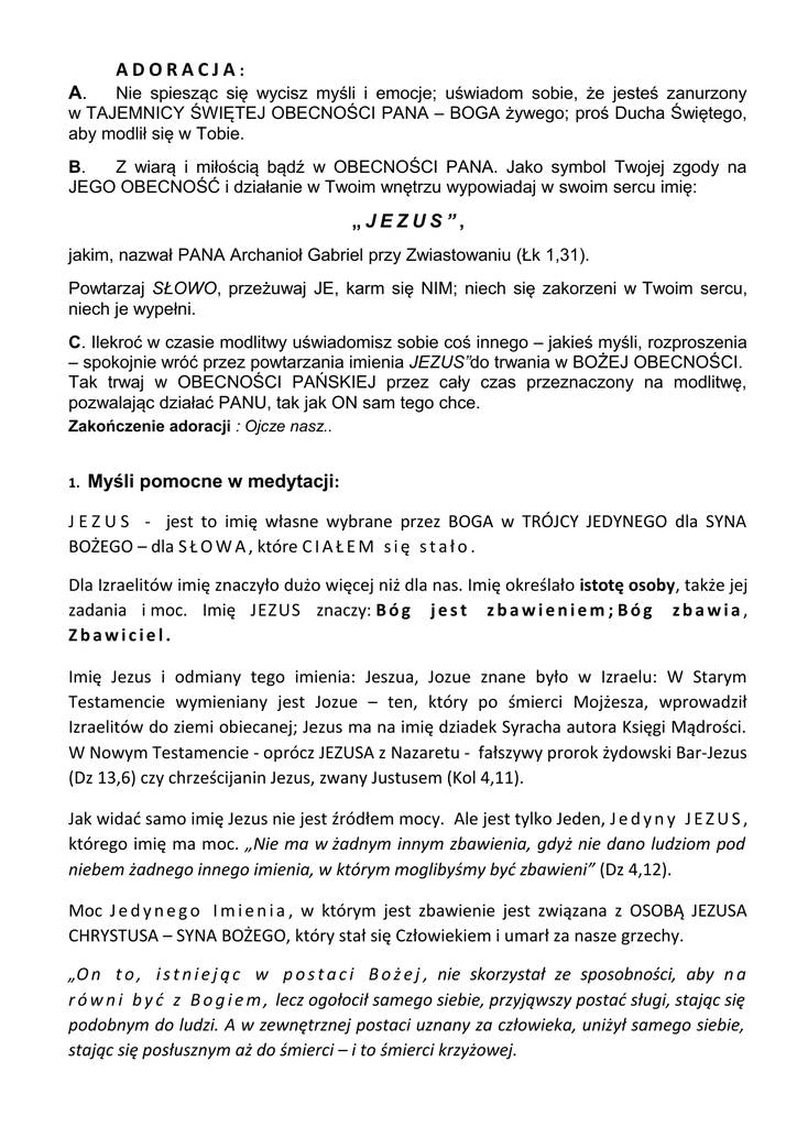 ADORACJA: A. Nie spiesząc się wycisz myśli i emocje; uświadom sobie, że jesteś zanurzony w TAJEMNICY ŚWIĘTEJ OBECNOŚCI PANA – BOGA żywego; proś Ducha Świętego, aby modlił się w Tobie. B. Z wiarą i miłością bądź w OBECNOŚCI PANA. Jako symbol Twojej zgody na JEGO OBECNOŚĆ i działanie w Twoim wnętrzu wypowiadaj w swoim sercu imię: „JEZUS”, jakim, nazwał PANA Archanioł Gabriel przy Zwiastowaniu (Łk 1,31). Powtarzaj SŁOWO, przeżuwaj JE, karm się NIM; niech się zakorzeni w Twoim sercu, niech je wypełni. C. Ilekroć w czasie modlitwy uświadomisz sobie coś innego – jakieś myśli, rozproszenia – spokojnie wróć przez powtarzania imienia JEZUS”do trwania w BOŻEJ OBECNOŚCI. Tak trwaj w OBECNOŚCI PAŃSKIEJ przez cały czas przeznaczony na modlitwę, pozwalając działać PANU, tak jak ON sam tego chce. Zakończenie adoracji : Ojcze nasz.. 1. Myśli pomocne w medytacji: J E Z U S - jest to imię własne wybrane przez BOGA w TRÓJCY JEDYNEGO dla SYNA BOŻEGO – dla S Ł O W A , które C I A Ł E M s i ę s t a ł o . Dla Izraelitów imię znaczyło dużo więcej niż dla nas. Imię określało istotę osoby, także jej zadania i moc. Imię JEZUS znaczy: B ó g j e s t z b a w i e n i e m ; B ó g z b a w i a , Zbawiciel. Imię Jezus i odmiany tego imienia: Jeszua, Jozue znane było w Izraelu: W Starym Testamencie wymieniany jest Jozue – ten, który po śmierci Mojżesza, wprowadził Izraelitów do ziemi obiecanej; Jezus ma na imię dziadek Syracha autora Księgi Mądrości. W Nowym Testamencie - oprócz JEZUSA z Nazaretu - fałszywy prorok żydowski Bar-Jezus (Dz 13,6) czy chrześcijanin Jezus, zwany Justusem (Kol 4,11). Jak widać samo imię Jezus nie jest źródłem mocy. Ale jest tylko Jeden, J e d y n y J E Z U S , którego imię ma moc. „Nie ma w żadnym innym zbawienia, gdyż nie dano ludziom pod niebem żadnego innego imienia, w którym moglibyśmy być zbawieni” (Dz 4,12). Moc J e d y n e g o I m i e n i a , w którym jest zbawienie jest związana z OSOBĄ JEZUSA CHRYSTUSA – SYNA BOŻEGO, który stał się Człowiekiem i umarł za nasze grzechy. „O n t o , i s t n i e j ą c w p o s t a c i B o ż e j , nie skorzystał ze sposobności, aby n a r ó w n i b y ć z B o g i e m , lecz ogołocił samego siebie, przyjąwszy postać sługi, stając się podobnym do ludzi. A w zewnętrznej postaci uznany za człowieka, uniżył samego siebie, stając się posłusznym aż do śmierci – i to śmierci krzyżowej. Dlatego też B ó g G o n a d w s z y s t k o w y w y ż s z y ł i d a r o w a ł M u i m i ę p o n a d w s z e l k i e i m i ę , aby na i m i ę J e z u s a z g i ę ł o s i ę w s z e l k i e k o l a n o istot niebieskich i ziemskich, i podziemnych. I aby w s z e l k i j ę z y k w y z n a ł , ż e J e z u s C h r y s t u s jest P A N E M – ku chwale Boga Ojca” (Flp 2,6-11). J e z u s C h r y s t u s jest P A N E M - tak przetłumaczono z języka greckiego na język polski - jednak użyty tu tytuł <<P A N >> ma zupełnie inne znaczenie niż to do jakiego przywykliśmy. W języku greckim ten tytuł brzmi: <<K Y R I O S > > , i słowo to jest odpowiednikiem hebrajskiego słowa <<JAHWE>> – JESTEM, KTÓRY JESTEM - to znaczy, imienia jakim objawił się BÓG Mojżeszowi z krzaka ognistego. Izraelici, uważając, że imię JAHWE jest zbyt święte, aby je wymawiać, podczas czytania stosowali zastępcze formy Bożego Imienia w tym ADONAJ – PAN. K Y R I O S ( P A N ) – w Starym Testamencie przetłumaczonym z języka hebrajskiego na grecki (Septuaginta) - ten tytuł przysługuje jedynie BOGU. I KYRIOSEM, PANEM jest nazywany JEZUS z Nazaretu w Nowym Testamencie. Wymawiając Najświętsze Imię J E Z U S powinniśmy w sercu słyszeć to Imię w pełnym jego brzmieniu: JEZUS CHRYSTUS ZBAWICIEL PAN – K Y R I O S : BÓG z BOGA, SWIATŁOŚĆ ze ŚWIATŁOŚCI, zrodzony, a nie stworzony, współistotny OJCU. J E Z U S – N a j ś w i ę t s z e I m i ę J E Z U S ; prośmy Maryję, aby nauczyła nas wymawiać to I M I Ę z miłością, zadziwieniem, zachwytem nad tajemnicą niepojętej MIŁOŚCI BOGA, który tak umiłował świat, że Syna swego Jednorodzonego dał, aby każdy, kto w Niego wierzy nie zginął, ale miał życie wieczne (por. J 3,16). Prośmy Maryję, aby nauczyła nas kontemplować i adorować tajemnicę imienia JEZUS, tak, jak Ona to czyniła nosząc JEZUSA w swoim łonie przez 9 miesięcy; tak, jak to czyniła wychowując Dziecię JEZUS, towarzysząc PANU w życiu dorosłym i stojąc pod Jego krzyżem. Wzywanie tego Jedynego Imienia <<J E Z U S > > z wiarą jest źródłem błogosławieństwa i zbawienia wiecznego. Św. Paweł mówi do Rzymian: „Jeżeli więc ustami swoimi w y z n a s z , że J E Z U S jest P A N E M , i w sercu swoim u w i e r z y s z , że Bóg Go wskrzesił z martwych – osiągniesz zbawienie” (Rz 10,9). Sam JEZUS tak powiedział o swoim Imieniu: „Zaprawdę, zaprawdę powiadam wam: O cokolwiek byście prosili Ojca, da wam w imię moje. Do tej pory o nic nie prosiliście w imię moje: Proście, a otrzymacie, aby radość wasza była pełna" (J 16, 23-24). Prosić w imię JEZUSA, nie oznacza jedynie dodawania w każdej prośbie formuły <<w imię JEZUSA>>. Aby móc prosić w <<imię JEZUSA>> trzeba trwać w jedności z NIM, znać prawdę o NIM, ufać MU i podporządkowywać swoje intencje JEGO zamiarom.