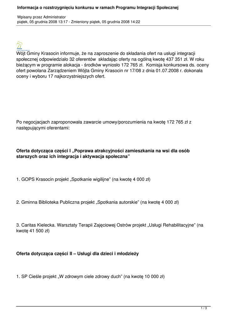 Informacja o rozstrzygnięciu konkursu w ramach Programu Integracji Społecznej Wpisany przez Administrator piątek, 05 grudnia 2008 13:17 - Zmieniony piątek, 05 grudnia 2008 14:22 Wójt Gminy Krasocin informuje, że na zaproszenie do składania ofert na usługi integracji społecznej odpowiedziało 32 oferentów składając oferty na ogólną kwotę 437 351 zł. W roku bieżącym w programie alokacja - środków wyniosło 172 765 zł. Komisja konkursowa ds. oceny ofert powołana Zarządzeniem Wójta Gminy Krasocin nr 17/08 z dnia 01.07.2008 r. dokonała oceny i wyboru 17 najkorzystniejszych ofert. Po negocjacjach zaproponowała zawarcie umowy/porozumienia na kwotę 172 765 zł z następującymi oferentami: Oferta dotycząca części I „Poprawa atrakcyjności zamieszkania na wsi dla osób starszych oraz ich integracja i aktywacja społeczna” 1. GOPS Krasocin projekt „Spotkanie wigilijne” (na kwotę 4 000 zł) 2. Gminna Biblioteka Publiczna projekt „Spotkania autorskie” (na kwotę 4 000 zł) 3. Caritas Kielecka. Warsztaty Terapii Zajęciowej Ostrów projekt „Usługi Rehabilitacyjne” (na kwotę 41 500 zł) Oferta dotycząca części II – Usługi dla dzieci i młodzieży 1. SP Cieśle projekt „W zdrowym ciele zdrowy duch” (na kwotę 10 000 zł) 1/3 Informacja o rozstrzygnięciu konkursu w ramach Programu Integracji Społecznej Wpisany przez Administrator piątek, 05 grudnia 2008 13:17 - Zmieniony piątek, 05 grudnia 2008 14:22 2. OSP Cieśle projekt „Organizacja świetlic środowiskowych” (na kwotę 23 200 zł) 3. OSP Krasocin poszerzenie działalności grupy młodzieżowej majoretek oraz adeptów muzyki (na kwotę 10 000 zł) 4. ZPO Bukowa projekt „Turniej Rycerski” (na kwotę 8 503 zł) 5. ZPO Bukowa projekt „Leśne Skrzaty” (na kwotę 4 530 zł) 6. ZPO Bukowa projekt „Ekonomia w szkolnej ławie” (na kwotę 2 580 zł) 7. SP Mieczyn projekt „Wyzwól w sobie inwencję twórczą” (na kwotę 11 000 zł) 8. ZPO Oleszno projekt „Odkrywajmy swoją małą ojczyznę” (na kwotę 12 687 zł) Oferta dotycząca części III – Usługi dla rodzin znajdujących się w trudnej sytuacji życiowej 1. ZPO Bukowa projekt „Równy start” (na kwotę 5 020 zł) 2. GOPS Krasocin "świetlica środowiskowa" (na kwotę 12 000 zł) 3. ZPO Krasocin "świetlica środowiskowa" (na kwotę 12 600 zł) 2/3 Informacja o rozstrzygnięciu konkursu w ramach Programu Integracji Społecznej Wpisany przez Administrator piątek, 05 grudnia 2008 13:17 - Zmieniony piątek, 05 grudnia 2008 14:22 4. Parafia Krasocin "odwiedzenie miejsc kultu religijnego" (na kwotę 3 820 zł) 5. Parafia Stojewsko "odwiedzenie miejsc kultu religijnego" (na kwotę 3 825 zł) 6. Koło Gospodyń Wiejskich w Krasocinie (na kwotę 3 500 zł) Powyższy program integracji społecznej będzie kontynuowany w 2009 roku z alokacją środków 342 952 zł i wszystkich zainteresowanych zapraszamy w roku przyszłym do składania ofert. 3/3