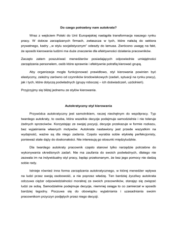 Do czego potrzebny nam autokrata? Wraz z wejściem Polski do Unii Europejskiej nastąpiła transformacja naszego rynku pracy. W dobrze zarządzanych firmach, zwłaszcza w tych, które naleŜą do sektora prywatnego, kadry ,,w stylu socjalistycznym” odeszły do lamusa. Zwrócono uwagę na fakt, Ŝe sposób kierowania ludźmi ma duŜe znaczenie dla efektywności działania pracowników. Zaczęto zatem poszukiwać menedŜerów posiadających odpowiednie umiejętności zarządzania personelem, osób które sprawnie i efektywnie potrafią kierować grupą. Aby organizacja mogła funkcjonować prawidłowo, styl kierowania powinien być elastyczny, zaleŜny zarówno od czynników środowiskowych (zadań, sytuacji na rynku pracy), jak i tych, które dotyczą podwładnych (grupy roboczej – ich doświadczeń, uzdolnień). Przyjrzyjmy się bliŜej jednemu ze stylów kierowania. Autokratyczny styl kierowania Przywódca autokratyczny jest samotnikiem, raczej niechętnym do współpracy. Typ twardego autokraty, to osoba, która wszelkie decyzje podejmuje samodzielnie i nie toleruje Ŝadnych sprzeciwów. Korzystając ze swojej pozycji, decyzje przekazuje w formie rozkazu, bez wyjaśniania własnych motywów. Autokrata nastawiony jest przede wszystkim na wydajność, waŜne są dla niego zadania. Często wyrabia sobie etykietę perfekcjonisty, poniewaŜ stale dąŜy do doskonałości. Nie interesują go stosunki międzyludzkie. Dla twardego autokraty pracownik często stanowi tylko narzędzie potrzebne do wykonywania określonych zadań. Nie ma zaufania do swoich podwładnych, dlatego nie zezwala im na indywidualny styl pracy, będąc przekonanym, Ŝe bez jego pomocy nie dadzą sobie rady. Istnieje równieŜ inna forma zarządzania autokratycznego, w której menedŜer wpływa na ludzi przez swoją osobowość, a nie poprzez władzę. Ten bardziej Ŝyczliwy autokrata odczuwa cięŜar odpowiedzialności moralnej za swoich pracowników, starając się związać ludzi ze sobą. Samodzielnie podejmuje decyzje, niemniej osiąga to co zamierzał w sposób bardziej łagodny. Poczuwa się do obowiązku wyjaśniania i uzasadniania swoim pracownikom przyczyn podjętych przez niego decyzji. W jakich sytuacjach sprawdza się autokratyczny styl zarządzania? Dyrektywny/autokratyczny styl zarządzania jest wręcz niezbędny w sytuacjach nagłych, kryzysowych, kiedy decyzje trzeba podjąć pod presją czasu. Przywódcy autorytarni preferowani są w słuŜbach mundurowych, np. świetnie sprawdzając się w czasie wojny oraz podczas katastrof czy klęsk Ŝywiołowych. Ten typ kierowania przydatny jest równieŜ w przedsiębiorstwach, w których jest niska kultura organizacyjna, gdzie brakuje porządku i dyscypliny. Poza tym, dyrektywność/autokratyzm zdejmuje odpowiedzialność z pracownika. Dlatego pomocna jest wtedy, gdy podwładny ma niskie kwalifikacje zawodowe oraz kiedy zadania są niejednoznaczne, poniewaŜ otrzymuje konkretne wskazówki dotyczące zadań, które ma wykonać. W takich sytuacjach, styl autokratyczny daje pracownikowi poczucie bezpieczeństwa, poniewaŜ jest bardzo przejrzysty – ściśle definiuje poŜądane zachowania, określa nagrody i kary oraz ocenia zachowania pracowników i przewiduje odpowiednie sankcje. Przywództwo autokratyczne jest więc bardzo przydatne na określony czas, aŜ do momentu ustabilizowania niepewnej sytuacji. W dłuŜszej perspektywie jest jednak skazane na poraŜkę. Nie zapewni firmie przyszłości. Brak współdziałania, otwartości i pełnej komunikacji moŜe spowodować rozbicie współpracującej ze sobą grupy. Joanna Bartoszek Zespół Samodzielnych Stanowisk ds. Psychologii Pracy w Głównym Inspektoracie Pracy