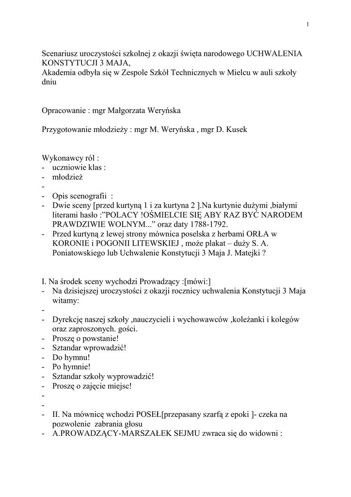 1 Scenariusz uroczystości szkolnej z okazji święta narodowego UCHWALENIA KONSTYTUCJI 3 MAJA, Akademia odbyła się w Zespole Szkół Technicznych w Mielcu w auli szkoły dniu Opracowanie : mgr Małgorzata Weryńska Przygotowanie młodzieŜy : mgr M. Weryńska , mgr D. Kusek Wykonawcy ról : - uczniowie klas : - młodzieŜ - Opis scenografii : - Dwie sceny [przed kurtyną 1 i za kurtyna 2 ].Na kurtynie duŜymi ,białymi literami hasło :”POLACY !OŚMIELCIE SIĘ ABY RAZ BYĆ NARODEM PRAWDZIWIE WOLNYM...” oraz daty 1788-1792. - Przed kurtyną z lewej strony mównica poselska z herbami ORŁA w KORONIE i POGONII LITEWSKIEJ , moŜe plakat – duŜy S. A. Poniatowskiego lub Uchwalenie Konstytucji 3 Maja J. Matejki ? I. Na środek sceny wychodzi Prowadzący :[mówi:] - Na dzisiejszej uroczystości z okazji rocznicy uchwalenia Konstytucji 3 Maja witamy: - Dyrekcję naszej szkoły ,nauczycieli i wychowawców ,koleŜanki i kolegów oraz zaproszonych. gości. - Proszę o powstanie! - Sztandar wprowadzić! - Do hymnu! - Po hymnie! - Sztandar szkoły wyprowadzić! - Proszę o zajęcie miejsc! - II. Na mównicę wchodzi POSEŁ[przepasany szarfą z epoki ]- czeka na pozwolenie zabrania głosu - A.PROWADZĄCY-MARSZAŁEK SEJMU zwraca się do widowni : 2 Jest rok 1791. Od trzech juŜ lat trwają nieprzerwanie obrady sejmu zwanego wielkim. Jako MARSZAŁKOWI przyszło mi w udziale to zaszczytne a zarazem odpowiedzialne stanowisko .W tej oto sali zgromadzili się przedstawiciele Rzeczypospolitej Szlacheckiej. Podzieleni na dwa wrogie sobie ugrupowania polityczne – postępowe stronnictwo patriotyczne i konserwatywne stronnictwo hetmańskie .RADZĄ – nad losami Rzeczypospolitej. Udzielam głosu reprezentantowi stronnictwa patriotycznego, by przedstawił racje oświeconych i postępowych umysłów Rzeczypospolitej : B. Poseł z mównicy : [na tle melodii „Hymnu do miłości ojczyzny „] POLACY! Ośmielcie się choć raz być narodem prawdziwie mądrym! Ojczyzna nasza potrzebuje pomocy :oświeconych patriotów ,którzy wyzwolą ją z głupoty zacofanych poglądów ,uzdrowią trawiony chorobą organizm . Zestarzały się juŜ podstawy ustrojowe Rzeczypospolitej : - wolna elekcja , zasada liberum veto ograniczają jej wolność , krępują moŜliwości rozwoju gospodarczego , osłabiają jej rolę na arenie międzynarodowej ; CzyŜ nie wystarczy Nam sroga poraŜka w postaci I rozbioru? Wyzwólmy się z wad i przywar ,które dowodzą jedynie ,Ŝe od XVII w .”wśród narodów wielu „przodujemy w pospolitej głupocie ,umacnianej przez umiłowanie anarchii i jakŜe pospolitej prywaty . Ojczyzna nasza wymaga lekarstwa w postaci zaprowadzenia DEMOKRATYCZNEJ USTAWY RZĄDOWEJ ; „POLACY! Miejcie odwagę ! Bądźcie mądrym narodem !. [spodziewane oklaski] III. Odśpiewanie „Hymnu do miłości ojczyzny „- przez chór lub nagranie . IV.PROWADZĄCY- MARSZAŁEK : ZbliŜał się MAJ !1791 .roku .Niebagatelną rolę w dorobku legistlacyjnym sejmu odegrały literatura i teatr narodowy , solidaryzujące się z dąŜeniami patriotów. 3 Oto bohaterowie i rozmowy [jakich wiele bywało wówczas na prowincji ]; wyczekujący aktualnych wiadomości o przebiegu obrad sejmowych : V. Odsłania się kurtyna .Na drugiej scenie – wnętrze dworku szlacheckiego z „Powrotu posła” J.U. Niemcewicza „ (skompilowane dialogi z aktu I i V) -stół na środku ,śniadanie –jak w utworze od słów : - PODKOMORZYNA : - Siadajmy proszę! - (siadają ,piją kawę –wszyscy ,wchodzi Jakub ,list dla Podkomorzyny) - STAROSTA : - Co wczoraj mówiłem , powtarzam dziś rano .Polska nigdy się z nikim łączyć nie powinna . Niech cicho siedzi ...a łączy się z Hiszpanią ,nawet z Ameryką . PODKOMORZY : - A to od mojego syna ![Posła !] Chwalebne ich prace ! ,ciesz się kochana Ŝono! PODKOMORZYNA : - Od dawna juŜ tęsknię! PODKOMORZY : - JA nie tęskniłem ,gdy zadośćczynił urzędowi ; - Dom zawsze ustępować powinien krajowi ... STAROSTA : - Niedługo się tym wszystkim będziemy cieszyli;; Bóg wie co porobiły sejmujące stany! Czy to źle było dotąd? Tak to Polak szczęśliwie Ŝył pod Augustami ! Człek jadł ,pił , nic nie robił ... Dziś ,zepsuli wszystko ...tknąć się śmieli okrutnicy liberum veto !,tej to wolności źrenicy![płacze]. - Przedtem jeden krzyknął „Nie pozwalam !...i uciekł na Pragę .! PODKOMORZY : 4 - Wskrzeszają mądrą wolność ,skracają swawole .ten to nierząd to sejmów zrywanie kraj zgubiło! Te zaboru ,Te srogich klęsk naszych przyczyną !. - Myśleliśmy o sobie ,a nigdy o kraju ; - Nowe pokolenia mądrzejsze! Powracają porządek i sławę OJCZYśNIE ! - Stokroć szczęśliwym ,Ŝe choć przy późnej siwiźnie ,ujrzę ,Ŝe polska rzadna i Ŝe powaŜana .Narody szybkim Pędem do upadku lecą ,lecz długo trzeba czekać zanim się oświecą .Dziś sława narodu i powaga wraca ,Będą jeszcze dla Polski dni świetne wrócone! STAROSTA: - Wszystko to ...Ja się na nic nie zgadzam! Zaraz protestuję ! A gdy zdanie waćpana sprzeczne z moim wszędzie – syn jego mojej córki pewnie mieć nie będzie!!! Wpada WALERY z radością , pada na kolana przed matką PODKOMORZY : - Synu mój !,patrząc na ciebie mam największy powód do wesela ,Ŝe w synu moim widzę juŜ obywatela ,Ŝe los ojczyzny – śmiałym działaniem mogliście ratować! - Obyśmy razem dzieląc pomyślne godziny , - między słodkim staraniem dla domu i rodziny - I tym , co się naleŜy własnemu krajowi ; - Cnotliwie wszyscy w zgodzie i jedności Ŝyli - I na szczęście Ojczyzny i dzieci patrzyli !!! WSZYSCY aktorzy trzymając się za ręce wychodzą na środek i w pas kłaniają się . VI . Odśpiewanie [chór ]lub odegranie pieśni „Witaj majowa Jutrzenko...”— aktorzy rozdają widowni[nauczycielom]teksty Konstytucji . VII .PROWADZĄACY ; - Uchwała ............................................................................................................................ ............ 5 - .........