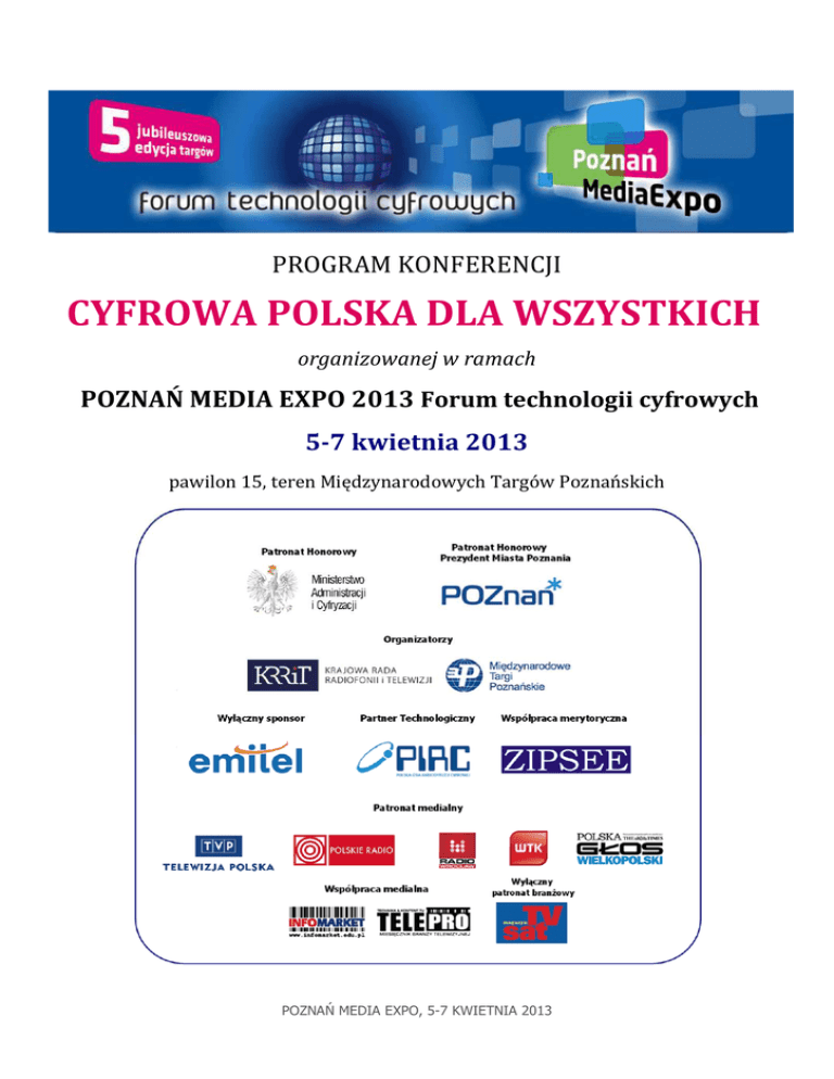 PROGRAM KONFERENCJI CYFROWA POLSKA DLA WSZYSTKICH organizowanej w ramach POZNAŃ MEDIA EXPO 2013 Forum technologii cyfrowych 5-7 kwietnia 2013 pawilon 15, teren Międzynarodowych Targów Poznańskich POZNAŃ MEDIA EXPO, 5-7 KWIETNIA 2013 Konferencja: Cyfrowa Polska dla Wszystkich DZIEŃ 1 5 kwietnia 2013 (piątek) 10:30 Oficjalne otwarcie Poznań Media Expo Powitanie gości: Wiceprezydent Poznania Prezes MTP Przewodniczący KRRiT Prezes PIRC Prezes EMITEL : Jerzy Stępień : dr Andrzej Byrt : Jan Dworak : Jacek Silski : Przemysław Kurczewski 11:00 – 13:30 Sesja I – Dostęp do telewizji dla osób niepełnosprawnych słowo wstępne i prowadzenie sesji: Krystyna Rosłan-Kuhn, ekspert KRRiT a) Przełamywanie barier w dostępie do telewizji dla niepełnosprawnych z perspektywy europejskiej Peter Olaf Looms (Dania), przewodniczący Grupy Celowej ITU-T: FG Audiovisual Media Accessibility b) Działania KRRiT na rzecz udostępniania telewizji osobom z dysfunkcją sensoryczną Ewa Murawska-Najmiec, ekspert w KRRiT c) Realizacja usług dostępowych dla osób niepełnosprawnych z perspektywy nadawcy – progi i bariery Zbigniew Kunecki, główny specjalista w Ośrodku iTVP-HD Telewizji Polskiej d) Czego oczekujemy od telewizji – punkt widzenia odbiorcy z niepełnosprawnością sensoryczną Agnieszka Grabowska, Zarząd Główny Polskiego Związku Głuchych Robert Więckowski, Forum Kultury bez Barier 13:30 – 15:00 Przerwa POZNAŃ MEDIA EXPO, 5-7 KWIETNIA 2013 15:00 – 17:30 Sesja II – Ostatni etap wdrażania DVB-T w Polsce i co dalej ? prowadzenie: Marcin Dąbrowski, z-ca dyrektora Ośrodka TVP Technologie a) Ocena procesu cyfryzacji z perspektywy KRRiT, perspektywy rozwoju i ew. zagrożenia Jan Dworak, przewodniczący KRRiT b) Ocena procesu przebiegu cyfryzacji z perspektywy Ministerstwa Administracji i Cyfryzacji, dalsze losy naziemnej telewizji cyfrowej w kontekście realizacji Europejskiej Agendy Cyfrowej Małgorzata Olszewska, podsekretarz stanu w Ministerstwie Administracji i Cyfryzacji c) DVB-T za pięć dwunasta – stan przygotowań gospodarstw domowych do przejścia na odbiór cyfrowy Dariusz Gumbrycht, Nielsen d) Wdrożenie DVB-T w Polsce – stan obecny, plany Piotr Siemieniec, dyrektor Biura Usług Radiowych i Telewizyjnych, EmiTel e) Dywidenda Cyfrowa 2 – czy będzie miejsce na dodatkowe multipleksy DVB-T? dr Dariusz Więcek, Instytut Łączności DZIEŃ 2 6 kwietnia 2013 (sobota) 10:00 Otwarcie dnia drugiego Prezes MTP : dr Andrzej Byrt Przewodniczący KRRiT : Jan Dworak Prezes PIRC : Jacek Silski 10:15 – 12:30 Sesja III – Telewizja przyszłości prowadzenie: EmiTel a) DVB-T – możliwości i problemy Marcin Dąbrowski, zastępca dyrektora Ośrodka TVP Technologie b) Regionalny System Ostrzegania – szybkość i dostępność Krzysztof Matlak, Ośrodek TVP Technologie c) Telewizja hybrydowa – nowe możliwości Marcin Wiśniewski, Ośrodek TVP Technologie d) Connected TV – czy taka telewizja jest nam potrzebna? Paweł Tutka, niezależny ekspert specjalizujący się w telewizji hybrydowej i Smart TV POZNAŃ MEDIA EXPO, 5-7 KWIETNIA 2013 e) Dolby Digital Plus - korzyści dla nadawców i odbiorców Iwona Kowalska, Dolby Laboratories f) Nowe usługi EmiTel Krzysztof Mądrzyk, kierownik ds. rozwoju produktów, EmiTel 12:30 – 14:00 Przerwa 14:00 - 17:30 Sesja IV – „Teraz radio” – Postscriptum słowo wstępne i prowadzenie: Krystyna Rosłan-Kuhn – ekspert KRRiT a) Radio cyfrowe w Niemczech – droga do sukcesu Michael Reichert, Futur Radio Project Manager SWR Niemcy b) Plany cyfryzacyjne Polskiego Radia SA Paweł Mathia, główny inżynier Polskiego Radia SA c) Sytuacja radia cyfrowego w Europie Mirosław Ostrowski, Radio Wrocław SA d) Informacje drogowe w radiu cyfrowym – system TPEG Piotr Bieniek, Mediamobile Nordic e) Prezentacja radia cyfrowego na żywo – „z profesjonalnym przewodnikiem” Mirosławem Ostrowskim DZIEŃ 3 7 kwietnia 2013 (niedziela) 11:00 Otwarcie dnia trzeciego Prezes MTP Prezes ZIPSEE : dr Andrzej Byrt : Michał Kanownik 11:10 – 14:00 a) Prywatny dozwolony użytek - pojęcie, zakres, prawa i obowiązki Tomasz Rudyk, DLA Piper b) Kto i za co płaci twórcom. Ile to kosztuje konsumenta? Michał Kanownik, ZIPSEE c) Ochrona prawno-autorska a postęp technologiczny d) Europejskie modele opłat prawno-autorskich w przyszłości Tomasz Rudyk, DLA Piper Program może ulec zmianie, stan na dzień 28 marca 2013 POZNAŃ MEDIA EXPO, 5-7 KWIETNIA 2013