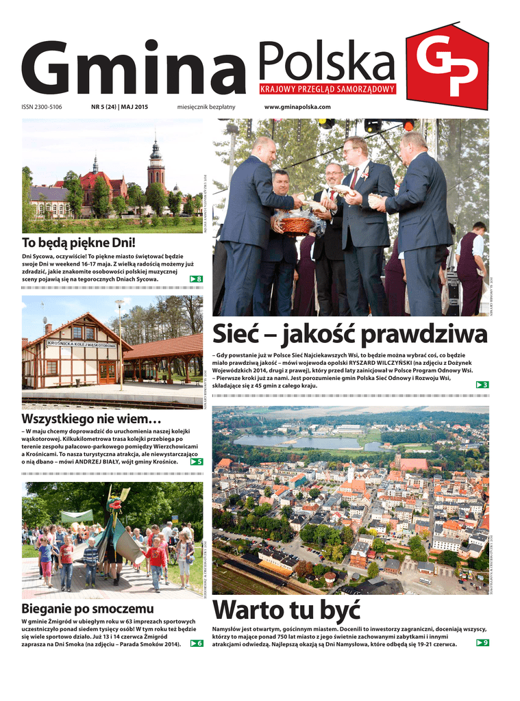 ISSN 2300-5106 nr 5 (24) | MAJ 2015 miesięcznik bezpłatny www.gminapolska.com Fot. Urząd Miasta i Gminy Syców To będą piękne Dni! 8 Sieć – jakość prawdziwa Fot. Sławomir Grymin Wszystkiego nie wiem… – Gdy powstanie już w Polsce Sieć Najciekawszych Wsi, to będzie można wybrać coś, co będzie miało prawdziwą jakość – mówi wojewoda opolski Ryszard Wilczyński (na zdjęciu z Dożynek Wojewódzkich 2014, drugi z prawej), który przed laty zainicjował w Polsce Program Odnowy Wsi. – Pierwsze kroki już za nami. Jest porozumienie gmin Polska Sieć Odnowy i Rozwoju Wsi, składające się z 45 gmin z całego kraju. Fot. Sławomir Grymin Dni Sycowa, oczywiście! To piękne miasto świętować będzie swoje Dni w weekend 16-17 maja. Z wielką radością możemy już zdradzić, jakie znakomite osobowości polskiej muzycznej sceny pojawią się na tegorocznych Dniach Sycowa. 3 – W maju chcemy doprowadzić do uruchomienia naszej kolejki wąskotorowej. Kilkukilometrowa trasa kolejki przebiega po terenie zespołu pałacowo-parkowego pomiędzy Wierzchowicami a Krośnicami. To nasza turystyczna atrakcja, ale niewystarczająco o nią dbano – mówi Andrzej Biały, wójt gminy Krośnice. 5 W gminie Żmigród w ubiegłym roku w 63 imprezach sportowych uczestniczyło ponad siedem tysięcy osób! W tym roku też będzie się wiele sportowo działo. Już 13 i 14 czerwca Żmigród 6 zaprasza na Dni Smoka (na zdjęciu – Parada Smoków 2014). Warto tu być Namysłów jest otwartym, gościnnym miastem. Docenili to inwestorzy zagraniczni, doceniają wszyscy, którzy to mające ponad 750 lat miasto z jego świetnie zachowanymi zabytkami i innymi 9 atrakcjami odwiedzą. Najlepszą okazją są Dni Namysłowa, które odbędą się 19-21 czerwca. Fot. Urząd Miejski w Namysłowie Fot. Urząd Miejski w Żmigrodzie Bieganie po smoczemu 2 Gmina Polska nr 5 (24) | maj 2015 Razem zmieniamy swój świat Odnowa Dolnośląskiej Wsi formalnie realizowana jest w województwie dolnośląskim od 2009 roku. Do dziś zgłosiło swój akces 970 sołectw ze 115 gmin, a liczba nowo przystępujących sołectw sukcesywnie wzrasta. Świadczy to o atrakcyjności programu oraz o słuszności jego realizacji. Mity, fakty, opowiastki Regionalny Program Operacyjny Województwa Opolskiego na lata 2014-2020 został zaakceptowany przez Komisję Europejską już 18 grudnia 2014 roku i był jednym z pierwszych siedmiu przyjętych regionalnych programów operacyjnych. Dokument określa najważniejsze dla rozwoju społeczno-gospodarczego województwa opolskiego obszary wsparcia, które będą współfinansowane z Europejskiego Funduszu Rozwoju Regionalnego i Europejskiego Funduszu Społecznego, a całkowity budżet programu wynosi blisko 944,97 mln euro. Zarząd Województwa Opolskiego powołał Komitet Monitorujący RPO (harmonogram naboru wniosków zaakceptowano już w styczniu), a pierwsze projekty dotyczą ochrony różnorodności biologicznej i infrastruktury drogowej. W ramach „Ochrony różnorodności biologicznej” będzie można składać projekty dotyczące m.in. ochrony zagrożonych gatunków i siedlisk przyrodniczych, tworzenia centrów ochrony różnorodności biologicznej, ochrony obszarów cennych przyrodniczo oraz budowy, modernizacji i doposażenia obiektów służących ochronie różnorodności biologicznej i edukacji ekologicznej. Drugi nabór odbędzie się w trybie pozakonkursowym i związany jest z drogami wojewódzkimi. ••• Starosta wielicki Jacek Juszkiewicz pobrał ponad 50 tys. zł za niewykorzystany urlop, choć odbierał dni wolne za udział w niedzielnych uroczystościach. Radni zawnioskowali o odwołanie starosty. Starosta zarzucił upolitycznienie sprawy, lecz obiecał, że tak dalej robić już nie będzie i dlatego m.in. zachował stanowisko. Na jak długo – nie wiadomo, bowiem opozycja zapowiada jesienne referendum w sprawie odwołania starosty. ••• Gdy we Wrocławiu odbywa się mecz piłki nożnej, mieszkający w tym mieście obcokrajowcy piszą do siebie ostrzegające SMS-y: „Nie wychodź z domu”. W stolicy Dolnego Śląska mieszka ich około siedmiu tysięcy, przyjechali tutaj do pracy lub na studia. Pracownicy Wrocławskiego Centrum Rozwoju Społecznego, które opiekuje się obcokrajowcami, podkreślają, że osoby ciemnoskóre codziennie doświadczają wytykania palcami, wyśmiewania, zaczepek, szturchnięć, słyszą na swój temat obraźliwe komentarze lub zwierzęce odgłosy. Tylko w Prokuraturze Wrocław Stare Miasto w ubiegłym roku prowadzono 41 spraw dotyczących rasistowskich ataków, ale sąd zazwyczaj feruje kary w zawieszeniu, które – moim zdaniem – nie mają wystarczającego znaczenia odstraszającego i prewencyjnego. Krótko mówiąc, hasło promocyjne: „Wrocław – miasto spotkań” to fikcja i żenada. ••• Zlikwidowane wcześniej sądy rejonowe w Kamiennej Górze i Lwówku Śląskim zostaną reaktywowane. To samo stanie się z sądami w Jaworze, Miliczu, Strzelinie i Wołowie. ••• Poziom naszej ligowej piłki nożnej jest niewysoki, za to poziom chamstwa okołopiłkarskiego często niebotyczny, z czym można było się niedawno spotkać na czwartoligowym meczu Promień Żary – Piast Iłowa. Sędzia spotkania usłyszał mnóstwo epitetów rzucanych m.in. przez miejscowego adwokata i zarazem radnego sejmiku województwa lubuskiego Tadeusza Ardellego (przez osiem lat był wiceprzewodniczącym sejmiku). „Ty ch… jeden, ty k…wo jedna, parszywcu, łysa gnido!” – bluzgał raczej tradycyjnie radny Ardelli, czasami jednak starał się być oryginalniejszym, wykrzykując na przykład: „Ty robaku na próbę z probówki zrobiony”. Prawdopodobnie radnego wkurzyło to, że wyżej notowani gospodarze przegrali 0:2, a do tego sędzia podyktował rzut karny przeciwko jego ukochanej drużynie z Żar. Miejscowy dziennikarz, który w przerwie zwrócił samorządowcowi i prawnikowi uwagę, usłyszał bluzgi i groźby zabrania 