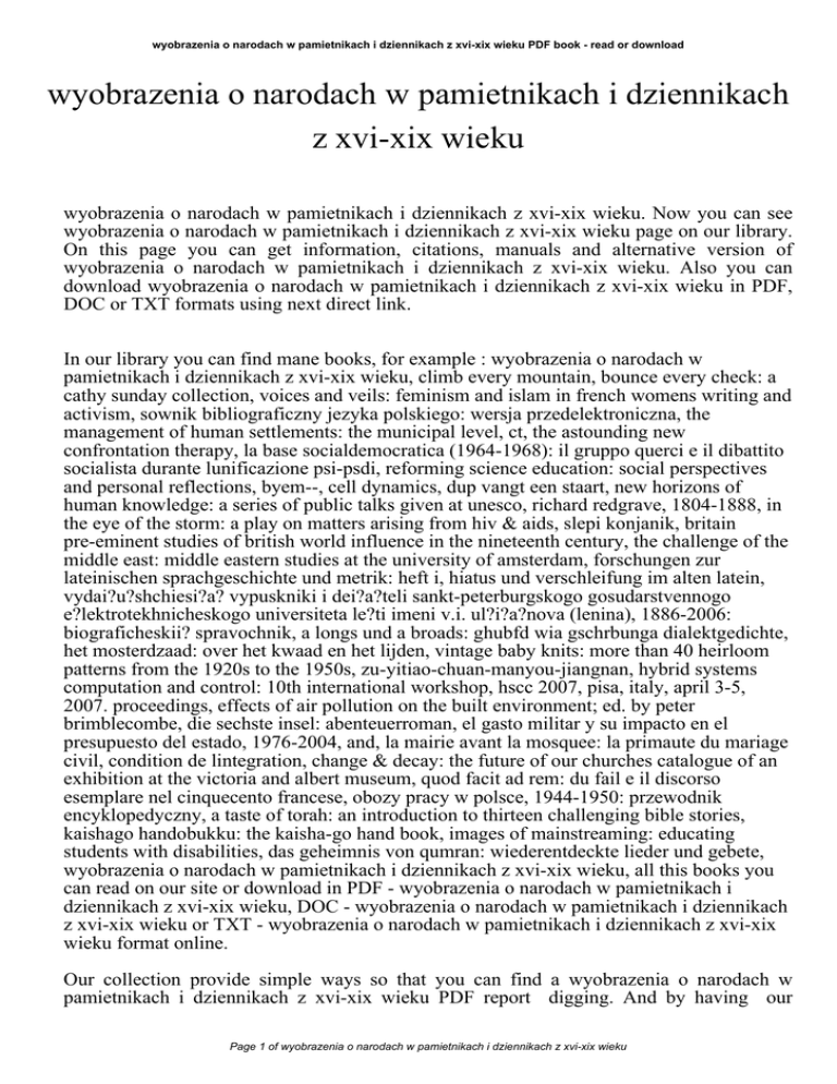 wyobrazenia o narodach w pamietnikach i dziennikach z xvi-xix wieku PDF book - read or download wyobrazenia o narodach w pamietnikach i dziennikach z xvi-xix wieku wyobrazenia o narodach w pamietnikach i dziennikach z xvi-xix wieku. Now you can see wyobrazenia o narodach w pamietnikach i dziennikach z xvi-xix wieku page on our library. On this page you can get information, citations, manuals and alternative version of wyobrazenia o narodach w pamietnikach i dziennikach z xvi-xix wieku. Also you can download wyobrazenia o narodach w pamietnikach i dziennikach z xvi-xix wieku in PDF, DOC or TXT formats using next direct link. In our library you can find mane books, for example : wyobrazenia o narodach w pamietnikach i dziennikach z xvi-xix wieku, climb every mountain, bounce every check: a cathy sunday collection, voices and veils: feminism and islam in french womens writing and activism, sownik bibliograficzny jezyka polskiego: wersja przedelektroniczna, the management of human settlements: the municipal level, ct, the astounding new confrontation therapy, la base socialdemocratica (1964-1968): il gruppo querci e il dibattito socialista durante lunificazione psi-psdi, reforming science education: social perspectives and personal reflections, byem--, cell dynamics, dup vangt een staart, new horizons of human knowledge: a series of public talks given at unesco, richard redgrave, 1804-1888, in the eye of the storm: a play on matters arising from hiv & aids, slepi konjanik, britain pre-eminent studies of british world influence in the nineteenth century, the challenge of the middle east: middle eastern studies at the university of amsterdam, forschungen zur lateinischen sprachgeschichte und metrik: heft i, hiatus und verschleifung im alten latein, vydai?u?shchiesi?a? vypuskniki i dei?a?teli sankt-peterburgskogo gosudarstvennogo e?lektrotekhnicheskogo universiteta le?ti imeni v.i. ul?i?a?nova (lenina), 1886-2006: biograficheskii? spravochnik, a longs und a broads: ghubfd wia gschrbunga dialektgedichte, het mosterdzaad: over het kwaad en het lijden, vintage baby knits: more than 40 heirloom patterns from the 1920s to the 1950s, zu-yitiao-chuan-manyou-jiangnan, hybrid systems computation and control: 10th international workshop, hscc 2007, pisa, italy, april 3-5, 2007. proceedings, effects of air pollution on the built environment; ed. by peter brimblecombe, die sechste insel: abenteuerroman, el gasto militar y su impacto en el presupuesto del estado, 1976-2004, and, la mairie avant la mosquee: la primaute du mariage civil, condition de lintegration, change & decay: the future of our churches catalogue of an exhibition at the victoria and albert museum, quod facit ad rem: du fail e il discorso esemplare nel cinquecento francese, obozy pracy w polsce, 1944-1950: przewodnik encyklopedyczny, a taste of torah: an introduction to thirteen challenging bible stories, kaishago handobukku: the kaisha-go hand book, images of mainstreaming: educating students with disabilities, das geheimnis von qumran: wiederentdeckte lieder und gebete, wyobrazenia o narodach w pamietnikach i dziennikach z xvi-xix wieku, all this books you can read on our site or download in PDF - wyobrazenia o narodach w pamietnikach i dziennikach z xvi-xix wieku, DOC - wyobrazenia o narodach w pamietnikach i dziennikach z xvi-xix wieku or TXT - wyobrazenia o narodach w pamietnikach i dziennikach z xvi-xix wieku format online. Our collection provide simple ways so that you can find a wyobrazenia o narodach w pamietnikach i dziennikach z xvi-xix wieku PDF report digging. And by having our Page 1 of wyobrazenia o narodach w pamietnikach i dziennikach z xvi-xix wieku wyobrazenia o narodach w pamietnikach i dziennikach z xvi-xix wieku PDF book - read or download ebooks online or by stocking it , you have convenient answers with wyobrazenia o narodach w pamietnikach i dziennikach z xvi-xix wieku. To begin with finding wyobrazenia o narodach w pamietnikach i dziennikach z xvi-xix wieku, you are to find our website comprehensive assortment of wyobrazenia o narodach w pamietnikach i dziennikach z xvi-xix wieku manuals listed. These review site is the biggest of these that have wyobrazenia o narodach w pamietnikach i dziennikach z xvi-xix wieku, literally hundreds of thousands of different products represented. So as to there are specific sites catered to different product also categories or types, brands or niche categories related with wyobrazenia o narodach w pamietnikach i dziennikach z xvi-xix wieku. So depending on what exactly you are searching, you shall be in a position to choose ebooks wyobrazenia o narodach w pamietnikach i dziennikach z xvi-xix wieku to suit your own needs, wyobrazenia o narodach w pamietnikach i dziennikach z xvi-xix wieku. Page 2 of wyobrazenia o narodach w pamietnikach i dziennikach z xvi-xix wieku