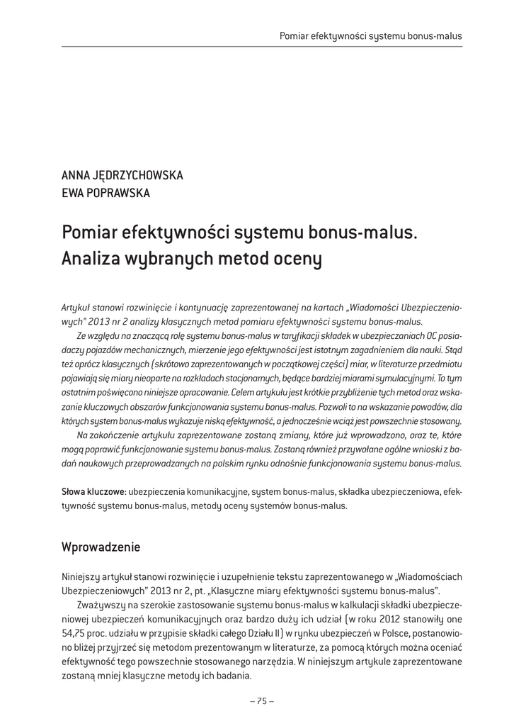 Pomiar efektywności systemu bonus-malus Anna Jędrzychowska Ewa Poprawska Pomiar efektywności systemu bonus-malus. Analiza wybranych metod oceny Artykuł stanowi rozwinięcie i kontynuację zaprezentowanej na kartach „Wiadomości Ubezpieczeniowych” 2013 nr 2 analizy klasycznych metod pomiaru efektywności systemu bonus-malus. Ze względu na znaczącą rolę systemu bonus-malus w taryfikacji składek w ubezpieczaniach OC posiadaczy pojazdów mechanicznych, mierzenie jego efektywności jest istotnym zagadnieniem dla nauki. Stąd też oprócz klasycznych (skrótowo zaprezentowanych w początkowej części) miar, w literaturze przedmiotu pojawiają się miary nieoparte na rozkładach stacjonarnych, będące bardziej miarami symulacyjnymi. To tym ostatnim poświęcono niniejsze opracowanie. Celem artykułu jest krótkie przybliżenie tych metod oraz wskazanie kluczowych obszarów funkcjonowania systemu bonus-malus. Pozwoli to na wskazanie powodów, dla których system bonus-malus wykazuje niską efektywność, a jednocześnie wciąż jest powszechnie stosowany. Na zakończenie artykułu zaprezentowane zostaną zmiany, które już wprowadzono, oraz te, które mogą poprawić funkcjonowanie systemu bonus-malus. Zostaną również przywołane ogólne wnioski z badań naukowych przeprowadzanych na polskim rynku odnośnie funkcjonowania systemu bonus-malus. Słowa kluczowe: ubezpieczenia komunikacyjne, system bonus-malus, składka ubezpieczeniowa, efektywność systemu bonus-malus, metody oceny systemów bonus-malus. Wprowadzenie Niniejszy artykuł stanowi rozwinięcie i uzupełnienie tekstu zaprezentowanego w „Wiadomościach Ubezpieczeniowych” 2013 nr 2, pt. „Klasyczne miary efektywności systemu bonus-malus”. Zważywszy na szerokie zastosowanie systemu bonus-malus w kalkulacji składki ubezpieczeniowej ubezpieczeń komunikacyjnych oraz bardzo duży ich udział (w roku 2012 stanowiły one 54,75 proc. udziału w przypisie składki całego Działu II) w rynku ubezpieczeń w Polsce, postanowiono bliżej przyjrzeć się metodom prezentowanym w literaturze, za pomocą których można oceniać efektywność tego powszechnie stosowanego narzędzia. W niniejszym artykule zaprezentowane zostaną mniej klasyczne metody ich badania. – 75 – Wiadomości Ubezpieczeniowe 1/2014 W poniższej pracy pod pojęciem „efektywność” rozumie się raczej „skuteczność” i „sprawność”. Przyjmiemy zatem, że system bonus-malus jest efektywny, jeżeli przynosi pozytywne skutki w praktyce działalności ubezpieczeniowej, tj. realizuje założone mu cele – prowadzi do zmniejszenia szkodowości w portfelu ubezpieczyciela oraz dobrze dopasowuje składkę1. Różnicowanie składek dla klientów, a więc konstrukcja systemu bonus-malus, ma wpływ na wyniki techniczne osiągane przez ubezpieczycieli. Jednak nie wolno również zapomnieć, że efektywność tego systemu może być postrzegana od strony klienta, dla którego wiąże się ona prawie wyłącznie z szybkością dotarcia do klasy z najwyższymi zniżkami lub w przypadku spowodowania szkód – z „ukaraniem” przez zwiększenie składki. Z wymienionych powodów, za punkt wyjścia w ocenie systemów bonus-malus można przyjąć ocenę tego, w jakim stopniu systemy te spełniają swoją podstawową funkcję, tj. różnicowania składek dla klientów o różnym profilu szkodowości. Należy zatem ocenić, czy klienci o różnym prawdopodobieństwie wystąpienia szkody płacą istotnie różne składki po ustalonym czasie funkcjonowania w systemie. Przy analizie tego zagadnienia pojawiają się kolejne pytania: • jaką składkę powinno się brać pod uwagę: średnią, najbardziej prawdopodobną, docelową, najniższą dla klientów o określonym poziomie ryzyka itp., • co oznacza składka „istotnie różna” – czy może być to np. różnica w średnich składkach przekraczająca arbitralnie przyjęty poziom, • po jakim czasie te składki powinny się wyraźnie różnić, czy okres np. pięcioletni jest wystarczający, czy też powinno się analizować systemy bonus-malus w horyzoncie dłuższym, np. 20- czy 30-letnim. Jak już wskazywano, ważnym aspektem oceny systemu jest jego wrażliwość na wystąpienie szkód, czyli dotkliwość „karania” za pojedynczą szkodę i za szkody kolejne. Dotkliwość ta powinna być związana z różnicą między składką, jaką płaciłby klient, gdyby nie wystąpiła szkoda, a składką w przypadku zgłoszenia szkody. System powinien bowiem karać za szkodę tak, aby klient, któremu przytrafiła się pojedyncza szkoda, nie rezygnował z usług danego ubezpieczyciela i nie szukał tańszej oferty u konkurencji (nie powinien „odstraszać” klientów). Oprócz tego system musi być też możliwie odporny na asymetrię informacji (zatajanie szkód, fałszywe informacje o zniżkach w poprzednich zakładach), czyli powinien być tak skonstruowany, by szybko „wyłapywał” klientów, których faktyczna szkodowość jest znacznie wyższa od deklarowanej. System bonus-malus jest ponadto jednym z produktów wpływających na atrakcyjność oferty ubezpieczyciela, przekłada się bowiem na wysokość składek zarówno w bieżącym okresie, jak i w przyszłych. Warunkiem jego chodliwości może być przejrzystość oferty i przystępna treść. A zatem system nie może być nadmiernie rozbudowany, o zbyt złożonych regułach przejścia z klasy do klasy. Istotna jest także oferta składana klientom bez żadnej historii szkodowości oraz to, czy zniżki „wypracowane” w innym zakładzie ubezpieczeń są uznawane2. Ważne jest także działanie systemu po kilku okresach ubezpieczenia. Poniżej w skróconej formie zaprezentowane zostaną typowe metody oceny oparte głównie na rozkładach stacjonarnych, a w dalszej części alternatywne metody prezentowane w literaturze naukowej. 1. W literaturze podaje się, że każdy system bonus-malus, w mniejszym lub większym stopniu, spełnia wyzn