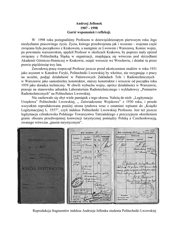 Andrzej Jellonek 1907 - 1998 Garść wspomnień i refleksji. W 1998 roku pożegnaliśmy Profesora w dziewięćdziesiątym pierwszym roku Jego niesłychanie pracowitego życia. Życia, którego przedwojenna jak i wczesno - wojenna część związana była początkowo z Krakowem, a następnie ze Lwowem i Warszawą. Koniec wojny, po powstaniu warszawskim, spędził Profesor w okolicach Krakowa, by poprzez mały epizod związany z Politechniką Śląską w organizacji, znajdującą się wówczas pod skrzydłami Akademii Górniczo-Hutniczej w Krakowie, osiąść wreszcie we Wrocławiu, i działać tu przez prawie pięćdziesiąt trzy lata. Zawodową pracę rozpoczął Profesor jeszcze przed ukończeniem studiów w roku 1931 jako asystent w Katedrze Fizyki, Politechniki Lwowskiej by wkrótce, nie rezygnując z pracy na uczelni, podjąć działalność w Państwowych Zakładach Tele i Radiotechnicznych w Warszawie jako samodzielny konstruktor, starszy konstruktor i wreszcie od początku roku 1939 jako doradca techniczny. W chwili wybuchu wojny, oprócz działalności w Warszawie, pracuje na stanowisku adiunkta Laboratorium Radiotechnicznego i wykładowcy „Pomiarów Radiotechnicznych” na Politechnice Lwowskiej. Nie zachowało się zbyt wiele pamiątek z tego okresu. Należą do nich: „Legitymacja Urzędowa” Politechniki Lwowskiej, „ Zaświadczenie Wojskowe” z 1930 roku, i przede wszystkim reprodukowana poniżej strona tytułowa wraz z ostatnimi wpisami do „Książki Legitymacyjnej L. 3557”, czyli indeksu Politechniki Lwowskiej Profesora. Jest też jeszcze legitymacja członkowska Polskiego Towarzystwa Tatrzańskiego z precyzyjnym określeniem granic obszaru przedwojennej konwencji turystycznej pomiędzy Polską a Czechosłowacją, zwanego wówczas „pasem turystycznym”. Reprodukcja fragmentów indeksu Andrzeja Jellonka studenta Politechniki Lwowskiej Ciekawą dla współczesnego pracownika wyższej szkoły może być legitymacja służbowa z odpowiednimi pieczęciami uprawniającymi do zniżek na kolejach normalnotorowych i wąskotorowych. Reprodukcja przedstawia łącznie drugą i trzecią stronę książeczki legitymacyjnej. Zdjęcie posiadacza było przyklejone do sztywnej okładki, w którą wklejona była, złożona na pół, kartka z lichego papieru. Reprodukcja legitymacji służbowej Rozprawy doktorskiej, a właściwie stopnia kandydata nauk elektrotechnicznych, boć to przecież pod okupacją sowiecką, bronił Profesor przedstawiając pracę pt. „Zachowanie się oporników niedrutowych przy wysokiej częstotliwości” (pisownia oryginalna) w maju 1941 r. Zajęcie Lwowa przez Niemców skłoniło Profesora do przeniesienia się do Warszawy, gdzie znalazł zatrudnienie w laboratorium badań fizycznych w Zakładach Philipsa, prowadząc badania w zakresie „aparatur medycznych dużej częstotliwości”. Los Profesora w powstaniu warszawskim był typowy dla większości warszawiaków. Swoją wiedzą wspierał działania powstańcze. W powstaniu stracił cały dorobek materialny i niestety również notatki naukowe razem ze swoją pracą doktorską, której tylko niektóre odtworzone fragmenty zachowały się do dziś. No i wreszcie Wrocław! 30 czerwca 1945 r. Profesor objął stanowisko adiunkta Politechniki i Uniwersytetu Wrocławskiego w katedrze prof. Kazimierza Idaszewskiego. Uczestniczył w pierwszym polskim akademickim wykładzie w wyzwolonym Wrocławiu, który miał miejsce w dniu 15 listopada 1945 r. W roku 1946 został powtórzony doktorat Profesora na bazie zrekonstruowanej pracy o zachowaniu się rezystorów warstwowych przy w.cz., tym razem na Politechnice Warszawskiej. Już od 1 czerwca 1946 zostaje Profesor mianowany profesorem nadzwyczajnym na Wydziale Mechaniczno-Elektrotechnicznym Uniwersytetu i Politechniki Wrocławskiej i tworzy wówczas Katedrę Radiotechniki. Fakt tak wczesnego mianowania profesorem nadzwyczajnym dokumentuje reprodukowana legitymacja służbowa. Legitymacja służbowa z roku 1946. Zainteresowania naukowe Profesora Andrzeja Jellonka „od zawsze” ogniskowały się wokół pomiarów radiotechnicznych, jak to określano w owych latach, z dodatkowym ukierunkowaniem na badania materiałowe. Wyrazem tych zainteresowań była pierwsza książka Profesora „Miernictwo Radiotechniczne” wydana w powojennych, bohaterskich i pionierskich czasach przez Przemysłowy Instytut Telekomunikacji (PIT) w Warszawie. Szata graficzna tego tomu, jednego z wydanej wówczas serii, była żałosna. Były to pomniejszone reprodukcje stron maszynopisu w bardzo kiepskiej tekturowej oprawie, ale jednocześnie była to podstawowa i jedyna biblia wszystkich pomiarowców w kraju, zajmujących się pomiarami przy wielkiej częstotliwości, a zresztą i nie tylko. Następne trzy książki zostały wydane przez profesjonalne wydawnictwa, miały więc już przyzwoitą szatę wydawniczą. Dalsze losy uczelniane Profesora kształtowały się następująco: ponieważ zakres zadań Katedry Radiotechniki nieustannie się powiększał, jak również rosła liczba kształconych studentów, doprowadziło to do utworzenia z niej trzech nowych katedr, z następującym podziałem zadań: Katedra kierowana przez prof. Wilhelma Rotkiewicza obejmowała zakres radiotechniki odbiorczej, Katedrą obejmującą zagadnienia techniki nadawczej kierował prof. Tadeusz Tomankiewicz, a kierownikiem Katedry Miernictwa Elektronowego (!) został prof. Andrzej Jellonek, wówczas już profesor zwyczajny. Ta dzisiaj niepoprawna nazwa katedry była wynikiem tego, że terminologia z zakresu elektroniki była jeszcze zupełnie nieukształtowana, ba, nie funkcjonował jeszcze termin „elektronika”, zaś wydzielony z Wydziału Elektrycznego nowy wydział przez kilka lat nosił nazwę Wydziału Łączności, żywcem zapożyczoną z terminologii wojskowej. Za ukoronowanie swej działalności administracyjnej Profesor uważał doprowadzenie do powstania w roku 1968 na Politechnice Wrocławskiej I
