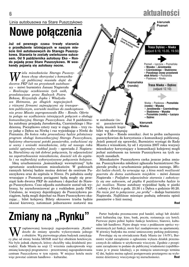 6 aktualnoci Linia autobusowa na Stare Puszczykowo Nowe po³¹czenia W ielu mieszkañców Starego Puszczykowa chc¹c skorzystaæ z komunikacji publicznej musia³a dojæ do dworca PKP lub na przystanek autobusowy mówi burmistrz Janusz Napiera³a Realizuj¹c oczekiwania tych osób, przedstawiane przez Radnych Piotra Bekasa, Krzysztofa Jopka i W³adys³awa Hetmana, po d³ugich negocjacjach z ró¿nymi firmami zajmuj¹cymi siê transportem publicznym, warunki mo¿liwe do zaakceptowania przez Miasto zaproponowa³o Eko Rondo. Oferta ta polega na wyd³u¿eniu istniej¹cych po³¹czeñ o obs³ugê komunikacyjn¹ Starego Puszczykowa. Ju¿ 9 padziernika autobusy przejad¹ Jaros³awsk¹, Czarnieckiego i Studzienn¹. Pocz¹tkowo cztery razy w ci¹gu dnia trzy razy jad¹c z Dêbca na Niwkê i raz wyje¿d¿aj¹c z Niwki do Poznania. Do koñca roku prowadzony bêdzie pilota¿owy program obs³ugi komunikacyjnej Starego Puszczykowa, bêdziemy obserwowaæ potoki pasa¿erskie, ws³uchiwaæ siê w oceny i wnioski mieszkañców, ¿eby od nowego roku ustaliæ optymalny rozk³ad jazdy opowiada J. Napiera³a. Staralimy siê tak dobraæ po³¹czenia, by odpowiedzieæ na zapotrzebowanie mieszkañców, dowieæ ich do szpitala i na najbardziej wykorzystywane po³¹czenia kolejowe. Ide¹ uruchomienia komunikacji wewnêtrznej by³o sprostanie oczekiwaniom mieszkañców. W godzinach rannych ³atwiej bêdzie mo¿na dotrzeæ do centrum Puszczykowa oraz do szpitala w Niwce. Po po³udniu osoby wracaj¹ce z Poznania poci¹gami bêd¹ mog³y siê przesi¹æ ko³o dworca PKP do autobusu i dojechaæ do Starego Puszczykowa. Czas odjazdu autobusów zosta³ tak wybrany, by zsynchronizowaæ go z rozk³adem jazdy PKP. Ustalono, ¿e wszyscy doje¿d¿aj¹cy do Puszczykowa poci¹giem, bêd¹ mogli dojechaæ na Stare Puszczykowo okazuj¹c bilet kolejowy. Bilety okresowe trzeba bêdzie okazaæ kierowcy, natomiast jednorazowe zostawiæ mu Zmiany na Rynku W zaplanowanej koncepcji zagospodarowania Rynku dosz³o do zmiany sposobu wykorzystania jednego z obiektów. Wg pierwotnego planu budynek zamykaj¹cy plac od strony boiska MOSiR mia³ byæ obiektem hotelowym. Nie by³o jednak chêtnych, którzy chcieliby tak¹ dzia³alnoæ prowadziæ. Rada Miasta na sesji 12 wrzenia zaakceptowa³a wiêc zmianê koncepcji programowo przestrzennej zagospodarowania centrum Puszczykowa w tym rejonie. W miejsce hotelu mo¿e wiêc powstaæ centrum handlowo kulturalne. b Trasa Dêbiec Niwka (odjazd 8.10, 15.05, 19.50) Poznañ £êczyca Poznañska Wysoka Jaros³awska Czarnieckiego Studzienna Posadzego (nowy przystanek obok Arturo) Poznañska Piaskowa Niwka Trasa Niwka Dêbiec (odjazd 12.10) b Ju¿ od pewnego czasu trwa³y starania o przed³u¿enie istniej¹cych w naszym miecie linii autobusowych do Starego Puszczykowa. Starania te zosta³y uwieñczone sukcesem. Od 9 padziernika autobusy Eko Rondo pojad¹ przez Stare Puszczykowo. W weekendy pojawi¹ siê autobusy nocne. Niwka Piaskowa Poznañska (rondo) Wysoka Jaros³awska Czarnieckiego Studzienna Wysoka Poznañska (rondo) £êczyca Dêbiec w autobusie (inni pasa¿erowie bêd¹ musieli kupiæ bilet wg obowi¹zuj¹cego w Eko Rondo cennika). Jest to próba zachêcenia puszczykowian do korzystania z komunikacji publicznej. Je¿eli pomys³ siê sprawdzi, Burmistrz wyst¹pi do Rady Miasta z wnioskiem, by od 1 stycznia 2007 roku wszyscy mieszkañcy korzystaj¹cy z komunikacji kolejowej mogli jechaæ autobusem na terenie Puszczykowa na tych samych zasadach. Mieszkañców Puszczykowa czeka jeszcze jedna zmiana. Puszczykowska m³odzie¿ zg³asza³a burmistrzowi Napierale probê o uruchomienie po³¹czenia nocnego. M³odzi ludzie chcieli, by wracaj¹c np. z kina mieli mo¿liwoæ powrotu do domu autobusem miejskim mówi Janusz Napiera³a Podj¹³em odpowiednie starania i zakoñczy³y siê one sukcesem, od pi¹tku 6 padziernika bêdzie to ju¿ mo¿liwe. Nocne autobusy wyje¿d¿aæ bêd¹ w piatki i soboty z Niwki o godz. 23.30 i z Dêbca o godzinie 00.20. Na razie jest to po³¹czenie na próbê dodaje burmistrz Napiera³a. Najbli¿sze miesi¹ce pos³u¿¹ zebraniu opinii pasa¿erów o linii nocnej. Red Parter budynku przeznaczono pod handel, us³ugi lub dzia³alnoæ kulturaln¹ (np. kino, bank, poczta, restauracja czy hotel). Pierwsze piêtro pe³niæ bêdzie funkcje hotelowe, biurowe, kulturalne lub handlowe. Piêtro drugie wraz z poddaszem oprócz wymienionych ju¿ funkcji, mo¿e byæ zaadaptowane na apartamenty. W piwnicy budynku ma zostaæ umieszczony parking podziemny. Powo³uj¹c siê na owiadczenie Rady Miasta (nr 1/6/IV), Burmistrz wyda³ zarz¹dzenie o og³oszeniu wykazu dzia³ek przeznaczonych do oddania w u¿ytkowanie wieczyste. Zgodnie z przepisami zarz¹dzenie to podano do publicznej wiadomoci (opublikowano je w prasie lokalnej), a po miniêciu ustawowego terminu 42 dni, bêdzie mo¿na og³osiæ postêpowanie przetargowe na wy³onienie dzier¿awcy wieczystego tej nieruchomoci. Red