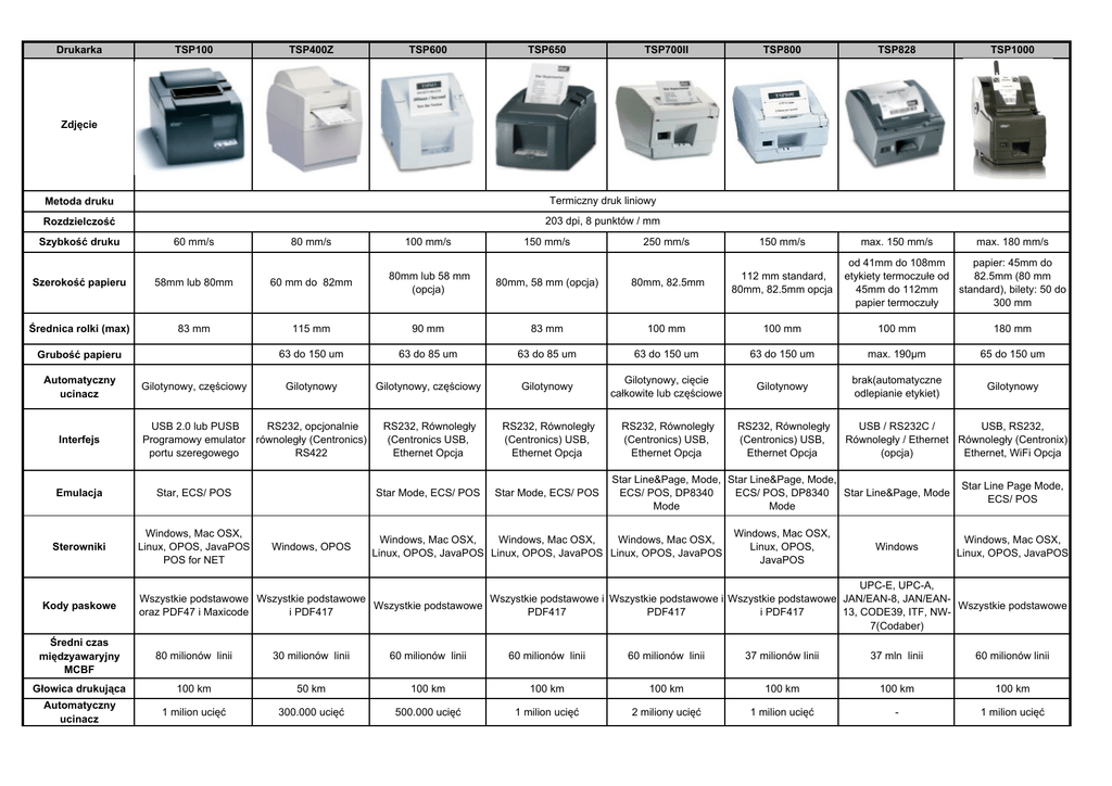 Drukarka TSP100 TSP400Z TSP600 TSP650 TSP700II TSP800 TSP828 TSP1000 250 mm/s 150 mm/s max. 150 mm/s max. 180 mm/s Zdjęcie Metoda druku Termiczny druk liniowy Rozdzielczość 203 dpi, 8 punktów / mm Szybkość druku 60 mm/s 80 mm/s 100 mm/s 150 mm/s 80mm, 58 mm (opcja) 80mm, 82.5mm 112 mm standard, 80mm, 82.5mm opcja papier: 45mm do od 41mm do 108mm 82.5mm (80 mm etykiety termoczułe od standard), bilety: 50 do 45mm do 112mm 300 mm papier termoczuły Szerokość papieru 58mm lub 80mm 60 mm do 82mm 80mm lub 58 mm (opcja) Średnica rolki (max) 83 mm 115 mm 90 mm 83 mm 100 mm 100 mm 100 mm 180 mm 63 do 150 um 63 do 85 um 63 do 85 um 63 do 150 um 63 do 150 um max. 190µm 65 do 150 um Gilotynowy Gilotynowy, częściowy Gilotynowy Gilotynowy, cięcie całkowite lub częściowe Gilotynowy brak(automatyczne odlepianie etykiet) Gilotynowy RS232, Równoległy (Centronics USB, Ethernet Opcja RS232, Równoległy (Centronics) USB, Ethernet Opcja RS232, Równoległy (Centronics) USB, Ethernet Opcja RS232, Równoległy (Centronics) USB, Ethernet Opcja Star Mode, ECS/ POS Star Mode, ECS/ POS Grubość papieru Automatyczny ucinacz Interfejs Gilotynowy, częściowy USB 2.0 lub PUSB RS232, opcjonalnie Programowy emulator równoległy (Centronics) RS422 portu szeregowego Emulacja Star, ECS/ POS Sterowniki Windows, Mac OSX, Linux, OPOS, JavaPOS POS for NET Kody paskowe Windows, OPOS USB / RS232C / USB, RS232, Równoległy / Ethernet Równoległy (Centronix) (opcja) Ethernet, WiFi Opcja Star Line&Page, Mode, Star Line&Page, Mode, ECS/ POS, DP8340 ECS/ POS, DP8340 Star Line&Page, Mode Mode Mode Star Line Page Mode, ECS/ POS Windows, Mac OSX, Linux, OPOS, JavaPOS Windows, Mac OSX, Linux, OPOS, JavaPOS Windows, Mac OSX, Windows, Mac OSX, Windows, Mac OSX, Linux, OPOS, JavaPOS Linux, OPOS, JavaPOS Linux, OPOS, JavaPOS Windows UPC-E, UPC-A, Wszystkie podstawowe Wszystkie podstawowe Wszystkie podstawowe i Wszystkie podstawowe i Wszystkie podstawowe JAN/EAN-8, JAN/EANWszystkie podstawowe Wszystkie podstawowe oraz PDF47 i Maxicode i PDF417 PDF417 PDF417 i PDF417 13, CODE39, ITF, NW7(Codaber) Średni czas międzyawaryjny MCBF 80 milionów linii 30 milionów linii 60 milionów linii 60 milionów linii 60 milionów linii 37 milionów linii 37 mln linii 60 milionów linii Głowica drukująca 100 km 50 km 100 km 100 km 100 km 100 km 100 km 100 km Automatyczny ucinacz 1 milion ucięć 300.000 ucięć 500.000 ucięć 1 milion ucięć 2 miliony ucięć 1 milion ucięć - 1 milion ucięć Drukarka TSP100 TSP400Z TSP600 TSP650 TSP700II TSP800 TSP828 TSP1000 Wymiary (szerokość x głębokość x wysokość) 160 mm x 245 mm x 152 mm 178 mm x 244 mm x 256 mm 142 mm x 199 mm x 132 mm 142 mm x 202 mm x 132 mm 147 mm x 213 mm x 148 mm 180 mm x 213 mm x 148 mm 180 mm x 213 mm x 157 mm 161 mm x 306.5 mm x 249 mm Waga Ok. 1.7 kg Ok. 3.7 kg Ok. 1.7 kg Ok. 1.7 kg Ok. 1.75 kg Ok. 1.7 kg Ok. 2.0 kg Ok. 3.0 kg Kolor obudowy BeŜowy lub Grafitowy BeŜowy lub Grafitowy BeŜowy lub Grafitowy BeŜowy lub Grafitowy BeŜowy lub Grafitowy Grafitowy Czerwono - beŜowy, BeŜowy lub Grafitowy Temperatura pracy 5 0C - 45 0C Temperatura składowania -20 0C - 60 0C Zasilacz Wewnętrzny 80mm, 82.5mm 80mm, 82.5mm 9 pin RS232, USB, mocowanie papieru, mocowanie papieru, Ethernet, Mocowanie Interfejs USB, Ethernet, papieru 58mm, Interfejs USB, USB, Ethernet, Osłona 9 pin RS232, Przysłona Elementy do pionowego Ethernet, 9 pin RS232, kroploodporna, Brzęczyk włącznika zasilania, montaŜu, moŜliwośc Przysłona włącznika Elementy do pionowego wyboru koloru drukarki zasilania, Elementy do montaŜu, Brzęczyk, przy duŜym zamówieniu pionowego montaŜu przesłona włącznika WyposaŜenie opcjonalne Modele PS60L opcja TSP113 – Podstawowy TSP113 PUSB – Podstawowy z PUSB TSP143 – Podstawowy z aut. ucinaczem TSP143 PUSB - Wersja z aut. ucinaczem i PUSB TSP412ZD – Podstawowa TSP 442ZD – Podstawowa z aut. ucinaczem TSP743C-24II – Centronics, biała TSP 743C-24II GR – Centronics, grafitowa TSP743D-24 – RS232, biała TSP743D-24II GR – TSP613 – Podstawowy TSP651 – Podstawowy RS232, grafitowa TSP643 – Podstawowy, TSP654 – Podstawowy, TSP743U-24II – USB, aut. Ucinacz aut. ucinacz biała TSP743U-24II GR – USB, grafitowa TSP743-24II – bez interfejsu, biała TSP743-24II GR – bez interfejsu, grafitowa TSP847D – wersja RS232 TSP847C – wersja Centronix Interfejs Ethernet, WiFi TSP828 – Podstawowy TSP828UN – Podstawowy z interfejsem USB/RS232 TSP828C– Podstawowy z interfejsem równoległym TSP1043 – Podstawowy TSP1043D – wersja RS232 TSP1043C – wersja Centronix TSP1043U – wersja USB Drukarka TSP100 Co zawiera zestaw? elementy do naściennego montaŜu, CD-ROM ze sterownikami i narzędziami programistycznymi, kabel zasilający, kabel USB, rolkę papieru, prowadnicę rolki 58mm Cecha charkaterystyczna Drukarki są wyposaŜone w elementy do naściennego montaŜu i obsługę szuflady kasowej. Sprzedawane w komplecie. TSP400Z rolka papieru Obsługują szufladę kasową. Zastosowanie Szczególne zastosowanie TSP600 TSP650 TSP700II rolka papieru rolka papieru, CD ze sterownikami, elementy do naściennego montaŜu, prowadnica rolki 58 lub 80 mm, przesłona włącznika rolka papieru, dysk CD z oprogramowaniem futurePrint TSP800 TSP828 rolka papieru, CD-ROM ze sterownikami, program do edycji etykiet, kabel zasilający, zasilacz Dostarczany z drukarkami sterownik umoŜliwia automatyczne skalowanie druku A4 do A6, co pozwala na druk stron www czy wydruków z Worda lub Excela. Posiadają dwa wyjścia do sterowania szufladami kasowymi. Drukarki automatycznie drukują kopię dokumentu lub zapamiętują ją w nieulotnej pamięci elektronicznej. TSP1000 Drukarki posiadą Automatyczne specjalny pojemnik z odlepianie etykiet. Dostępne z drukarkami czujnikiem, w którym narzędzia programowe moŜe zgromadzić do 30 pozwalają w łatwy zadrukowanych biletów. sposób projektować i Długość biletu: 50 do przesyłać do drukarek 300 mm. te