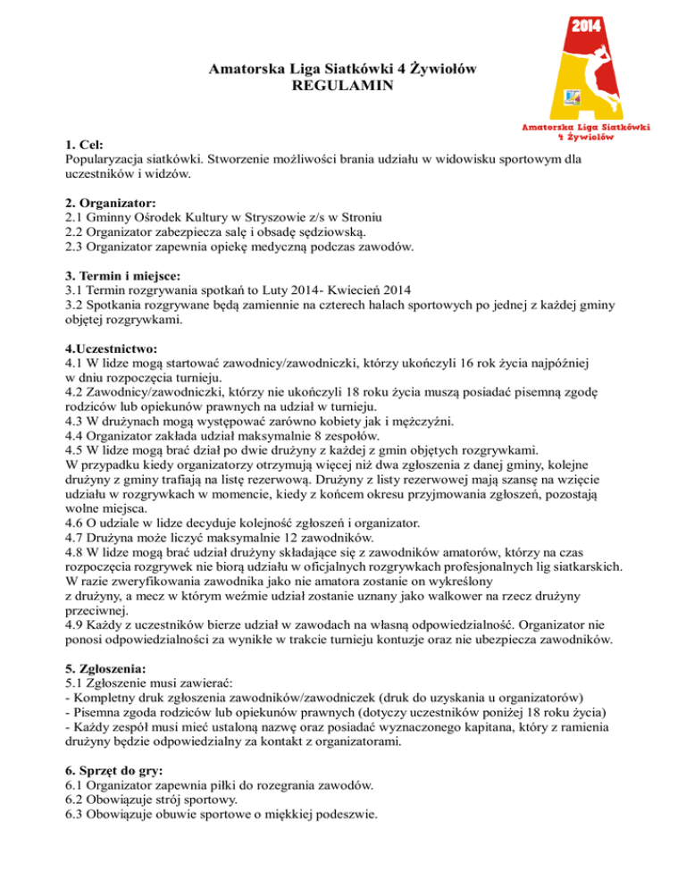 Amatorska Liga Siatkówki 4 Żywiołów REGULAMIN