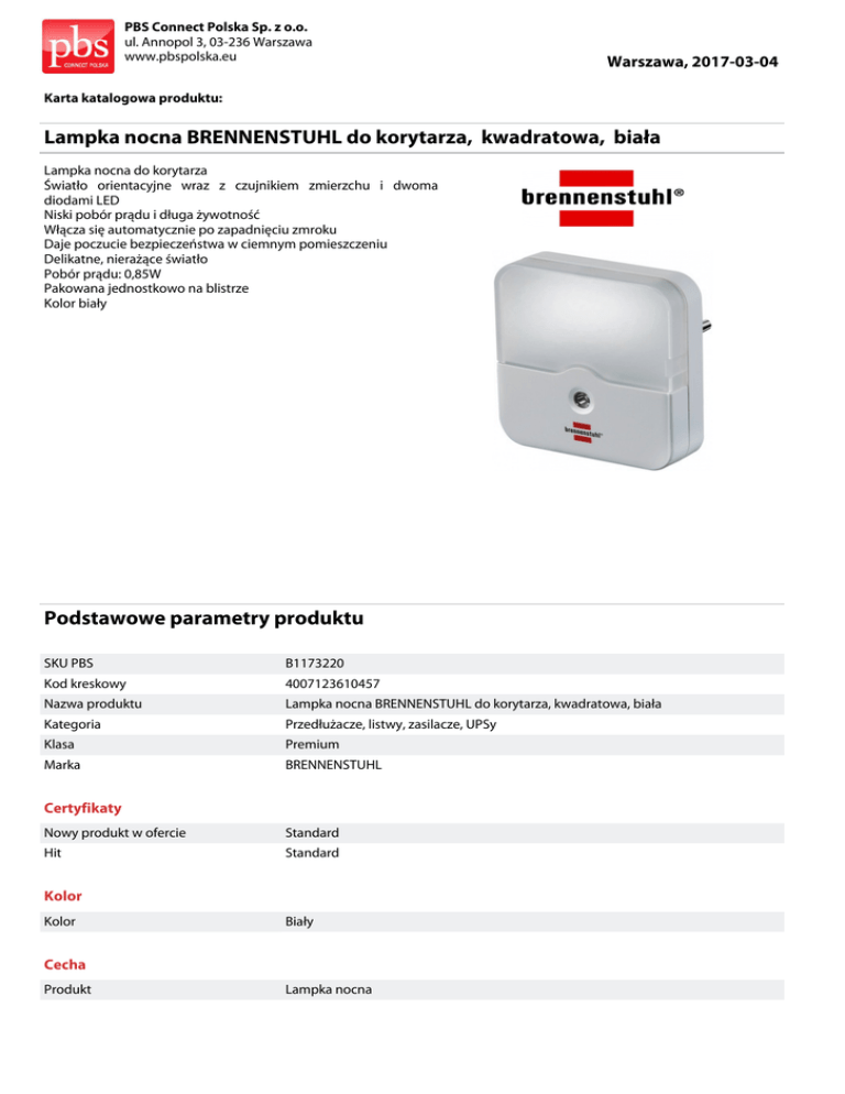 PBS Connect Polska Sp. z o.o. ul. Annopol 3, 03-236 Warszawa www.pbspolska.eu Warszawa, 2017-03-04 Karta katalogowa produktu: Lampka nocna BRENNENSTUHL do korytarza, kwadratowa, biała Lampka nocna do korytarza Światło orientacyjne wraz z czujnikiem zmierzchu i dwoma diodami LED Niski pobór prądu i długa żywotność Włącza się automatycznie po zapadnięciu zmroku Daje poczucie bezpieczeństwa w ciemnym pomieszczeniu Delikatne, nierażące światło Pobór prądu: 0,85W Pakowana jednostkowo na blistrze Kolor biały Podstawowe parametry produktu SKU PBS B1173220 Kod kreskowy 4007123610457 Nazwa produktu Lampka nocna BRENNENSTUHL do korytarza, kwadratowa, biała Kategoria Przedłużacze, listwy, zasilacze, UPSy Klasa Premium Marka BRENNENSTUHL Certyfikaty Nowy produkt w ofercie Standard Hit Standard Kolor Kolor Biały Cecha Produkt Lampka nocna PBS Connect Polska Sp. z o.o. ul. Annopol 3, 03-236 Warszawa www.pbspolska.eu Warszawa, 2017-03-04 Karta katalogowa produktu cd. Lampka nocna BRENNENSTUHL do korytarza, kwadratowa, biała Podstawowe parametry produktu Typ Kwadratowa W ofercie od 2014-01 Wymiary Rozmiar B.d. Wymiary (mm) B.d. Wspólny słownik zamówień CPV 31521000-4 Jednostki logistyczne Opakowanie 1 4 szt Opakowanie 2 48 szt