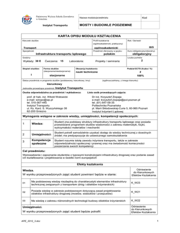 Państwowa Wyższa Szkoła Zawodowa w Gnieźnie Nazwa modułu/przedmiotu Kod MOSTY I BUDOWLE PODZIEMNE Instytut Transportu KARTA OPISU MODUŁU KSZTAŁCENIA Kierunek studiów Profil kształcenia Rok / Semestr (ogólnoakademicki, praktyczny) III/5 ogólnoakademicki Transport Specjalność Przedmiot oferowany w języku: Infrastruktura transportu lądowego polskim Kurs (obligatoryjny/obieralny) obligatoryjny Liczba punktów Godziny Wykłady: 30 E Stopień studiów: Ćwiczenia: 15 Laboratoria: Forma studiów (stacjonarna/niestacjonarna) I Obszar(y) kształcenia Podział ECTS (liczba i %) nauki techniczne 2 100% stacjonarne Status przedmiotu w programie studiów (podstawowy, kierunkowy, inny) Liczba punktów 2 Projekty / seminaria: (ogólnouczelniany, z innego kierunku) kierunkowy Jednostka prowadząca przedmiot: Instytut Transportu Osoba odpowiedzialna za przedmiot / wykładowca: prof. dr hab. inż. Witold Wołowicki e-mail: [email protected] tel. 510-367-445 Instytut Transportu ul. Ks. Kard. S. Wyszyńskiego 38 62-200 Gniezno xx xxx Lista osób prowadzących zajęcia: Dr inż. Krzysztof Ziopaja e-mail: [email protected] tel. (61) 647-58-35 Politechnika Poznańska pl. Marii Skłodowskiej-Curie 5, 60-965 Poznań Instytut Inżynierii Lądowej Wymagania wstępne w zakresie wiedzy, umiejętności, kompetencji społecznych: Student zna podstawy struktury infrastruktury transportu lądowego oraz posiada przewidziane programem studiów wiadomości z zakresu matematyki, fizyki, wytrzymałości materiałów i mechaniki 1 Wiedza: 2 Umiejętności: źródeł; ma predyspozycje do ustawicznego samokształcenia 3 Kompetencje społeczne Student potrafi samodzielnie uzyskać dostęp do wiedzy technicznej z dowolnych Student rozumie istotę zawodu inżyniera transportu, także w zakresie odpowiedzialności społecznej i prawnej oraz ma świadomość konieczności poszerzania swoich kompetencji Cel przedmiotu: Wprowadzenie i zapoznanie studentów z typowymi konstrukcjami infrastruktury drogowej oraz podanie zasad ich kształtowania i projektowania w świetle norm europejskich Efekty kształcenia Wiedza. W wyniku przeprowadzonych zajęć student powinien/ będzie w stanie: Odniesienie do Kierunkowych Efektów Kształcenia 01 Ma podstawową wiedzę niezbędną do charakterystyki elementów infrastruktury technicznej związanych z transportem (dróg i obiektów inżynierskich) K_W23 02 Posiada wiedzę w zakresie podstawowym dotyczącą zasad projektowania obiektów infrastruktury drogowej (mostów, wiaduktów i przepustów) K_W21 03 Ma wiedzę z zakresu różnorodnych technologii budowy obiektów inżynierskich K_W22 Umiejętności. W wyniku przeprowadzonych zajęć student będzie potrafił: APE_2012_3.doc Odniesienie do Kierunkowych Efektów Kształcenia 1 Państwowa Wyższa Szkoła Zawodowa w Gnieźnie Instytut Transportu Nazwa modułu/przedmiotu Kod MOSTY I BUDOWLE PODZIEMNE 01 Samodzielnie lub w zespole określić zakres i koordynować realizację zleconego zadania z zakresu projektowania obiektów inżynierskich K_U02 02 Systematycznie dążyć do pogłębienia wiedzy technicznej i podnoszenia kompetencji zawodowych K_U05 03 Projektować w podstawowym zakresie elementy infrastruktury transportu lądowego (obiekty inżynierskie o prostych układach konstrukcyjnych) K_U13 Kompetencje społeczne. W wyniku przeprowadzonych zajęć student zdobędzie następujące kompetencje: Odniesienie do Kierunkowych Efektów Kształcenia 01 Jest świadomy potrzeby ciągłego dokształcania się. Rozumie społeczną rolę absolwenta uczelni technicznej K_K01 02 Dostrzega istotę i rozumie pozatechniczne aspekty i skutki działalności inżyniera transportu i jej wpływ na środowisko naturalne oraz konieczność wzięcia odpowiedzialności za podjęte decyzje K_K02 03 Ma świadomość odpowiedzialności za własną pracę oraz gotowość podporządkowania się zasadom współpracy w zespole i ponoszenia odpowiedzialności za wspólnie realizowane zadania K_K04 Sposoby sprawdzenia efektów kształcenia Wykład pisemny test – sprawdzenie wiedzy (5-6 pytań) ocenianie ciągłe na każdych zajęciach (premiowanie aktywności i jakości percepcji) Ćwiczenia: sprawdzian ocenianie ciągłe podczas każdych zajęć w ramach czasu własnego rozwiązanie zadanych przykładów obliczeniowych Uzyskiwanie punktów dodatkowych za aktywność podczas zajęć, a szczególnie za: proponowanie uszczegółowienia i rozszerzenia omawianych zagadnień podczas zajęć efektywne zastosowanie zdobytej wiedzy podczas rozwiązywania zadanego problemu przedstawianie uwag związanych z udoskonaleniem materiałów dydaktycznych wskazywanie trudności percepcyjnych studentów umożliwiające bieżącą korektę procesu dydaktycznego. Treści programowe Klasyfikacja obiektów mostowych. Elementy wyposażenia mostów. Podpory i fundamenty mostów. Elementy konstrukcyjne i zasady kształtowani belkowych mostów stalowych i zespolonych. Konstruowanie elementów i połączeń. Formy konstrukcyjne mostów betowych. Metody realizacji mostów stalowych i betonowych. Mosty płytowe i belkowe: kształtowanie, obliczanie, konstruowanie. Mosty skrzynkowe. Mosty sprężone o cięgnach wewnętrznych i kablach swobodnych. Złożone systemy konstrukcyjne: mosty ruchome, łukowe, podwieszone. Zasady wyboru modeli obliczeniowych i metod analizy statycznej. Przepusty. Budowle podziemne: charakterystyka przejść podziemnych, tuneli płytkich i głębokich. Wyposażenie budowli podziemnych. Metody realizacji tuneli. APE_2012_3.doc 2 Państwowa Wyższa Szkoła Zawodowa w Gnieźnie Instytut Transportu Nazwa modułu/przedmiotu Kod MOSTY I BUDOWLE PODZIEMNE Literatura podstawowa: 1. A. Madaj, W. Wołowicki, Podstawy projektowania budowli mostowych, WKŁ, Warszawa, 2007 2. J. Głomb, Drogowe budowle inżynierskie. Wprowadzenie do projektowania, WKŁ, Warszawa,1988 3. PN-EN 1990:2004 Eurokod. Podstawy projektowania konstrukcji oraz PN-EN 1990:2004/A1 4. PN-EN 1991-2 Eurokod 1: