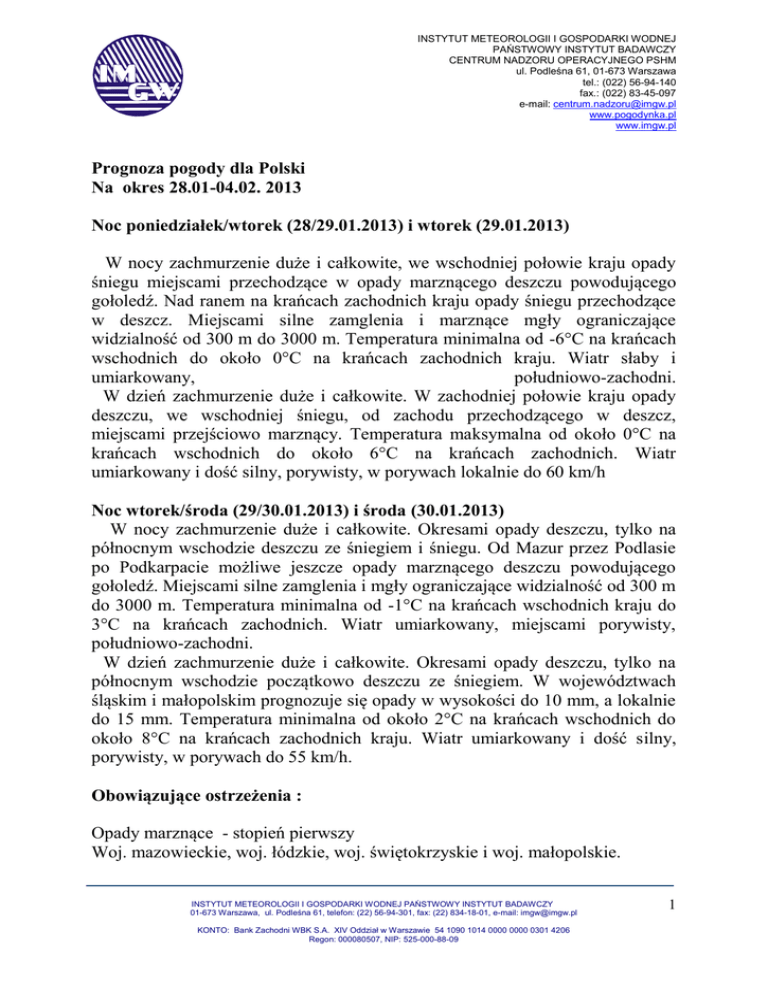 INSTYTUT METEOROLOGII I GOSPODARKI WODNEJ PAŃSTWOWY INSTYTUT BADAWCZY CENTRUM NADZORU OPERACYJNEGO PSHM ul. Podleśna 61, 01-673 Warszawa tel.: (022) 56-94-140 fax.: (022) 83-45-097 e-mail: [email protected] www.pogodynka.pl www.imgw.pl Prognoza pogody dla Polski Na okres 28.01-04.02. 2013 Noc poniedziałek/wtorek (28/29.01.2013) i wtorek (29.01.2013) W nocy zachmurzenie duże i całkowite, we wschodniej połowie kraju opady śniegu miejscami przechodzące w opady marznącego deszczu powodującego gołoledź. Nad ranem na krańcach zachodnich kraju opady śniegu przechodzące w deszcz. Miejscami silne zamglenia i marznące mgły ograniczające widzialność od 300 m do 3000 m. Temperatura minimalna od -6°C na krańcach wschodnich do około 0°C na krańcach zachodnich kraju. Wiatr słaby i umiarkowany, południowo-zachodni. W dzień zachmurzenie duże i całkowite. W zachodniej połowie kraju opady deszczu, we wschodniej śniegu, od zachodu przechodzącego w deszcz, miejscami przejściowo marznący. Temperatura maksymalna od około 0°C na krańcach wschodnich do około 6°C na krańcach zachodnich. Wiatr umiarkowany i dość silny, porywisty, w porywach lokalnie do 60 km/h Noc wtorek/środa (29/30.01.2013) i środa (30.01.2013) W nocy zachmurzenie duże i całkowite. Okresami opady deszczu, tylko na północnym wschodzie deszczu ze śniegiem i śniegu. Od Mazur przez Podlasie po Podkarpacie możliwe jeszcze opady marznącego deszczu powodującego gołoledź. Miejscami silne zamglenia i mgły ograniczające widzialność od 300 m do 3000 m. Temperatura minimalna od -1°C na krańcach wschodnich kraju do 3°C na krańcach zachodnich. Wiatr umiarkowany, miejscami porywisty, południowo-zachodni. W dzień zachmurzenie duże i całkowite. Okresami opady deszczu, tylko na północnym wschodzie początkowo deszczu ze śniegiem. W województwach śląskim i małopolskim prognozuje się opady w wysokości do 10 mm, a lokalnie do 15 mm. Temperatura minimalna od około 2°C na krańcach wschodnich do około 8°C na krańcach zachodnich kraju. Wiatr umiarkowany i dość silny, porywisty, w porywach do 55 km/h. Obowiązujące ostrzeżenia : Opady marznące - stopień pierwszy Woj. mazowieckie, woj. łódzkie, woj. świętokrzyskie i woj. małopolskie. INSTYTUT METEOROLOGII I GOSPODARKI WODNEJ PAŃSTWOWY INSTYTUT BADAWCZY 01-673 Warszawa, ul. Podleśna 61, telefon: (22) 56-94-301, fax: (22) 834-18-01, e-mail: [email protected] KONTO: Bank Zachodni WBK S.A. XIV Oddział w Warszawie 54 1090 1014 0000 0000 0301 4206 Regon: 000080507, NIP: 525-000-88-09 1 INSTYTUT METEOROLOGII I GOSPODARKI WODNEJ PAŃSTWOWY INSTYTUT BADAWCZY CENTRUM NADZORU OPERACYJNEGO PSHM ul. Podleśna 61, 01-673 Warszawa tel.: (022) 56-94-140 fax.: (022) 83-45-097 e-mail: [email protected] www.pogodynka.pl www.imgw.pl W najbliższym czasie przewidywane jest wydanie ostrzeżeń: Opady marznące - stopień pierwszy Woj. podkarpackie i woj. lubelskie. Oblodzenie – stopień pierwszy Woj. zachodniopomorskie, woj. lubuskie, woj. wielkopolskie, dolnośląskie i woj. opolskie. W związku z prognozowaną odwilżą przewiduje się wydanie 29.01.2013 /wtorek/ ostrzeżeń o roztopach: Woj. zachodniopomorskie na 29.01.2013. Woj. pomorskie na 29.01 i 30.01.2013. Woj. lubuskie, wielkopolskie, kujawsko-pomorskie, łódzkie na 29.01 i 30.01.2013. Woj. dolnośląskie i woj. opolskie na 29.01 i 30.01.2013. Woj. śląskie, małopolskie, świętokrzyskie, podkarpackie i lubelskie na 29.01, 30.01 i 31.01.2013. Woj. mazowieckie na 30.01 i 31.01.2013. Woj. warmińsko-mazurskie i podlaskie na 31.01.2013. ŚREDNIOTERMINOWA PROGNOZA POGODY DLA POLSKI Na okres: od godz. 19:30 dnia 30.01.2013 (środa) do godz. 19:30 dnia 04.02.2013 (poniedziałek) 30/31.01 - 01.02 (środa/czwartek - piątek) Zachmurzenie duże z większymi przejaśnieniami. Okresami opady deszczu przechodzące w piątek w deszcz ze śniegiem. Temperatura minimalna od -2°C, 1°C na północnym wschodzie do około 3°C na południowym zachodzie. Temperatura maksymalna od około 2°C na północnym wschodzie do około 6°C na południowym zachodzie. Wiatr umiarkowany i dość silny, na północnym wschodzie porywisty, w porywach do 55 km/h, południowo-zachodni, skręcający na północno-zachodni. 01/02.02 - 04.02 (piątek/sobota - poniedziałek) INSTYTUT METEOROLOGII I GOSPODARKI WODNEJ PAŃSTWOWY INSTYTUT BADAWCZY 01-673 Warszawa, ul. Podleśna 61, telefon: (22) 56-94-301, fax: (22) 834-18-01, e-mail: [email protected] KONTO: Bank Zachodni WBK S.A. XIV Oddział w Warszawie 54 1090 1014 0000 0000 0301 4206 Regon: 000080507, NIP: 525-000-88-09 2 INSTYTUT METEOROLOGII I GOSPODARKI WODNEJ PAŃSTWOWY INSTYTUT BADAWCZY CENTRUM NADZORU OPERACYJNEGO PSHM ul. Podleśna 61, 01-673 Warszawa tel.: (022) 56-94-140 fax.: (022) 83-45-097 e-mail: [email protected] www.pogodynka.pl www.imgw.pl Zachmurzenia duże z większymi przejaśnieniami, miejscami opady śniegu przechodzące w poniedziałek na zachodzie kraju w deszcz. Temperatura minimalna od około -5°C na północnym wschodzie do około -2°C na zachodzie i wybrzeżu. Temperatura maksymalna od około -1°C na północnym wschodzie do około 2°C na zachodzie i wybrzeżu. Wiatr słaby i umiarkowany z kierunków zachodnich, w niedzielę w pasie województw centralnych i południowych przejściowo północny. Oprac.: Marek Kozłowski, synoptyk CBPM w Krakowie Maria Waliniowska, synoptyk w CNO INSTYTUT METEOROLOGII I GOSPODARKI WODNEJ PAŃSTWOWY INSTYTUT BADAWCZY 01-673 Warszawa, ul. Podleśna 61, telefon: (22) 56-94-301, fax: (22) 834-18-01, e-mail: [email protected] KONTO: Bank Zachodni WBK S.A. XIV Oddział w Warszawie 54 1090 1014 0000 0000 0301 4206 Regon: 000080507, NIP: 525-000-88-09 3 INSTYTUT METEOROLOGII I GOSPODARKI WODNEJ PAŃSTWOWY INSTYTUT BADAWCZY CENTRUM NADZORU OPERACYJNEGO PSHM ul. Podleśna 61, 01-673 Warszawa tel.: (022) 56-94-140 fax.: (022) 83-45-097 e-mail: [email protected] www.pogodynka.pl www.imgw.pl Ocena aktualnej i prognoza