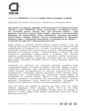 ////////// PROJEKTOR /////////// Sołodki i Pabiś o pornografii + projekcja 23.03, godz. 18, Miejski Punk t Kultury PREXER-UŁ, ul. Pomors ka 39/41 Zapraszamy do dawn ych zak ładów kinotechni czn ych n a kole jne spotkan ie filmowe z cyklu P ROJEKTOR. Temat: pornografia. O przemyśle z doliny San Fernando (zn ane j również jako „San Porn ando Valley”) i jego głębokich korzen iach opowie Pawe ł Sołodki, dok torant kulturoznawstwa zajmujący się ameryk ańskim ki ne m niezależnym. Dyskusję poprowadzi Mi chał Pabiś z Kated ry Mediów i Ku ltury Audiowizualne j UŁ. Następnie pokaże my jeden z naj lepszych dokumentów o prze myśle porno „Rated X – A Journey Through Porn” (www.pornjourney.com). Paweł Sołodki z niewielką pom ocą Micha ła Pabisia opowie o tym, jak zmienia ła się f ilmowa pornograf ia. Przybliży jej historię od krótkich fi lmów wyświ etla nyc h na przełom ie XIX i XX wiek u w palar niach cygar i domach publicznych, poprzez f ilmy w autom atach na żetony i zaplecza księgarń dla dorosłych po produkcje krótk o- i pełnom etrażowe w ki nach XXX oraz prywatnyc h mieszkaniach zaopatrzonych w proj ektor , DVD, telewizję kablową, szerokopasmowy internet lub nowoczesny telefon komórkowy. Jakim sposobem wstydliwa podz iemna r ozrywka sta ła się pr zemysłem generującym ki lkanaście milia rdów dolarów r ocznie (nier zadk o więcej niż Hollywood) ? Pretekstem do spotkania jest publikacja polskieg o przekładu bodaj naj ważniejszej książki o f ilmowej pornograf ii „Hard core. Władza, r ozkosz i „szaleństwo widzialności” (wyd. słowo/obraz terytoria). Wi lliams omawia roz wój pr odukcji pornograf icznych od momentu pows tania ki na aż po współczesność. Przeds tawia odmiany gatunkowe f ilm ów, pokazuje wzory ukazywania scen i k omponowania uj ęć. Kwesti onuje również dogmat, ż e pornograf ia to zjawisko typowo męski e, a wi ęc podporządkowanym męs kiemu spojrzeniu i prymity wnej chęci dyskryminacji kobiet. Pokazuje złożoność problematyki, którą kawiarniani publicyści sprowadzaj do etykiety niec o podziemnej r ozrywki dla heteroseksualnych mężczyzn. Czym jest porno dwi e dekady po ukazaniu się „Hard c ore”? cz łowi ek og lądający f ilmiki popijając piwk o” r óż ni się undergroundoweg o kina? Czy pornograf ia A D 2011 wnosi coś dyskusji, w k tórej niegdyś Robin Morgan zdef i niowała porno gwałt jako praktykę? Czy „młody od widza nowego do jako teori ę, Następny PROJE KTOR już 7 k wietnia. Do Ł odzi przyjedzie prof. Andrzej Gwóźdź, znawca ws półczesnej kultury audi owiz ua lnej. Wraz z dr Blanka Brz ozowską z UŁ dyskutować będą między innymi o tym , jak DVD i inne pozaf ilmowe atrakcj e wpływają na dzisiejs ze kino. Kontakt: Łukasz Biskupski, 502 619 990, lukasz.biskupski@topograf ie.pl Organizator: Stowarzyszenie Topograf ie Partnerzy: Kino Cy tryna Zrealiz owano w ramach sty pendium z budżetu Ministra Kultury i Dziedzic twa Na rodoweg o Mecenasem Miejskiego Punktu Kultury PREXER-UŁ jest Uni wer sytet Ł ódzki