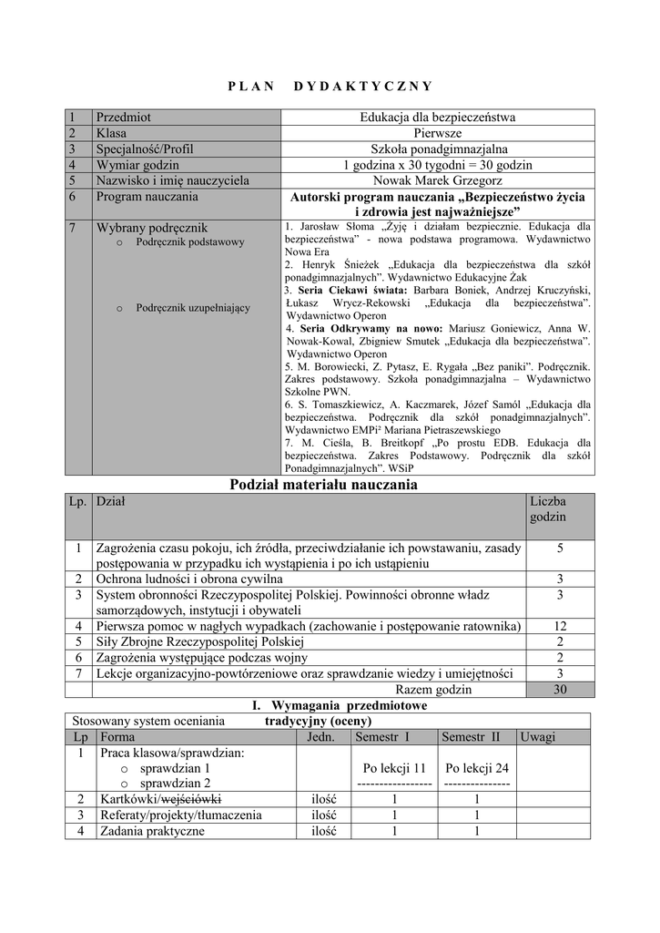 PLAN 1 2 3 4 5 6 Przedmiot Klasa Specjalność/Profil Wymiar godzin Nazwisko i imię nauczyciela Program nauczania 7 Wybrany podręcznik o Podręcznik podstawowy o Podręcznik uzupełniający DYDAKTYCZNY Edukacja dla bezpieczeństwa Pierwsze Szkoła ponadgimnazjalna 1 godzina x 30 tygodni = 30 godzin Nowak Marek Grzegorz Autorski program nauczania „Bezpieczeństwo życia i zdrowia jest najważniejsze” 1. Jarosław Słoma „Żyję i działam bezpiecznie. Edukacja dla bezpieczeństwa” - nowa podstawa programowa. Wydawnictwo Nowa Era 2. Henryk Śnieżek „Edukacja dla bezpieczeństwa dla szkół ponadgimnazjalnych”. Wydawnictwo Edukacyjne Żak 3. Seria Ciekawi świata: Barbara Boniek, Andrzej Kruczyński, Łukasz Wrycz-Rekowski „Edukacja dla bezpieczeństwa”. Wydawnictwo Operon 4. Seria Odkrywamy na nowo: Mariusz Goniewicz, Anna W. Nowak-Kowal, Zbigniew Smutek „Edukacja dla bezpieczeństwa”. Wydawnictwo Operon 5. M. Borowiecki, Z. Pytasz, E. Rygała „Bez paniki”. Podręcznik. Zakres podstawowy. Szkoła ponadgimnazjalna – Wydawnictwo Szkolne PWN. 6. S. Tomaszkiewicz, A. Kaczmarek, Józef Samól „Edukacja dla bezpieczeństwa. Podręcznik dla szkół ponadgimnazjalnych”. Wydawnictwo EMPi² Mariana Pietraszewskiego 7. M. Cieśla, B. Breitkopf „Po prostu EDB. Edukacja dla bezpieczeństwa. Zakres Podstawowy. Podręcznik dla szkół Ponadgimnazjalnych”. WSiP Podział materiału nauczania Lp. Dział Liczba godzin Zagrożenia czasu pokoju, ich źródła, przeciwdziałanie ich powstawaniu, zasady 5 postępowania w przypadku ich wystąpienia i po ich ustąpieniu 2 Ochrona ludności i obrona cywilna 3 3 System obronności Rzeczypospolitej Polskiej. Powinności obronne władz 3 samorządowych, instytucji i obywateli 4 Pierwsza pomoc w nagłych wypadkach (zachowanie i postępowanie ratownika) 12 5 Siły Zbrojne Rzeczypospolitej Polskiej 2 6 Zagrożenia występujące podczas wojny 2 7 Lekcje organizacyjno-powtórzeniowe oraz sprawdzanie wiedzy i umiejętności 3 Razem godzin 30 I. Wymagania przedmiotowe Stosowany system oceniania tradycyjny (oceny) Lp Forma Jedn. Semestr I Semestr II Uwagi 1 Praca klasowa/sprawdzian: o sprawdzian 1 Po lekcji 11 Po lekcji 24 o sprawdzian 2 ----------------- --------------2 Kartkówki/wejściówki ilość 1 1 3 Referaty/projekty/tłumaczenia ilość 1 1 4 Zadania praktyczne ilość 1 1 1 5 6 Odpowiedź ustna ilość 1 1 Konkursy i zawody, udział w dodatkowych Aktywność sposób zajęciach, aktywna praca na lekcji, współprowadzenie lekcji 7 Nieprzygotowanie ilość 1 1 8 Inne – Referaty ilość --------------- -------------Warunki zaliczenia i poprawiania prac pisemnych Warunkiem zaliczenia przedmiotu jest zaliczenie wszystkich sprawdzianów na ocenę pozytywną, co najmniej 50% frekwencja oraz prowadzenie zeszytu przedmiotowego we wskazany sposób. Uczeń ma prawo poprawić sprawdzian w ciągu dwóch tygodni od jego oddania, w terminie podanym przez nauczyciela, ale nie na lekcji merytorycznej. Obowiązuje analiza zawartości wybranych gazet, czasopism i książek związanych z przedmiotem ........................................................ podpis nauczyciela Poznań, dnia 1 września 2016 r. Temat 1: O przedmiocie słów kilka. Bezpieczeństwo i zagrożenia – alarmowanie i ostrzeganie 1. Edukacja dla bezpieczeństwa w szkole ponadgimnazjalnej – działy nauczania a) Zagrożenia czasu pokoju, ich źródła, przeciwdziałanie ich powstawaniu, zasady postępowania w przypadku ich wystąpienia i po ich ustąpieniu – 5 godzin lekcyjnych b) Ochrona ludności i obrona cywilna - 3 godziny lekcyjne c) System obronności Rzeczypospolitej Polskiej. Powinności obronne władz samorządowych, instytucji i obywateli – 3 godziny lekcyjne d) Pierwsza pomoc w nagłych wypadkach (zachowanie i postępowanie ratownika) – 12 godzin lekcyjnych e) Siły Zbrojne Rzeczypospolitej Polskiej – 2 godziny lekcyjne f) Zagrożenia występujące podczas wojny – 2 godziny lekcyjne g) Lekcje organizacyjno-powtórzeniowe oraz sprawdzanie wiedzy i umiejętności – 3 godziny lekcyjne 2. Pojęcie bezpieczeństwa jako potrzeby człowieka 3. Aspekty postrzegania niebezpieczeństw – świadomość bezpieczeństwa 4. Rodzaje alarmów i komunikatów ostrzegawczych – ogłaszanie i odwoływanie 5. Preferowane zachowanie ludzi po ogłoszeniu i odwołaniu alarmu bądź komunikatu Zadanie domowe: Wpisz do zeszytu i naucz się na pamięć 4 zwrotki hymnu, 2 zwrotki Roty i po jednej zwrotce Ody do Radości i Boże coś Polskę Temat 2: Wymagania zaliczeniowe i system oceniania. Zagrożenia indywidualne. Charakterystyka wybranych zagrożeń dnia codziennego 1. Co muszę zrobić, aby zaliczyć przedmiot na ocenę pozytywną? 2. W jaki sposób będę oceniany – moje prawa i obowiązki 3. Działania człowieka zagrażające zdrowiu i życiu 4. Zagrożenia w aspekcie postępu technologicznego 5. Idealny rytm dobowy człowieka i co z niego wynika 6. Sposoby przeciwdziałania zagrożeniom osobistym a) kradzież kieszonkowa b) napad rabunkowy i pobicie c) usiłowanie gwałtu d) uprowadzenie i kidnaping e) odurzenie środkiem psychoaktywnym wbrew woli f) napad na mieszkanie i wtargnięcie napastnika do domu g) zagrożenia płynące z Internetu Zadanie domowe: Przeczytaj z podręcznika strony dotyczące tematu lekcji. Napisz co to znaczy mieć świadomość swojego bezpieczeństwa. Wpisz do zeszytu stopnie wojskowe wojsk lądowych i policyjne oraz naucz się ich na pamięć Temat 3: Zagrożenia zbiorowe. Charakterystyka wybranych zagrożeń dnia codziennego 1. Zagrożenia społeczne i postępowanie zapobiegawcze 2. Internet w aspekcie bezpieczeństwa 3. Sytuacja kryzysowa i stan nadzwyczajny (katastrofa, awaria, wypadek – przyczyny i skutki) 4. Przemoc, agresja, przestępczość 5. Typowe nałogi i uzależnienia psychiczne i społeczne 6. Zagrożenia naturalne i ekologiczne – istotne różnice Zadanie domowe: Przeczytaj z podręcznika strony dotyczące tematu lekcji.