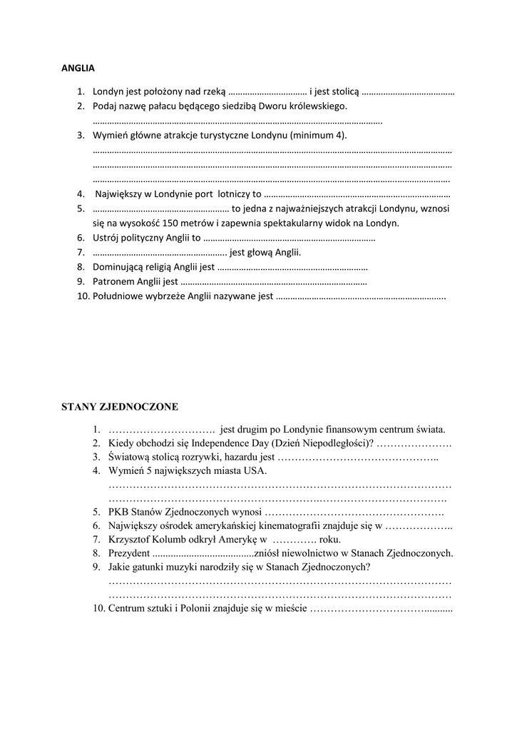 ANGLIA 1. Londyn jest położony nad rzeką …………………………… i jest stolicą ………………………………… 2. Podaj nazwę pałacu będącego siedzibą Dworu królewskiego. …………………………………………………………………………………………………………. 3. Wymień główne atrakcje turystyczne Londynu (minimum 4). …………………………………………………………………………………………………………………………………… …………………………………………………………………………………………………………………………………… ……………………………………………………………………………………………………………….…………………. 4. Największy w Londynie port lotniczy to …………………………………………………………………… 5. ………………………………………………… to jedna z najważniejszych atrakcji Londynu, wznosi się na wysokość 150 metrów i zapewnia spektakularny widok na Londyn. 6. Ustrój polityczny Anglii to ……………………………………………………………… 7. ……………………………………………….. jest głową Anglii. 8. Dominującą religią Anglii jest ……………………………………………………… 9. Patronem Anglii jest …………………………………………………………………… 10. Południowe wybrzeże Anglii nazywane jest …………………………………………………………….. STANY ZJEDNOCZONE …………………………. jest drugim po Londynie finansowym centrum świata. Kiedy obchodzi się Independence Day (Dzień Niepodległości)? …………………. Światową stolicą rozrywki, hazardu jest ……………………………………….. Wymień 5 największych miasta USA. ……………………………………………………………………………………… …………………………………………………….………………………………. 5. PKB Stanów Zjednoczonych wynosi ……………………………………………. 6. Największy ośrodek amerykańskiej kinematografii znajduje się w ……………….. 7. Krzysztof Kolumb odkrył Amerykę w …………. roku. 8. Prezydent .......................................zniósł niewolnictwo w Stanach Zjednoczonych. 9. Jakie gatunki muzyki narodziły się w Stanach Zjednoczonych? ……………………………………………………………………………………… ……………………………………………………………………………………… 10. Centrum sztuki i Polonii znajduje się w mieście ……………………………........... 1. 2. 3. 4.