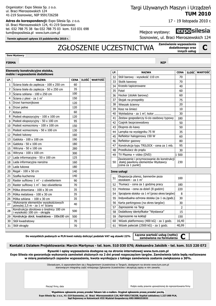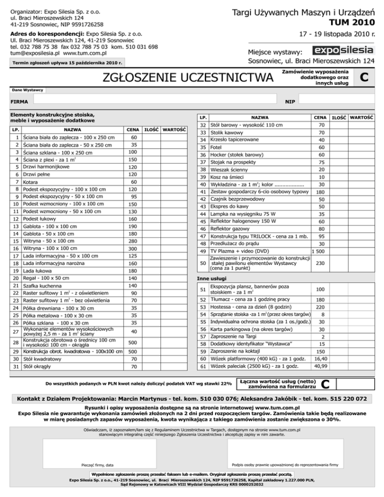 Targi Używanych Maszyn i Urządzeń TUM 2010 Organizator: Expo Silesia Sp. z o.o. ul. Braci Mieroszewskich 124 41-219 Sosnowiec, NIP 9591726258 17 - 19 listopada 2010 r. Adres do korespondencji: Expo Silesia Sp. z o.o. Ul. Braci Mieroszewskich 124, 41-219 Sosnowiec tel. 032 788 75 38 fax 032 788 75 03 kom. 510 031 698 [email protected] www.tum.com.pl Miejsce wystawy: Sosnowiec, ul. Braci Mieroszewskich 124 Termin zgłoszeń upływa 15 października 2010 r. ZGŁOSZENIE UCZESTNICTWA Zamówienie wyposażenia dodatkowego oraz innych usług C Dane Wystawcy NIP FIRMA Elementy konstrukcyjne stoiska, meble i wyposażenie dodatkowe NAZWA LP. LP. CENA 1 Ściana biała do zaplecza - 100 x 250 cm 60 2 Ściana biała do zaplecza - 50 x 250 cm 35 3 Ściana szklana - 100 x 250 cm 4 Ściana z plexi - za 1 m2 5 Drzwi harmonijkowe 100 6 Drzwi pełne 120 7 Kotara 8 Podest ekspozycyjny - 100 x 100 cm 150 120 60 120 ILOŚĆ WARTOŚĆ NAZWA CENA 32 Stół barowy - wysokość 110 cm 70 33 Stolik kawowy 34 Krzesło tapicerowane 70 40 35 Fotel 60 36 Hocker (stołek barowy) 60 37 Stojak na prospekty 75 38 Wieszak ścienny 20 39 Kosz na śmieci 10 40 Wykładzina - za 1 m2; kolor ................... 30 41 Zestaw gospodarczy 6-cio osobowy typowy 42 Czajnik bezprzewodowy 180 9 Podest ekspozycyjny - 50 x 100 cm 10 Podest wzmocniony - 100 x 100 cm 150 43 Ekspres do kawy 50 11 Podest wzmocniony - 50 x 100 cm 130 12 Podest łukowy 35 160 44 Lampka na wysięgniku 75 W 45 Reflektor halogenowy 150 W 13 Gablota - 100 x 100 cm 190 46 Reflektor gazowy 80 14 Gablota - 50 x 100 cm 15 Witryna - 50 x 100 cm 180 95 16 Witryna - 100 x 100 cm 47 Konstrukcja typu TRILOCK - cena za 1 mb. 48 Przedłużacz do prądu 300 17 Lada informacyjna - 50 x 100 cm 125 95 280 18 Lada informacyjna narożna 160 19 Lada łukowa 20 Regał - 100 x 50 cm 180 21 Szafka kuchenna 140 140 2 22 Raster sufitowy 1 m - z oświetleniem 90 50 60 30 49 TV Plazma + video (DVD) 1 500 Zawieszenie i przymocowanie do konstrukcji 230 50 stałej pawilonu elementów Wystawcy (cena za 1 punkt) Inne usługi 51 Ekspozycja plansz, bannerów poza stoiskiem - za 1 m2 100 70 52 Tłumacz - cena za 1 godzinę pracy 180 24 Półka drewniana - 100 x 30 cm 35 53 Hostessa - cena za dzień (8 godzin) 220 25 Półka metalowa - 100 x 30 cm 35 2 54 Sprzątanie stoiska -za 1 m (przez okres targów) 8 26 Półka szklana - 100 x 30 cm Wykonanie elementów wysokościowych 27 powyżej 2,5 m - za 1 m2 ściany Konstrukcja obrotowa o średnicy 100 cm 28 i wysokości 100 cm - okrągła 29 Konstrukcja obrot. kwadratowa - 100x100 cm 35 55 Indywidualna ochrona stoiska (za 1 os./godz.) 30 40 56 Karta parkingowa (na okres targów) 57 Zaproszenie na Targi 30 500 58 Dodatkowy identyfikator “Wystawca” 15 2 23 Raster sufitowy 1 m - bez oświetlenia 500 ILOŚĆ WARTOŚĆ 59 Zaproszenie na koktajl 2 30 Stół kwadratowy 70 60 Wózek platformowy (400 kG) - za 1 godz. 150 16,40 31 Stół okrągły 70 61 Wózek paleciak (2500 kG) - za 1 godz. 40,99 Do wszystkich podanych w PLN kwot należy doliczyć podatek VAT wg stawki 22% Łączna wartość usług (netto) zamówiona na formularzu C Kontakt z Działem Projektowania: Marcin Martynus - tel. kom. 510 030 076; Aleksandra Jakóbik - tel. kom. 515 220 072 Rysunki i opisy wyposażenia dostępne są na stronie internetowej www.tum.com.pl Expo Silesia nie gwarantuje wykonania zamówień złożonych na 2 dni przed rozpoczęciem targów. Zamówienia takie będą realizowane w miarę posiadanych zapasów wyposażenia, kwota wynikająca z takiego zamówienia zostanie zwiększona o 30%. Oświadczam, iż zapoznałem/łam się z Regulaminem Uczestnictwa w Targach, dostępnym na stronie www.tum.com.pl stanowiącym integralną część niniejszego Zgłoszenia Uczestnictwa i akceptuję zapisy w nim zawarte. Pieczęć firmy, data Podpis osoby prawnie upoważnionej do reprezentowania firmy Wypełnione zgłoszenie proszę przesłać faksem lub e-mailem. Oryginał zgłoszenia proszę przesłać pocztą. Expo Silesia Sp. z o.o., 41-219 Sosnowiec, ul. Braci Mieroszewskich 124, NIP 9591726258, Kapitał zakładowy 1.227.000 PLN, Sąd Rejonowy w Katowicach VIII Wydział Gospodarczy KRS 0000252032