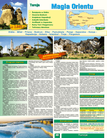 Turcja od 2.849 zł Magia Orientu Bułgaria Świątynia w Didim Gwarne Bodrum Krajobraz Kapadocji Zabytki Istambułu Amfiteatr w Aspendos Ruiny Troi i Pergamonu Tańczący derwisze Morze Czarne Gruzja Istambuł Troja Ankara Kapadocja Pamukkale Didim Bodrum Antalya Turcja Konya Irak Morze Śródziemne Syria 15 dni Didim - Milet - Priene - Bodrum - Efez - Pamukkale - Perge - Aspendos - Konya Kapadocja - Ankara - Istambuł - Troja - Pergamon olobtKeram kowa sasm zawy lu z War Program imprezy 1 dzień Wylot z Warszawy lub Krakowa. Przylot do Bodrum, transfer z lotniska do Didim. Zakwaterowanie w hotelu, nocleg. 2 dzień Po śniadaniu zwiedzanie: Didim - w tym słynnej świątyni Apollina z posągiem Głowy Meduzy, następnie pozostałości Miletu - miasta filozofów: Talesa i Anaksymandra oraz Priene - jednego z najważniejszych miast Związku Jońskiego, ulubionego przez Aleksandra Wielkiego. Kolacja, nocleg w Didim. 3 dzień Po śniadaniu przejazd do Bodrum - dawnego Halikarnasu, gdzie znajdował się jeden z siedmiu cudów starożytnego świata - grobowiec króla Mauzolosa, a obecnie bardzo popularnego i gwarnego kurortu. Zwiedzanie: zamek Krzyżowców oraz port jachtowy. Powrót na kolację i nocleg w Didim. 4 dzień Po śniadaniu przejazd do Efezu, jednego z najlepiej zachowanych miast antycznych na świecie, najważniejszego zabytku archeologicznego i historycznego Turcji. Zwiedzanie: słynna Droga Arkadyjska, do dziś czynny amfiteatr na ok. 25.000 osób oraz przepiękna, odrestaurowana fasada Biblioteki Celsusa. Następnie przejazd do Meryemany - miejsca, w którym ostatnie lata swego życia spędziła Matka Boska. Przyjazd do Pamukkale, kolacja, nocleg. 5 dzień Po śniadaniu zwiedzanie niezwykłych atrakcji Pamukkale - jedynych na świecie śnieżnobiałych tarasów utworzonych przez spływającą od tysiącleci silnie zwapnioną wodę oraz ruin antycznego miasta Hierapolis, założonego w II w. p.n.e. przez króla Pergamonu Eumenesa. Spacer trawertynowym zboczem i możliwość kąpieli w znajdującym się tam basenie Kleopatry z zatopionymi kolumnami. Przejazd w okolice Antalyi. Po drodze zwiedzanie Perge - ze wspaniale zachowanymi fragmentami miasta z okresu rzymskiego: teatr, stadion, agora, bramy. Kolacja, nocleg. 6 dzień Po śniadaniu czas wolny - pobyt wypoczynkowy nad Morzem Śródziemnym. Kolacja, nocleg. 7 dzień Po śniadaniu wyjazd na zwiedzanie Aspendos, ze słynnym, najlepiej zachowanym teatrem antycznym w Anatolii, wzniesionym za panowania Marka Aureliusza. Przejazd do Konyi, miasta słynącego z zakonu wirujących derwiszy, gdzie zobaczymy mauzoleum Mevlany, założyciela zakonu. Przejazd do Kapadocji, zakwaterowanie w hotelu, kolacja, nocleg. 8 dzień Po śniadaniu zwiedzanie baśniowej Kapadocji słynącej z „księżycowego krajobrazu” oraz skalnych grzybów utworzonych w wyniku erozji i dawnej aktywności wulkanicznej. W programie Göreme - dolina w Kapadocji, w której znajduje się Park Narodowy z około 350 kościołami wykutymi w skale, z których najwspanialsze to Kościół św. Barbary Kościół Jabłka, Kościół Tokali, Ciemny Kościół. Zwiedzanie muzeum „Pod Gołym Niebem” oraz miasteczka Avanos słynnego z produkcji garncarstwa. Powrót do hotelu, kolacja, nocleg. 9 dzień Po śniadaniu wyjazd na dalsze zwiedzanie Kapadocji. Odwiedzimy jedno z podziemnych miast wydrążonych w starożytności w tufie wulkanicznym. Składa się ono z wielu tuneli i pomieszczeń, w których miejscowa ludność chroniła się w czasie wojen, często na kilka miesięcy. Ihlara – oaza zieleni w przepięknym wąwozie o pionowych ścianach. Malownicze miasteczko Ürgüp. Powrót do hotelu, kolacja. Po kolacji dla zainteresowanych „noc turecka”. Nocleg. 10 dzień Po śniadaniu wyjazd z Kapadocji. Panoramiczny przejazd przez Ankarę - stolicę Turcji i zwiedzanie Anitkabir – mauzoleum Ataturka. Przyjazd do Istambułu przez most nad Cieśninę Bosfor łączący Europę z Azją. Zakwaterowanie w hotelu, kolacja, nocleg. 11 dzień Po śniadaniu zwiedzanie niezwykłych atrakcji Istambułu: Hagia Sofia (Kościół Mądrości Bożej) - arcydzieło sztuki bizantyjskiej z VI w., a później jedna z najsłynniejszych muzułmańskich świątyń, Błękitny Meczet – najwspanialszy przykład klasycznego okresu sztuki islamskiej, Pałac Sułtański Topkapi - niegdyś polityczne centrum imperium osmańskiego, Hipodrom. Dla chętnych - rejs statkiem po Bosforze. Czas wolny i możliwość zakupów na Wielkim Bazarze - jednym z największych historycznych centrów handlowych Europy (ok. 4000 sklepików). Kolacja, nocleg. 12 dzień Po śniadaniu ciąg dalszy zwiedzania Istambułu: Pałac Sułtański Dolmabahce, a następnie zwiedzanie Muzeum Archeologicznego oraz cystern – podziemnych zbiorników wodnych. Przejazd do miejscowości Gelibolu położonej nad cieśnią Dardanele. Zakwaterowanie w hotelu, kolacja i nocleg. 13 dzień Po śniadaniu przeprawa promowa przez Dardanele i wyjazd w kierunku Didim. Przejazd do Troi - rozsławionej przez Homera dzięki Iliadzie, w której przedstawił ostatnie 40 dni dziesięcioletniej wojny Greków, walczących pod wodzą Agamemnona przeciwko Trojańczykom. Do czasu odkrycia przez Schliemanna pod koniec XIX w. legendarne miasto króla Priama, uchodziło raczej za wymysł twórczego geniuszu Homera niż za poetycką opowieść o realnych wydarzeniach. Zwiedzanie ruin antycznej Troi oraz repliki Konia Trojańskiego. Następnie przejazd do Pergamonu i zwiedzanie dolnego miasta zwanego Asklepiejonem: Święta Droga, świątynia Asklepiosa i Telesfora. Powrót na Riwierę Egejską do Didim, zakwaterowanie w hotelu, kolacja, nocleg. 14 dzień Po śniadaniu wypoczynek po trudach podróży na piaszczystej plaży w Didim-Altinkum. Dla chętnych rejs jachtem po okolicznych zatoczkach i wysepkach. Kolacja, nocleg. 15 dzień Po śniadaniu transfer na lotnisko zgodnie z rozkładem lotów. Wylot z Bodrum. Przylot do Warszawy lub Krakowa. Zakończeni