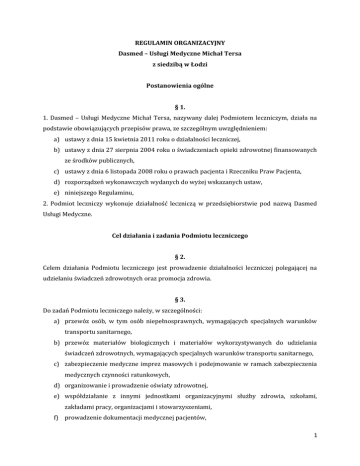 REGULAMIN ORGANIZACYJNY Dasmed – Usługi Medyczne Michał Tersa z siedzibą w Łodzi Postanowienia ogólne § 1. 1. Dasmed – Usługi Medyczne Michał Tersa, nazywany dalej Podmiotem leczniczym, działa na podstawie obowiązujących przepisów prawa, ze szczególnym uwzględnieniem: a) ustawy z dnia 15 kwietnia 2011 roku o działalności leczniczej, b) ustawy z dnia 27 sierpnia 2004 roku o świadczeniach opieki zdrowotnej finansowanych ze środków publicznych, c) ustawy z dnia 6 listopada 2008 roku o prawach pacjenta i Rzeczniku Praw Pacjenta, d) rozporządzeń wykonawczych wydanych do wyżej wskazanych ustaw, e) niniejszego Regulaminu, 2. Podmiot leczniczy wykonuje działalność leczniczą w przedsiębiorstwie pod nazwą Dasmed Usługi Medyczne. Cel działania i zadania Podmiotu leczniczego § 2. Celem działania Podmiotu leczniczego jest prowadzenie działalności leczniczej polegającej na udzielaniu świadczeń zdrowotnych oraz promocja zdrowia. § 3. Do zadań Podmiotu leczniczego należy, w szczególności: a) przewóz osób, w tym osób niepełnosprawnych, wymagających specjalnych warunków transportu sanitarnego, b) przewóz materiałów biologicznych i materiałów wykorzystywanych do udzielania świadczeń zdrowotnych, wymagających specjalnych warunków transportu sanitarnego, c) zabezpieczenie medyczne imprez masowych i podejmowanie w ramach zabezpieczenia medycznych czynności ratunkowych, d) organizowanie i prowadzenie oświaty zdrowotnej, e) współdziałanie z innymi jednostkami organizacyjnymi służby zdrowia, szkołami, zakładami pracy, organizacjami i stowarzyszeniami, f) prowadzenie dokumentacji medycznej pacjentów, 1 Rodzaj działalności leczniczej oraz zakres i miejsce udzielanych świadczeń zdrowotnych § 4. Podmiot leczniczy prowadzi działalność leczniczą w rodzaju: ambulatoryjne świadczenia zdrowotne . § 5. Podmiot leczniczy udziela świadczeń zdrowotnych w zakresie ratownictwa medycznego oraz transportu sanitarnego i transportu medycznego. § 6. 1. Świadczenia zdrowotne, o których mowa w § 5, udzielane mogą być przez Podmiot leczniczy na terenie całego kraju oraz zagranicą. 2. Siedziba przedsiębiorstwa Podmiotu leczniczego mieści się pod adresem: ul. Sosnowa 14/28 93-102 Łódź. 3. Siedziba jednostek i komórek organizacyjnych, o których mowa w § 7, mieści się pod adresem: ul. Marsz. Józefa Piłsudskiego 143 92-332 Łódź Struktura organizacyjna Podmiotu leczniczego § 7. 1. W Podmiocie leczniczym działają następujące jednostki organizacyjne udzielające świadczeń zdrowotnych: a) Zespoły transportu sanitarnego, 2. W ramach jednostki organizacyjnej, o której mowa w ust. 1, w Podmiocie leczniczym działają następujące komórki organizacyjne udzielające świadczeń zdrowotnych: a) Zespół transportu sanitarnego nr 1, Sposób kierowania Podmiotem Leczniczym § 8. 1. Podmiotem leczniczym kieruje jego Właściciel, pełniący funkcję Kierownika Podmiotu. 2. Kierownik Podmiotu podejmuje wszelkie decyzje dotyczące Podmiotu leczniczego. 3. Podczas nieobecności Kierownika Podmiotu zastępuje go upoważniony przez niego pracownik. 4. Do obowiązków Kierownika Podmiotu należy, w szczególności: 2 a) opracowywanie modelu funkcjonalnego Podmiotu leczniczego, dotyczącego organizacji, zatrudnienia kadry medycznej oraz wyposażenia w sprzęt i aparaturę medyczną, b) zapewnienia odpowiedniego poziomu usług w Podmiocie leczniczym, c) zapewnienie stanu porządkowego i higieniczno – sanitarnego pomieszczeń, d) nadzór nad sprawozdawczością medyczna, e) przeprowadzanie okresowych kontroli prawidłowości oraz terminowości wprowadzenia informacji medycznych do sieci informatycznej, f) wydawanie poleceń, udzielanie wskazówek i wytycznych podległym pracownikom w zakresie przydzielonych im zadań służbowych, g) nadzór nad przestrzeganiem przez podległych pracowników ustalonego w Podmiocie leczniczym porządku i dyscypliny pracy oraz tajemnicy służbowej i zawodowej, h) nadzór nad przestrzeganiem przez podległych pracowników reżimu sanitarnego, przepisów przeciwpożarowych oraz zasad bezpieczeństwa i higieny pracy, Organizacja i zadania poszczególnych komórek organizacyjnych Podmiotu leczniczego oraz warunki ich współdziałania § 9. 1. Komórki organizacyjne wymienione w § 7 podlegają bezpośrednio Kierownikowi Podmiotu. 2. Do zadań poszczególnych komórek należy: a) Zespół transportu sanitarnego nr 1 – podejmowanie medycznych czynności ratunkowych, udzielanie towarzyszących świadczeń zdrowotnych z zakresu transportu sanitarnego i medycznego, § 10. Komórki organizacyjne Podmiotu leczniczego oraz osoby wykonujące pracę lub świadczące usługi w ramach tych komórek, obowiązane są do współdziałania dla zapewnienia sprawnego i efektywnego funkcjonowania Podmiotu pod względem diagnostyczno-leczniczym i administracyjno-gospodarczym. Warunki współdziałania z innymi podmiotami wykonującymi działalność leczniczą § 11. 1. Podmiot leczniczy w procesie udzielania świadczeń zdrowotnych może współdziałać z innymi podmiotami wykonującymi działalność leczniczą w rozumieniu ustawy z dnia 15 kwietnia 2011 r. o działalności leczniczej. 3 2. Podmiot leczniczy może podpisywać umowy na wykonywanie usług medycznych z innymi podmiotami wykonującymi działalność leczniczą, jeśli jest to uzasadnione z punktu widzenia ekonomicznego i służy zabezpieczeniu prawidłowego toku udzielania świadczeń zdrowotnych. Przebieg procesu udzielania świadczeń zdrowotnych, w tym również w przypadku pobierania opłat § 12. 1. Proces udzielania świadczeń zdrowotnych powinien przebiegać z zapewnieniem właściwej dostępności i jakości tych świadczeń w komórkach organizacyjnych Podmiotu leczniczego. 2. Podmiot realizuje świadczenia z zakresu transportu medycznego i sanitarnego przez cały tydzień, z zastrzeżeniem wynikającym z ust. 3. 3. Podmiot realizuje świadczenia z zakres