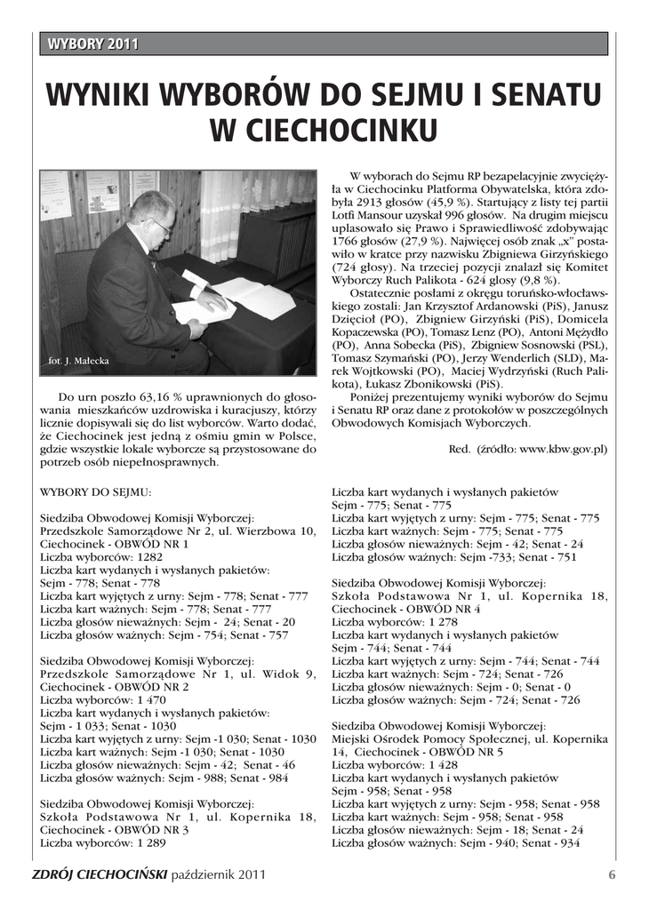 WYBORY 2011 WYNIKI WYBORÓW DO SEJMU I SENATU W CIECHOCINKU fot. J. Ma∏ecka Do urn posz∏o 63,16 % uprawnionych do g∏osowania mieszkaƒców uzdrowiska i kuracjuszy, którzy licznie dopisywali si´ do list wyborców. Warto dodaç, ˝e Ciechocinek jest jednà z oÊmiu gmin w Polsce, gdzie wszystkie lokale wyborcze sà przystosowane do potrzeb osób niepe∏nosprawnych. WYBORY DO SEJMU: Siedziba Obwodowej Komisji Wyborczej: Przedszkole Samorzàdowe Nr 2, ul. Wierzbowa 10, Ciechocinek - OBWÓD NR 1 Liczba wyborców: 1282 Liczba kart wydanych i wys∏anych pakietów: Sejm - 778; Senat - 778 Liczba kart wyj´tych z urny: Sejm - 778; Senat - 777 Liczba kart wa˝nych: Sejm - 778; Senat - 777 Liczba g∏osów niewa˝nych: Sejm - 24; Senat - 20 Liczba g∏osów wa˝nych: Sejm - 754; Senat - 757 Siedziba Obwodowej Komisji Wyborczej: Przedszkole Samorzàdowe Nr 1, ul. Widok 9, Ciechocinek - OBWÓD NR 2 Liczba wyborców: 1 470 Liczba kart wydanych i wys∏anych pakietów: Sejm - 1 033; Senat - 1030 Liczba kart wyj´tych z urny: Sejm -1 030; Senat - 1030 Liczba kart wa˝nych: Sejm -1 030; Senat - 1030 Liczba g∏osów niewa˝nych: Sejm - 42; Senat - 46 Liczba g∏osów wa˝nych: Sejm - 988; Senat - 984 Siedziba Obwodowej Komisji Wyborczej: Szko∏a Podstawowa Nr 1, ul. Kopernika 18, Ciechocinek - OBWÓD NR 3 Liczba wyborców: 1 289 ZDRÓJ CIECHOCI¡SKI paêdziernik 2011 W wyborach do Sejmu RP bezapelacyjnie zwyci´˝y∏a w Ciechocinku Platforma Obywatelska, która zdoby∏a 2913 g∏osów (45,9 %). Startujàcy z listy tej partii Lotfi Mansour uzyska∏ 996 g∏osów. Na drugim miejscu uplasowa∏o si´ Prawo i SprawiedliwoÊç zdobywajàc 1766 g∏osów (27,9 %). Najwi´cej osób znak „x” postawi∏o w kratce przy nazwisku Zbigniewa Girzyƒskiego (724 g∏osy). Na trzeciej pozycji znalaz∏ si´ Komitet Wyborczy Ruch Palikota - 624 glosy (9,8 %). Ostatecznie pos∏ami z okr´gu toruƒsko-w∏oc∏awskiego zostali: Jan Krzysztof Ardanowski (PiS), Janusz Dzi´cio∏ (PO), Zbigniew Girzyƒski (PiS), Domicela Kopaczewska (PO), Tomasz Lenz (PO), Antoni M´˝yd∏o (PO), Anna Sobecka (PiS), Zbigniew Sosnowski (PSL), Tomasz Szymaƒski (PO), Jerzy Wenderlich (SLD), Marek Wojtkowski (PO), Maciej Wydrzyƒski (Ruch Palikota), ¸ukasz Zbonikowski (PiS). Poni˝ej prezentujemy wyniki wyborów do Sejmu i Senatu RP oraz dane z protoko∏ów w poszczególnych Obwodowych Komisjach Wyborczych. Red. (êród∏o: www.kbw.gov.pl) Liczba kart wydanych i wys∏anych pakietów Sejm - 775; Senat - 775 Liczba kart wyj´tych z urny: Sejm - 775; Senat - 775 Liczba kart wa˝nych: Sejm - 775; Senat - 775 Liczba g∏osów niewa˝nych: Sejm - 42; Senat - 24 Liczba g∏osów wa˝nych: Sejm -733; Senat - 751 Siedziba Obwodowej Komisji Wyborczej: Szko∏a Podstawowa Nr 1, ul. Kopernika 18, Ciechocinek - OBWÓD NR 4 Liczba wyborców: 1 278 fot. P. Kucia Liczba kart wydanych i wys∏anych pakietów Sejm - 744; Senat - 744 Liczba kart wyj´tych z urny: Sejm - 744; Senat - 744 Liczba kart wa˝nych: Sejm - 724; Senat - 726 Liczba g∏osów niewa˝nych: Sejm - 0; Senat - 0 Liczba g∏osów wa˝nych: Sejm - 724; Senat - 726 Siedziba Obwodowej Komisji Wyborczej: Miejski OÊrodek Pomocy Spo∏ecznej, ul. Kopernika 14, Ciechocinek - OBWÓD NR 5 Liczba wyborców: 1 428 Liczba kart wydanych i wys∏anych pakietów Sejm - 958; Senat - 958 Liczba kart wyj´tych z urny: Sejm - 958; Senat - 958 Liczba kart wa˝nych: Sejm - 958; Senat - 958 Liczba g∏osów niewa˝nych: Sejm - 18; Senat - 24 Liczba g∏osów wa˝nych: Sejm - 940; Senat - 934 6 Siedziba Obwodowej Komisji Wyborczej: Gimnazjum, ul. Wojska Polskiego 37, Ciechocinek OBWÓD NR 6 Liczba wyborców: 1 349 Liczba kart wydanych i wys∏anych pakietów Sejm - 915; Senat - 915 Liczba kart wyj´tych z urny: Sejm - 915; Senat - 915 Liczba kart wa˝nych: Sejm - 915; Senat - 915 Liczba g∏osów niewa˝nych: Sejm - 31; Senat - 31 Liczba g∏osów wa˝nych: Sejm - 884; Senat - 884 Siedziba Obwodowej Komisji Wyborczej: Gimnazjum, ul. Wojska Polskiego 37 , Ciechocinek OBWÓD NR 7 Liczba wyborców: 2 282 Liczba kart wydanych i wys∏anych pakietów Sejm - 1 376; Senat - 1376 Liczba kart wyj´tych z urny: Sejm - 1 375; Senat -1375 Liczba kart wa˝nych: Sejm - 1 375; Senat - 1375 Liczba g∏osów niewa˝nych: Sejm - 57; Senat - 16 Liczba g∏osów wa˝nych: Sejm - 1 318; Senat - 1358. W Ciechocinku na poszczególne listy okr´gowe na pos∏ów oddano nast´pujàce liczby g∏osów wa˝nych: 1. Komitet Wyborczy Prawo i SprawiedliwoÊç 1766 27,9 % 2. Komitet Wyborczy Polska Jest Najwa˝niejsza 105 1,7 % 3. Komitet Wyborczy Sojusz Lewicy Demokratycznej 576 9,1 % 4. Komitet Wyborczy Ruch Palikota 624 9,8 % 5. Komitet Wyborczy Polskie Stronnictwo Ludowe 232 3,6 % 24 0,4 % 6. Komitet Wyborczy Polska Partia Pracy - Sierpieƒ 80 7. Komitet Wyborczy Platforma Obywatelska RP 2913 45,9 % 9. Komitet Wyborczy Nowa Prawica - Janusza Korwin Mikke 101 1,6 % Wyniki wyborów do Senatu: L.p. 1. 2. 3. 4. Nazwisko i imiona Kierzkowski Henryk ¸yczak Józef Miko∏aj Pawlak Stanis∏aw Person Andrzej Liczba g∏osów wa˝nych oddanych na kandydata 264 1 935 984 3 211 % g∏osów wa˝nych 4,13% fot. J. Ma∏ecka 30,26% 15,39% 50,22% PLAN PRZYJ¢å wyborców i interesantów przez radnych w siedzibie Urz´du Miejskiego (poniedzia∏ki, w godz. 13.00 - 15.00, pokój 12) Adamczyk Grzegorz 03.01.2011r. 11.04.2011r. 25.07.2010r. 07.11.2011r. Bonowicz W∏adys∏aw 10.01.2011r. 18.04.2011r. 01.08.2011r. 14.11.2011r. Draheim Jerzy 17.01.2011r. 02.05.2011r. 08.08.2011r. 21.11.2011r. Drobniewska Klara 24.01.2011r. 09.05.2011r. 22.08.2011r. 28.11.2011r. Jaworski Dariusz 31.01.2011r. 16.05.2011r. 29.08.2011r. 05.12.2011r. KanaÊ Pawe∏ 07.02.2011r. 23.05.2011r. 05.09.2011r. 12.12.2011r. Marjaƒski Wojciech 14.02.2011r. 30.05.2011r. 12.09.2011r. 19.12.2011r. Ró˝aƒski Bartosz 21.02.2011r. 06.06.2011r. 19.09.2011r. Rytter Karolina 28.02.2011r. 13.06.2011r. 26.09.2011r. Satora Miros∏aw 07.03.2011r. 20.06.2011r. 03.10.2011r. Szcz´