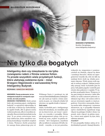 NAJDROŻSZE MIESZKANIA GRZEGORZ STĘPNIEWSKI, Dyrektor Zarządzający www.inteligentny-budynek.pl Inteligentny dom czy mieszkanie to nie tylko rozwiązania rodem z filmów science fiction. To przede wszystkim wiele przydatnych funkcji, które ułatwiają codzienne życie – mówi Grzegorz Stępniewski z warszawskiej firmy Inteligentny Budynek ROZMAWIA: AGNIESZKA WRZESIEŃ NEWSWEEK: Panuje przekonanie, że tzw. inteligentne budynki to rozwiązania szpanerskie, ale mało przydatne. GRZEGORZ STĘPNIEWSKI: Kiedy pytam ludzi, jak rozumieją pojęcie „inteligentny budynek”, to najczęściej odpowiadają, że to taki dom, w którym np. trzeba klasnąć, by zapalić światło, albo że głosem można wydawać polecenia, albo że wszystkim steruje pilot. Rzeczywistość jest jednak trochę inna. To po prostu nowoczesna instalacja elektryczna, która umożliwia wzajemną komunikację wszystkich urządzeń w domu. Wystarczy choćby przyjechać do naszego domu pokazowego przy ul. Wiślanego Nurtu 3 i przekonać się, jak wrzeczywistościdziałatakisystem.Zadampytanie: jak często po wyjściu z domu zastanawia się pani, czy wyłączyła żelazko lub telewizor, czy zgasiła światło w łazience? Dość często. Gdyby wychodziła pani z inteligentnego domu lub mieszkania, nie musiałaby pani ani się denerwować, ani wracać i sprawdzać, czy wszystko w porządku. Można tak zaprogramować system, żeby po wybraniu np. sceny „wyjście” na panelu sterowania – lub w komputerze, smartfonie albo na tablecie (z systemem iOS albo Android) – wszystko, co nie jest potrzebne, 8 Newsweek l u t y 2 0 1 3 wyłączyło się, temperatura w pomieszczeniach się obniżyła, włączył się alarm i symulacja obecności. Można też zaprogramować wszystko tak, żeby nie dało się zamknąć drzwi, kiedy np. żelazko pozostanie włączone. Wtedy system wyśle sygnał, że trzeba je wyłączyć. Załóżmy jeszcze taką sytuację: kiedy wychodziła pani do pracy, była piękna pogoda i zostawiła pani otwarte okno połaciowe w sypialni. W ciągu dnia zaczął padać deszcz. Wystarczy, że ma pani dostęp do internetu i tablet albo telefon, by wydać systemowi polecenie zamknięcia tego okna. Lub system zrobi to sam po otrzymaniu sygnału ze stacji pogodowej. Oczywiście automatykę domową można także zintegrować z systemem alarmowym, np. w przypadku włamania oprócz standardowej sygnalizacji mogą włączyć się pulsujące światła w domu i na posesji, może włączyć się głośna muzyka, a nawet może pojawić się dym, który odstraszy intruzów. A komfort? W tym przypadku funkcje zależą od indywidualnych potrzeb i fantazji klientów. FOT. BALMORAL PROPERTIES Nie tylko dla bogatych NAJDROŻSZE MIESZKANIA montuje się małe panele z przyciskami oraz głośniki. Każdy wybiera swój ulubiony rodzaj muzyki i wszyscy są zadowoleni. Ile to kosztuje? Jeszcze niedawno były to dość kosztowne rozwiązania. Teraz serwer multiroom obsługujący cztery strefy kosztuje już od 7 tys. zł. Ceny głośników mogą być bardzo różne – od 200 zł do nawet kilkunastu tysięcy za komplet. To zależy od preferencji klientów. Nowością są głośniki niewidzialne – o specjalnej budowie, montowane pod tynkiem. Kosztują od 2 tys. zł jeden. Jak działa regulacja temperatury w poszczególnych pomieszczeniach? Tylko po co? No właśnie. Nie każdy ma takie specyficzne potrzeby. System obsługujemy na co dzień z wielofunkcyjnych przycisków. Panel jest tylko dodatkiem, który nie jest niezbędny. Możemy z powodzeniem również sterować domem z telefonu, tabletu lub komputera. Najważniejsze jest to, że po prostu wszystko mamy pod ręką, w każdym miejscu domu i poza nim. Wystarczy nacisnąć jeden, odpowiednio zaprogramowany klawisz, który zrealizuje dowolne funkcje. Nie musimy biegać po całym domu, żeby zasłonić okna czy ustawić temperaturę w pomieszczeniach. Albo jeśli chce pani obejrzeć ulubiony film, wystarczy wybrać scenę „wideo” i rolety się opuszczają, wyjeżdża ekran podwieszony u sufitu, winda z rzutnikiem, światła się przyciemniają. A pani w tym czasie może zaparzyć sobie kawę i wygodnie rozsiąść się na kanapie. SYSTEMY BEZPRZEWODOWE umożliwiają instalacje na każdym etapie powstawania budynku, gdyż ich montaż nie wiąże się z remontami i przeróbkami. Systemem opartym na standardzie radiowym jest polskie rozwiązanie Fibaro. Jego budowa przypomina układ nerwowy: centralka zarządzająca to mózg, elementy wykonawcze to ręce, nogi i mowa, a sensory odpowiadają zmysłom. Dwupokojowe mieszkanie można wyposażyć w Fibaro za mniej więcej 5 tys. zł, a 120-metrowy dom – za ok. 10 tys. zł. Zamiast oglądać film, wolałabym posłuchać płyty jazzowej. Tyle że mąż chce w tym czasie słuchać ostrego rocka, a dziecko ma ochotę na „Pippi Pończoszankę” na MP3. Czy da się nas jakoś pogodzić? Oczywiście. Jest na to sprawdzony sposób – multiroom. To system wielostrefowego nagłośnienia, który pozwala na to, by w jednym czasie w kilku pomieszczeniach jednocześnie można było słuchać różnych rzeczy. Dzięki temu nie trzeba np. w czterech pokojach stawiać czterech różnych odtwarzaczy. Do serwera multiroom podpina się wszystkie źródła, z których chce się korzystać. Płyty audio i wideo najlepiej zgrać na dodatkowy serwer muzyczny (także zintegrowany z multiroomem). W pokojach 10 Newsweek l u t y 2 0 1 3 Słyszałam, że dzięki takiemu zintegrowanemu systemowi zarządzania instalacją można otwierać drzwi, nie podchodząc do domofonu, np. smartfonem, który właśnie jest pod ręką. Tak, to bardzo wygodne. Co więcej, korzystając z wideodomofonu, można np. podczas oglądania telewizji otworzyć drzwi pilotem do telewizora. Może też się zdarzyć taka sytuacja, że jest pani na wakacjach, a do drzwi dzwonią niezapowiedziani goście. Pani widzi to na ekranie telefonu lub tabletu i może z gośćmi porozmawiać, zaprosić