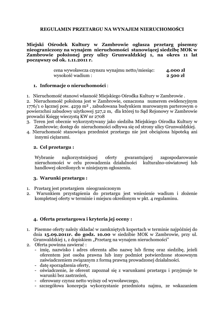 REGULAMIN PRZETARGU NA WYNAJEM NIERUCHOMOŚCI Miejski Ośrodek Kultury w Zambrowie ogłasza przetarg pisemny nieograniczony na wynajem nieruchomości stanowiącej siedzibę MOK w Zambrowie położonej przy ulicy Grunwaldzkiej 1, na okres 11 lat począwszy od ok. 1.11.2011 r. cena wywoławcza czynszu wynajmu netto/miesiąc: wysokość wadium : 4.000 zł 2 500 zł 1. Informacje o nieruchomości : 1. Nieruchomość stanowi własność Miejskiego Ośrodka Kultury w Zambrowie . 2. Nieruchomość położona jest w Zambrowie, oznaczona numerem ewidencyjnym 1776/1 o łącznej pow. 4259 m² , zabudowana budynkiem murowanym parterowym o powierzchni zabudowy użytkowej 527,2 m, dla której to Sąd Rejonowy w Zambrowie prowadzi Księgę wieczystą KW nr 2708 3. Teren jest obecnie wykorzystywany jako siedziba Miejskiego Ośrodka Kultury w Zambrowie; dostęp do nieruchomości odbywa się od strony ulicy Grunwaldzkiej. 4. Nieruchomość stanowiąca przedmiot przetargu nie jest obciążona hipoteką ani innymi ciężarami. 2. Cel przetargu : Wybranie najkorzystniejszej oferty gwarantującej zagospodarowanie nieruchomości w celu prowadzenia działalności kulturalno-oświatowej lub handlowej określonych w niniejszym ogłoszeniu. 3. Warunki przetargu : 1. Przetarg jest przetargiem nieograniczonym 2. Warunkiem przystąpienia do przetargu jest wniesienie wadium i złożenie kompletnej oferty w terminie i miejscu określonym w pkt. 4 regulaminu. 4. Oferta przetargowa i kryteria jej oceny : 1. Pisemne oferty należy składać w zamkniętych kopertach w terminie najpóźniej do dnia 15.09.2011r. do godz. 10.00 w siedzibie MOK w Zambrowie, przy ul. Grunwaldzkiej 1, z dopiskiem „Przetarg na wynajem nieruchomości” 2. Oferta powinna zawierać : - imię, nazwisko i adres oferenta albo nazwę lub firmę oraz siedzibę, jeżeli oferentem jest osoba prawna lub inny podmiot potwierdzone stosownym zaświadczeniem związanym z formą prawną prowadzonej działalności. - datę sporządzenia oferty, - oświadczenie, że oferent zapoznał się z warunkami przetargu i przyjmuje te warunki bez zastrzeżeń, - oferowany czynsz netto wyższy od wywoławczego, - szczegółowa koncepcja wykorzystanie przedmiotu najmu, ze wskazaniem przeprowadzenia koniecznych prac adaptacyjnych przedmiotu najmu. - oświadczenie oferenta zawierające zobowiązanie, że w przypadku wybrania jego oferty będzie on realizował inwestycję zgodnie z przedstawioną koncepcją, a ewentualne odstępstwa od niej będą możliwe jedynie za zgodą Wynajmującego. - aktualny (nie starszy niż 3 miesiące) wypis z właściwego dla oferenta rejestru, (dotyczy osób fizycznych prowadzących działalność gospodarczą, osób prawnych, jak również jednostek organizacyjnych nie posiadających osobowości prawnej, którym ustawa przyznaje zdolność prawną, o których mowa w art. 33¹ KC). - oświadczenie o zapoznaniu się ze wzorem umowy najmu nieruchomości oraz oświadczenie zgody na postanowienia w/w umowy. - podpis oferenta - do oferty należy dołączyć kopię dowodu wniesienia wadium 3. Przetarg ma na celu wybranie najkorzystniejszej oferty wg nw. kryteriów i ich procentowych wag: - zaoferowana cena netto: - 70 % - koncepcja zagospodarowania nieruchomości : - 30 % 4. Przetarg wygra oferta, która uzyska największą sumę punktów, obliczonych wg poniższych zasad: - dla kryterium zaoferowanej ceny, punkty zostaną obliczone wg wzoru : (cena danej oferty : cena najwyższej oferty) x 100 x 0,7 - w kryterium koncepcji zagospodarowania nieruchomości każdy z członków komisji przetargowej przyznaje ofercie maksymalnie 10 punktów, punkty zostaną obliczone wg wzoru: (suma punktów danej oferty : suma punktów oferty najwyżej ocenionej) x 100 x 0,3 5. Pozostałe informacje : 1. 2. 3. 4. 6. 7. Przetarg zostanie przeprowadzony na zasadach wynikających z odpowiedniego zastosowania przepisów rozdziału 4 rozporządzenia Rady Ministrów z dnia 14 września 2004 r. w sprawie sposobu i trybu przeprowadzania przetargów oraz rokowań na zbycie nieruchomości. Termin zgłoszenia uczestnictwa w przetargu : 15.09 2011 r. do godz. 10.00 Lista osób zakwalifikowanych do uczestnictwa w przetargu zostanie wywieszona w dniu 15.09.2011 r. w siedzibie MOK przy ul. Grunwaldzkiej 1 w Zambrowie. Część jawna przetargu w obecności oferentów odbędzie się w dniu 16.09.2011r. o godz. 10.30 w Miejskim Ośrodku Kultury w Zambrowie. W przypadku złożenia równorzędnych ofert zorganizowany zostanie dodatkowy przetarg ustny (licytacja) ograniczony do oferentów, którzy złożyli te oferty Wadium należy wnieść przelewem na rachunek bankowy MOK: BS Zambrów 70 8775 0009 0010 0101 7271 0001 najpóźniej do dnia 25.08.2011r. Za datę wniesienia wadium uważa się datę wpływu wymaganej kwoty na wskazany rachunek bankowy. 8. Wadium zwraca się nie później niż przed upływem trzech dni od dnia odwołania, zamknięcia, unieważnienia lub zakończenia przetargu wynikiem negatywnym, a wniesione przez uczestnika, który przetarg wygra, zalicza się na poczet czynszu. 9. Organizatorowi przetargu przysługuje prawo zamknięcia przetargu bez wybrania którejkolwiek z ofert. 10. Organizator przetargu może odstąpić od zawarcia umowy najmu, jeżeli osoba ustalona jako najemca nieruchomości nie przystąpi bez usprawiedliwienia do zawarcia umowy w miejscu i terminie podanym w zawiadomieniu, a wpłacone wadium nie podlega wówczas zwrotowi. 11. Dodatkowe informacje można uzyskać w sekretariacie MOK przy ul. Grunwaldzkiej 1 w Zambrowie, tel. (86) 271 27 99 12. Niniejsze ogłoszenie wywieszono w siedzibie MOK w Zambrowie i opublikowano na stronie internetowej MOK w Zambrowie oraz BIP.