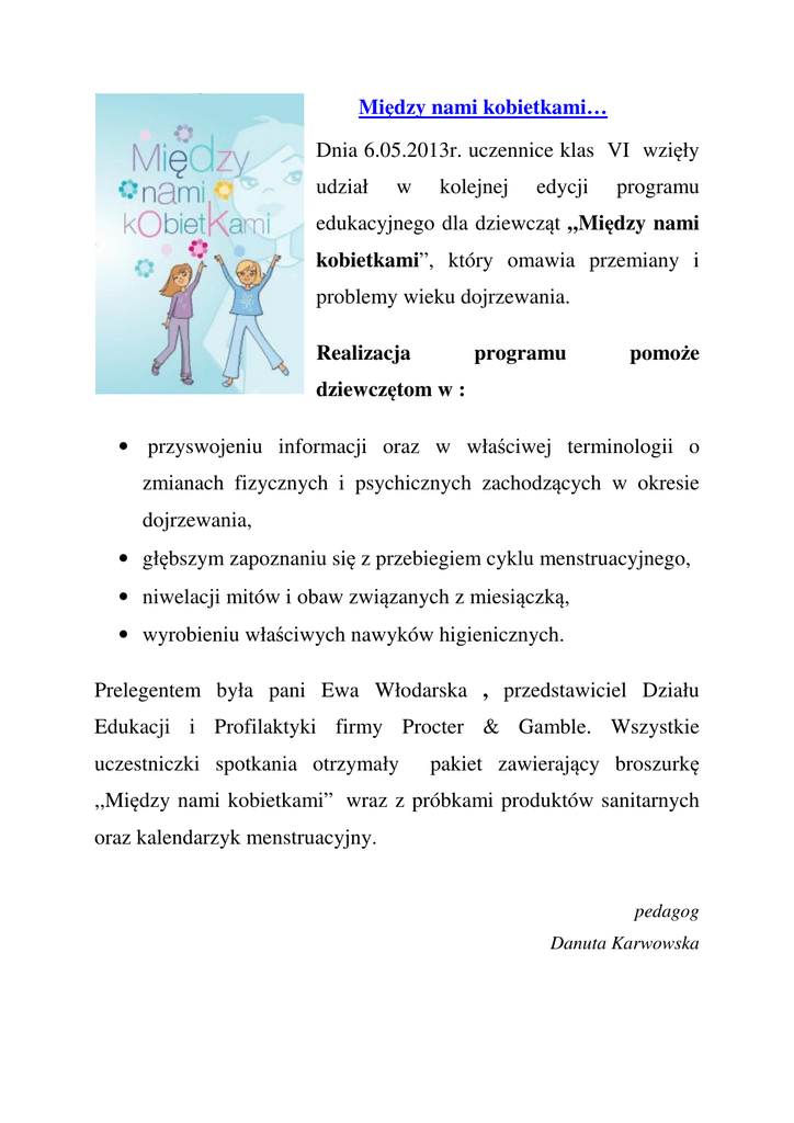 Między nami kobietkami… Dnia 6.05.2013r. uczennice klas VI wzięły udział w kolejnej edycji programu edukacyjnego dla dziewcząt „Między nami kobietkami”, który omawia przemiany i problemy wieku dojrzewania. Realizacja programu pomoże dziewczętom w : • przyswojeniu informacji oraz w właściwej terminologii o zmianach fizycznych i psychicznych zachodzących w okresie dojrzewania, • głębszym zapoznaniu się z przebiegiem cyklu menstruacyjnego, • niwelacji mitów i obaw związanych z miesiączką, • wyrobieniu właściwych nawyków higienicznych. Prelegentem była pani Ewa Włodarska , przedstawiciel Działu Edukacji i Profilaktyki firmy Procter & Gamble. Wszystkie uczestniczki spotkania otrzymały pakiet zawierający broszurkę ,,Między nami kobietkami” wraz z próbkami produktów sanitarnych oraz kalendarzyk menstruacyjny. pedagog Danuta Karwowska