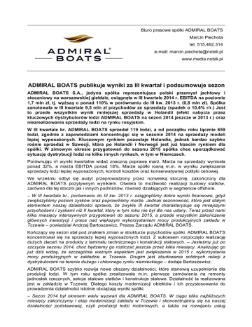 Biuro prasowe spółki ADMIRAL BOATS Marcin Piechota tel. 515.462.314 e-mail: [email protected] www.media.nobili.pl ADMIRAL BOATS publikuje wyniki za III kwartał i podsumowuje sezon ADMIRAL BOATS S.A., jedyna spółka reprezentująca polski przemysł jachtowy i stoczniowy na warszawskiej giełdzie, osiągnęła w III kwartale 2014 r. EBITDA na poziomie 1,7 mln zł, tj. wyższą o ponad 110% w porównaniu do III kw. 2013 r. (0,8 mln zł). Spółka zanotowała w III kwartale 9,5 mln zł przychodów ze sprzedaży (spadek o 10,6% r/r.) Jest to przede wszystkim wynik mniejszej sprzedaży w Holandii (efekt nabycia przez kluczowych dystrybutorów łodzi ADMIRAL BOATS na sezon 2014 jeszcze w 2013 r.) oraz niezrealizowania sprzedaży łodzi na rynku rosyjskim. W III kwartale br. ADMIRAL BOATS sprzedał 119 łodzi, a od początku roku łącznie 659 łodzi, zgodnie z zapowiedziami koncentrując się w sezonie 2014 na sprzedaży modeli lepiej wyposażonych. Kluczowym rynkiem pozostaje Holandia, jednak bardzo szybko rośnie sprzedaż w Szwecji, która po Holandii i Norwegii jest już trzecim rynkiem dla spółki. W zimowym okresie przygotowań do sezonu 2015 spółka chce uporządkować sytuację dystrybucji łodzi na kilku innych rynkach, w tym w Niemczech. Porównując r/r wyniki kwartalne widać znaczną poprawę marż. Marża na sprzedaży wyniosła ponad 32%, a marża EBITDA ponad 18%. Marże spółki rosną m.in. w wyniku zwiększania sprzedaży łodzi lepiej wyposażonych, kontroli kosztów oraz konserwatywnej polityki cenowej. We wrześniu odbył się audyt przeprowadzony przez norweską stocznię, zakończony dla ADMIRAL BOATS pozytywnym wynikiem. Otwiera to możliwość realizacji budowy statków, zarówno dla tej stoczni jak i innych podmiotów, również działających w segmencie offshore. – W III kwartale br., porównaniu do III kw. 2013 r. osiągnęliśmy dobre wyniki finansowe, gdyż zwiększyliśmy poziom zysków oraz poprawiliśmy marże. Jednak sezonowość, która jest stałym elementem naszej działalności sprawia, że zwykle III kwartał charakteryzuje się mniejszymi przychodami i zyskami niż II kwartał, który w tym roku nie był dla nas udany. Teraz przed nami kilka miesięcy intensywnych przygotowań do sezonu 2015, a przede wszystkim zakończenie głównych inwestycji i praca nad większym wykorzystaniem mocy produkcyjnych zakładu w Tczewie – powiedział Andrzej Bartoszewicz, Prezes Zarządu ADMIRAL BOATS. Kończący się sezon stał pod znakiem zmian w strukturze przychodów spółki. ADMIRAL BOATS koncentrował się na sprzedaży lepiej wyposażonych łodzi. Z sukcesem rozpoczęto realizację dużych zleceń na produkty z laminatu technicznego i konstrukcji stalowych. – Jesteśmy już po szczycie sezonu 2014, choć będziemy go rozliczać jeszcze przez kilka miesięcy. Analizując go już dziś widzę, że szczególnie ważnym aspektem jest zwiększenie w 2015 r. wykorzystania mocy produkcyjnych w zakładzie w Tczewie. Drugim jest zbudowanie solidnych relacji z dystrybutorami na terenie dużego i chłonnego rynku niemieckiego – dodaje Bartoszewicz. ADMIRAL BOATS szybko rozwija nowe obszary działalności, które stanowią uzupełnienie dla produkcji łodzi. W tym roku spółka zrealizowała m.in. pierwsze zamówienia na remonty jednostek rzecznych, sekcje stalowe statków i konstrukcje stalowe. Działalność ta realizowana jest w zakładzie w Tczewie. Dlatego koszty modernizacji obiektów i ich przystosowania do prowadzenia działalności istotnie obciążają wyniki spółki. – Sezon 2014 był okresem wielu wyzwań dla ADMIRAL BOATS. W ciągu kilku najbliższych miesięcy zakończymy I etap modernizacji zakładu w Tczewie i skoncentrujemy się na naszej działalności podstawowej, czyli produkcji łodzi motorowych, a także na rozwijaniu usług ADMIRAL BOATS S.A. strona 2 uzupełniających, tj. produkcji laminatu technicznego, remontach jednostek rzecznych oraz wytwarzaniu konstrukcji stalowych. Istotne oszczędności przyniesie nam zakończenie przenoszenia produkcji z wynajmowanych hal w miejscowości Kamień k. Gdyni do zakładu w Tczewie. W segmencie łodzi motorowych będziemy się koncentrować na sprzedaży lepiej wyposażonych modeli, na których realizujemy wyższe marże – podsumował Bartoszewicz. ________________________________________ O ADMIRAL BOATS ADMIRAL BOATS S.A., spółka produkująca łodzie motorowe, a także laminat techniczny i konstrukcje stalowe oraz wykonująca remonty dużych jednostek rzecznych jest jedynym reprezentantem polskiego przemysłu jachtowego i stoczniowego notowanym na rynku kapitałowym. Od lipca 2011 r. akcje spółki są notowane na rynku NewConnect, a obligacje na rynku Catalyst. W sierpniu 2014 r. Komisja Nadzoru Finansowego zatwierdziła prospekt emisyjny spółki w związku z planami przeniesienia notowań akcji na rynek podstawowy Giełdy Papierów Wartościowych. Strategicznym akcjonariuszem posiadającym największy pakiet akcji jest Pan Wiesław Kleba, który wraz z rodziną posiada 35,03% kapitału zakładowego, uprawniających do takiego samego udziału w głosach na walnym zgromadzeniu spółki. Od momentu zawiązania spółki w 2010 r. ADMIRAL BOATS stale rozwija i poszerza swoją działalność. Aktualnie, poza produkcją i dystrybucją łodzi motorowych spółka produkuje również laminat techniczny i konstrukcje stalowe, a także remontuje duże jednostki rzeczne. W planach jest rozpoczęcie produkcji jednostek rzecznych (barki, lodołamacze i pchacze) oraz produkcja wyrobów z aluminium. Polska posiada bogatą tradycję w produkcji jachtów i małych łodzi, a polscy konstruktorzy od wielu lat cieszą się międzynarodowym uznaniem. Szacuje się, że potencjał polskich stoczni, to produkcja około 22.000 jednostek pływających rocznie. Pod względem liczby wyprodukowanych łodzi motorowych do 9 metrów długości polskie stocznie są na drugim miejscu na świecie, za stoczniami ze St. Zjedn