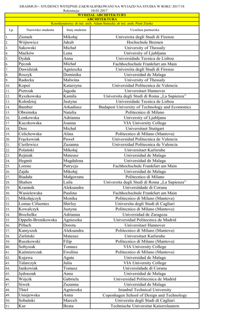 ERASMUS+: STUDENCI WSTĘPNIE ZAKWALIFIKOWANI NA WYJAZD NA STUDIA W ROKU 2017/18 Rekrutacja: 10.01.2017 WYDZIAŁ ARCHITEKTURY ARCHITEKTURA Koordynatorzy: dr inż. arch. Adam Siniecki; dr inż. arch. Piotr Zierke Lp. 1. 2. 3. 4. 5. 6. 7. 8. 9. 10. 11. 12. 13. 14. 15. 16. 17. 18. 19. 20. 21. 22. 23. 24. 25. 26. 27. 28. 29. 30. 31. 32. 33. 34. 35. 36. 37. 38. 39. 40. 41. 42. 43. 44. 45. 46. 47. 48. 49. 50. 51. Nazwisko studenta Ziomek Wójtowicz Sakowski Maćków Dydak Pęczak Dawidziak Roszyk Radecka Kopeć Pietrzak Ryszkowska Kołodziej Bamber Obremska Lenkowska Kuczkowska Derc Celichowska Frąckowiak Cieślewicz Polański Rejniak Hegmit Lorenc Zajda Biadała Shahen Kramnik Wasielewska Mikołajczyk Lomas Cifuentes Kowalczyk Brechelke Oppeln-Bronikowska Pillach Kamyszek Zieliński Ruszkowski Sołtysiak Kaźmierczak Kujawa Talarczyk Jankowiak Jędraszak Wójcik Siwek Thiel Uniejewska Sobański Kur Imię studenta Mikołaj Jakub Michał Lena Anna Michał Agnieszka Dominika Malwina Katarzyna Jagoda Kamila Justyna Arkadiusz Natalia Adrianna Joanna Michał Alina Paweł Zuzanna Mikołaj Mateusz Magdalena Patrycja Mikołaj Małgorzata Laila Aleksandra Paulina Monika Shirley Justyna Adrianna Agnieszka Dorota Aleksandra Mateusz Filip Tomasz Ewelina Agata Julia Tomasz Anna Gabriela Zuzanna Agnieszka Anna Marceli Beata Uczelnia partnerska Universita degli Studi di Firenze Hochschule Bremen University of Thessaly University of Ljubljana Universidade Tecnica de Lisboa Fachhochschule Frankfurt am Main Universita degli Studi di Firenze Universidad de Malaga University of Thessaly Universidad Politecnica de Valencia Universitaet Hannover Universita degli Studi di Roma „La Sapienza” Universidade Tecnica de Lisboa Budapest University of Technology and Ecomonics Politecnico di Milano University of Ljubljana VIA University College Universitaet Stuttgart Politecnico di Milano (Mantova) Universidad Politecnica de Valencia Universidad Politecnica de Valencia Universitaet Karlsruhe Universidad de Malaga Universidad de Malaga Fachhochschule Frankfurt am Main Universidad de Malaga Politecnico di Milano Universita degli Studi di Roma „La Sapienza” Universitdade di Coruna Fachhochschule Frankfurt am Main Politecnico di Milano (Mantova) Universita degli Studi di Cagliari Politecnico di Milano (Mantova) Universidad de Zaragoza Universidad Politecnica de Madrid Universitaet Hannover Politecnico di Milano (Mantova) Universitaet Karlsruhe Politecnico di Milano (Mantova) VIA University College Politecnico di Milano (Mantova) Universidad de Malaga VIA University College Universitdade di Coruna Universidad de Malaga Universidad Politecnica de Madrid Universidad de Malaga Istanbul Technical University Copenhagen School of Design and Technology Universita degli Studi di Cagliari Technische Universitat Kaiserslautern 52. 53. 54. 55. 56. 57. 58. 59. 60. 61. 62. 63. 64. 65. 66. 67. 68. 69. 70. 71. 72. 73. 74. 75. 76. 77. 78. 79. 80. 81. 82. 83. 84. 85. Wybieralska Rybakowska Gancarek Ogrodzka Olek Borowik Morawczyńska Czarnecka Jurdzińska Gizelska Szczepaniak Vitynska Priefer Gmaj Drapała Grzybowska Hondo Gołaszewska Cichecka Skorupa Paszek Pańczyk Michalska Głąbowska Szymańska Mierzwa Weryńska Galuba Kurzawa Grodzicki Palczowska Lubiszewska rezerwacja WAPP rezerwacja WAPP Małgorzata Maria Katarzyna Kamila Katarzyna Oksana Agata Agata Marta Joanna Anna Anastasiia Magdalena Agnieszka Anna Kinga Michał Klaudia Katarzyna Amanda Kamil Piotr Monika Daria Agnieszka Ewa Daria Aneta Grzegorz Marek Magda Martyna Universidad Politecnica de Madrid Politecnico di Bari Universidad de Malaga Politecnico di Bari VIA University College Brandenburgische Technische Universitaet Cottbus Universitaet Stuttgart Universidad de Zaragoza Technische Universitat Kaiserslautern Brno University of Technology Universitaet Karlsruhe Universita degli Studi di Roma „La Sapienza” Universitaet Karlsruhe TU Dortmund University Brandenburgische Technische Universitaet Cottbus Brandenburgische Technische Universitaet Cottbus Brandenburgische Technische Universitaet Cottbus Universitaet Hannover Universitaet Hannover TU Dortmund University Hochschule Regensburg Artesis University College Antwerp Institut National des Sciences Appliquees de Strasbourg Hochschule Regensburg Brno University of Technology Institut National des Sciences Appliquees de Strasbourg Ecole Nationale Superieure d'Architecture de Nancy Ecole Nationale Superieure d'Architecture de Nancy Technische Universitat Dortmund Technische Universitat Dortmund Ecole Nationale Superieure d'Architecture de Bretagne Ecole Nationale Superieure d'Architecture de Bretagne Brandenburgische Technische Universitaet Cottbus Brandenburgische Technische Universitaet Cottbus