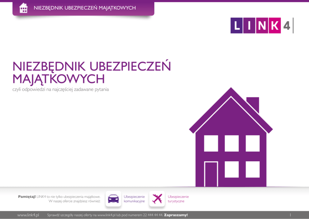 NIEZBĘDNIK UBEZPIECZEŃ MAJĄTKOWYCH NIEZBĘDNIK UBEZPIECZEŃ MAJĄTKOWYCH czyli odpowiedzi na najczęściej zadawane pytania Pamiętaj! LINK4 to nie tylko ubezpieczenia majątkowe. W naszej ofercie znajdziesz również: www.link4.pl Ubezpieczenie komunikacyjne Ubezpieczenie turystyczne Sprawdź szczegóły naszej oferty na www.link4.pl lub pod numerem 22 444 44 44. Zapraszamy! 1 NIEZBĘDNIK UBEZPIECZEŃ MAJĄTKOWYCH SZANOWNI KLIENCI Oto Niezbędnik Ubezpieczeń Majątkowych, który przygotowaliśmy dla Państwa wygody. Znajdą w nim Państwo odpowiedzi na pytania najczęściej zadawane przez naszych Klientów. Dzięki niemu większość pozornie trudnych zagadnień ubezpieczeniowych stanie się jasna. Równocześnie informujemy, że nasz Niezbędnik wraz z całą serią przydatnych dokumentów znajdą Państwo na stronie internetowej www.link4.pl. Zapraszamy do lektury! www.link4.pl 2 NIEZBĘDNIK UBEZPIECZEŃ MAJĄTKOWYCH JAK KONTAKTOWAĆ SIĘ Z LINK4? Mogą Państwo wybrać najwygodniejszy dla siebie sposób z następujących czterech: • poprzez e-mail ([email protected]), • za pomocą formularza na stronie www.link4.pl, • telefonicznie (22 444 44 44), • poprzez live czat. www.link4.pl 3 NIEZBĘDNIK UBEZPIECZEŃ MAJĄTKOWYCH 1. Kiedy dostanę dokumenty papierowe? Dokumenty elektroniczne wysłane na adres e-mail są pełnoprawnymi dokumentami ubezpieczeniowymi; należy je wydrukować lub zachować w skrzynce mailowej. 2. Mam błąd w polisie, co robić? Prosimy o niezwłoczne skontaktowanie się z nami. Wszystkie zastrzeżenia co do zapisów umowy należy zgłosić w ciągu 7 dni od otrzymania polisy. 3. Gdzie znajdę numer konta do wpłaty kolejnej raty? Numer konta przez cały rok pozostaje ten sam dla każdej kolejnej raty. Znajdziecie go Państwo na dokumencie polisy (formatu A4). 4. Opłacałem polisę kartą kredytową, w jaki sposób mam opłacić kolejną ratę? Jeżeli pierwszą ratę opłacili Państwo kartą kredytową, to każdą kolejną LINK4 pobierze z Państwa karty automatycznie. Gdyby dane karty uległy zmianie, prosimy o skontaktowanie się z nami. 5. Czy trzeba potwierdzać dokonanie płatności kolejnej raty? Nie, nie trzeba. LINK4 automatycznie odnotowuje wpłaty. Jeżeli nie odnotujemy wpłaty, sami skontaktujemy się z Państwem. www.link4.pl 4 NIEZBĘDNIK UBEZPIECZEŃ MAJĄTKOWYCH 6. Co robić, jeśli zmieniłem adres, nr telefonu, e-mail? O wszelkich zmianach mogą Państwo nas poinformować w najbardziej wygodny dla siebie sposób: • poprzez e-mail ([email protected]), • za pomocą formularza na stronie www.link4.pl, • telefonicznie (22 444 44 44). Warto pamiętać, żeby poinformować nas o zmianie danych kontaktowych. Dzięki temu my będziemy mogli informować Państwa: • o terminie płatności kolejnych rat (wysyłamy przypomnienie SMS-em i e-mailem), • o końcu polisy oraz ofercie na kolejny rok (dzwonimy lub przesyłamy pocztą aktualną ofertę). O zmianach pozostałych danych zapisanych w polisie mogą Państwo nas poinformować w ten sam sposób. Wprowadzimy zmiany do dokumentów i prześlemy aneks do umowy. 7. Kiedy i jak otrzymam zwrot składki z ubezpieczeń dobrowolnych po sprzedaży nieruchomości? W ciągu 14 dni należy zgłosić nam sprzedaż i podać numer konta, a my niezwłocznie rozliczymy i prześlemy na konto należny zwrot składki za opłacony, ale niewykorzystany okres ochrony. www.link4.pl 5 NIEZBĘDNIK UBEZPIECZEŃ MAJĄTKOWYCH 8. Kiedy dostanę informację, że czas odnowić polisę? Doradca opiekujący się Państwa polisą skontaktuje się w odpowiednim terminie i przypomni o kończącym się ubezpieczeniu. 9. Co robić w razie wystąpienia szkody/wypadku? Jak najszybciej skontaktować się z naszym Konsultantem pod numerem 22 444 44 44, który już przy pierwszym kontakcie doradzi, jak postąpić i zorganizuje pomoc. Przypominamy, że LINK4 to nie tylko ubezpieczenia majątkowe. ! Zachęcamy do zapoznania się z atrakcyjną ofertą ubezpieczeń komunikacyjnych i turystycznych w LINK4. Nasze produkty oraz zakres ochrony ubezpieczeniowej mogą Państwo poznać na stronie internetowej ! www.link4.pl lub dzwoniąc pod numer telefonu 22 444 44 44. Zapraszamy! www.link4.pl 6 NIEZBĘDNIK UBEZPIECZEŃ MAJĄTKOWYCH DZIĘKUJEMY Mamy nadzieję, że nasze rady okazały się pomocne. W razie jakichkolwiek pytań odwiedź naszą nową stronę internetową, gdzie możesz porozmawiać z wirtualnym doradcą Magdą lub uzyskać odpowiedź on-line podczas rozmowy z Doradcą na czacie. Bądź z nami na bieżąco: BLOG http://www.facebook.com/link4 http://www.youtube.com/user/link4 http://www.link4.pl/blog Skontaktuj się z nami telefonicznie: www.link4.pl Numer dla telefonów komórkowych (opłata według taryfy operatora) Numer dla telefonów stacjonarnych (opłata według taryfy operatora) Jesteś naszym Klientem? Zadzwoń pod specjalny numer (opłata według taryfy operatora) 605 444 444 0 801 444 444 (22) 444 44 44 pn.–pt. 8–22 sob.–niedz. 8–18 pn.–pt. 8–22 sob.–niedz. 8–18 pn.–pt. 8–22, sob.–niedz. 8–18 Pomoc Assistance 24 h. 7
