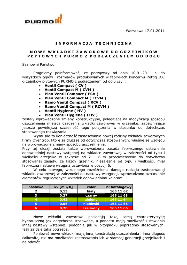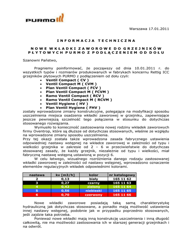 Warszawa 17.01.2011 INFORMACJA TECHNICZNA NOWE WKŁADKI ZAWOROWE DO GRZEJNIKÓW PŁYTOWYCH PURMO Z PODŁĄCZENIEM OD DOŁU Szanowni Państwo, Pragniemy poinformować, że począwszy od dnia 10.01.2011 r. do wszystkich typów i rozmiarów produkowanych w fabrykach koncernu Rettig ICC grzejników płytowych PURMO z podłączeniem od dołu czyli: Ventil Compact ( CV ) Ventil Compact M ( CVM ) Plan Ventil Compact ( FCV ) Plan Ventil Compact M ( FCVM ) Ramo Ventil Compact ( RCV ) Ramo Ventil Compact M ( RCVM ) Ventil Hygiene ( HV ) Plan Ventil Hygiene ( FHV ) zostały wprowadzone zmiany konstrukcyjne, polegające na modyfikacji sposobu uszczelnienia miejsca osadzenia wkładki zaworowej w grzejniku, zapewniające jeszcze pewniejszą szczelność tego połączenia w stosunku do dotychczas stosowanego rozwiązania. Wymusiło to konieczność zastosowania nowej rodziny wkładek zaworowych firmy Oventrop, które są dłuższe od dotychczas stosowanych, właśnie ze względu na wprowadzone zmiany sposobu uszczelnienia. Przy tej okazji została także wprowadzona zasada fabrycznego ustawienia odpowiedniej nastawy wstępnej na wkładce zaworowej w zależności od typu i wielkości grzejnika w zakresie od 2 – 6 w przeciwieństwie do dotychczas stosowanej zasady, że każdy grzejnik, niezależnie od typu i wielkości, miał fabryczną nastawę wstępną ustawioną w pozycji 6. W celu łatwego, wizualnego rozróżnienia danego rodzaju zastosowanej wkładki zaworowej w zależności od nastawy wstępnej, wprowadzono oznaczenie elementów regulacyjnych wkładek odpowiednimi kolorami. nastawa 2 3 4 5 6 kv [m3/h] 0,13 0,27 0,42 0,56 0,70 kolor biały czarny zielony niebieski czerwony nr katalogowy 165 11 62 165 11 63 165 11 64 165 11 65 165 11 66 Nowe wkładki zaworowe posiadają taką samą charakterystykę hydrauliczną jak dotychczas stosowane, a ponadto mają możliwość ustawienia innej nastawy wstępnej, podobnie jak w przypadku poprzednio stosowanych, jeśli zajdzie taka potrzeba. Ponieważ nowe wkładki mają inną konstrukcję uszczelnienia i inną długość całkowitą, nie ma możliwości zastosowania ich w starszej generacji grzejnikach i na odwrót. Dla ułatwienia rozróżnienia grzejników z nowym rodzajem uszczelnienia od grzejników starszego typu przedstawiono poniżej zdjęcia wnętrz gniazd zaworowych obu typów. Gniazdo zaworowe nowego typu ( brak mosiężnego pierścienia uszczelniającego ) – przystosowane do montażu nowej wkładki zaworowej poniżej: gniazdo zaworowe starego typu ( z mosiężnym pierścieniem uszczelniającym ) – przystosowane do montażu starej wkładki zaworowej Poniżej przedstawiono zdjęcie pokazujące podstawowe różnice w wyglądzie starej wkładki zaworowej ( pierwsza od lewej ) jak i nowe wkładki zaworowe z kolorowymi elementami nastawczymi ( po prawej ). Zastosowane zmiany konstrukcyjne nie wpłynęły na zmianę cen grzejników. Z poważaniem Roman Strzelczyk Kierownik Działu Technicznego Rettig Heating Sp. z o.o. ul. Rtm. Pileckiego 91 02-781 Warszawa Załączniki: Tablica zastosowania nowych wkładek termostatycznych w zależności od typu i wielkości grzejników