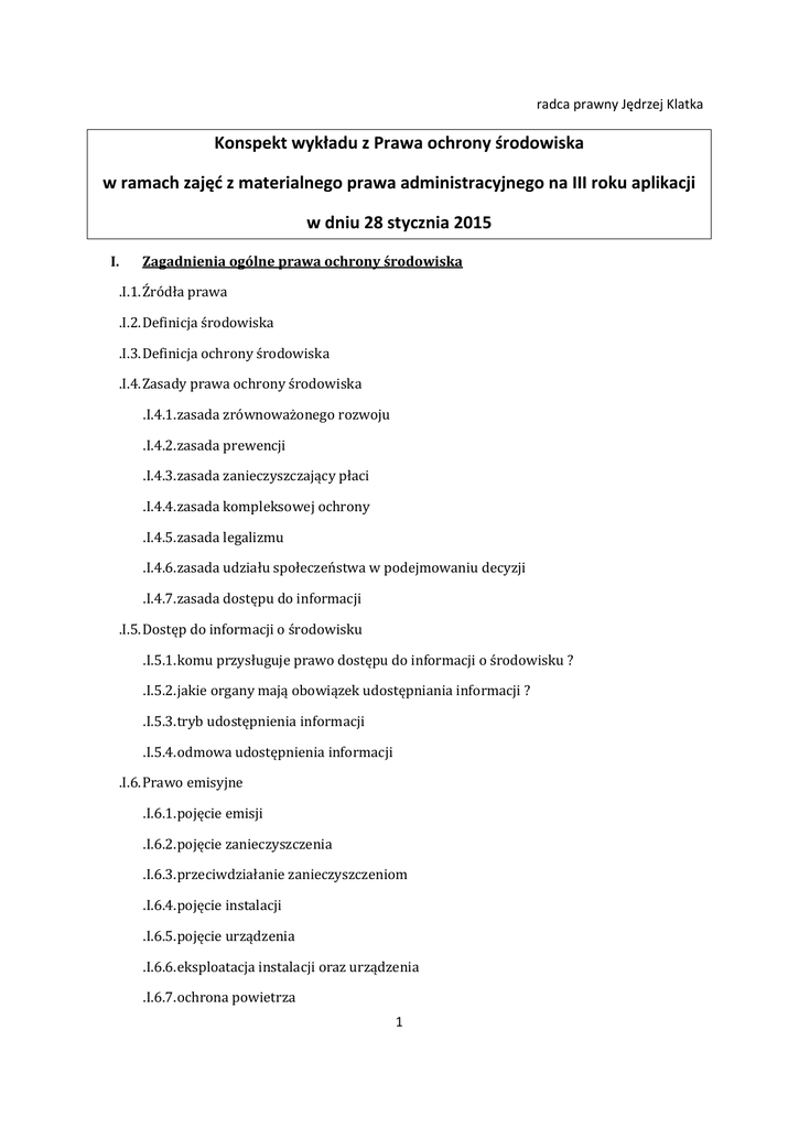 Konspekt wykładu z Prawa ochrony środowiska w ramach zajęć z