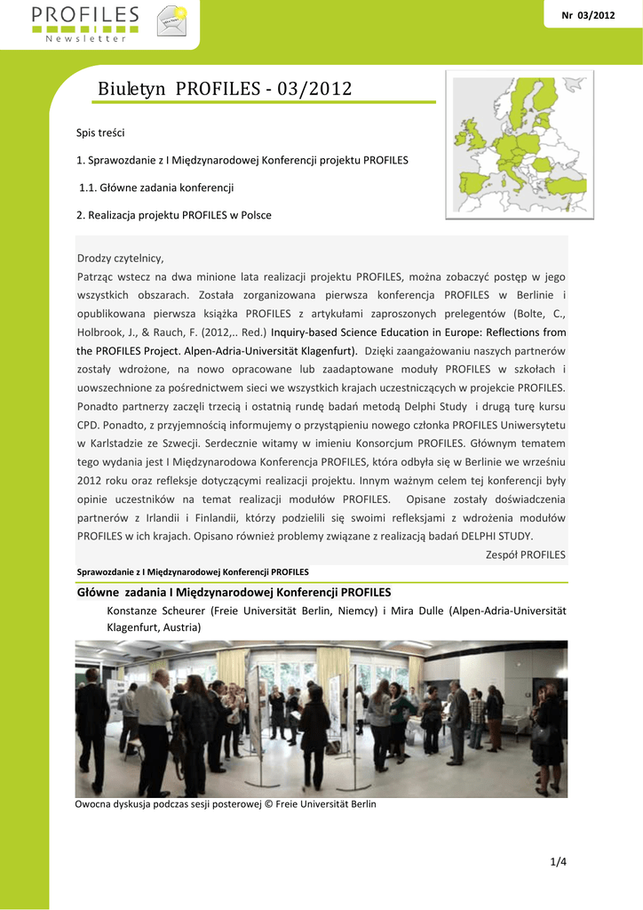 Nr 03/2012 Biuletyn PROFILES - 03/2012 Spis treści 1. Sprawozdanie z I Międzynarodowej Konferencji projektu PROFILES 1.1. Główne zadania konferencji 2. Realizacja projektu PROFILES w Polsce Drodzy czytelnicy, Patrząc wstecz na dwa minione lata realizacji projektu PROFILES, można zobaczyć postęp w jego wszystkich obszarach. Została zorganizowana pierwsza konferencja PROFILES w Berlinie i opublikowana pierwsza książka PROFILES z artykułami zaproszonych prelegentów (Bolte, C., Holbrook, J., & Rauch, F. (2012,.. Red.) Inquiry-based Science Education in Europe: Reflections from the PROFILES Project. Alpen-Adria-Universität Klagenfurt). Dzięki zaangażowaniu naszych partnerów zostały wdrożone, na nowo opracowane lub zaadaptowane moduły PROFILES w szkołach i uowszechnione za pośrednictwem sieci we wszystkich krajach uczestniczących w projekcie PROFILES. Ponadto partnerzy zaczęli trzecią i ostatnią rundę badań metodą Delphi Study i drugą turę kursu CPD. Ponadto, z przyjemnością informujemy o przystąpieniu nowego członka PROFILES Uniwersytetu w Karlstadzie ze Szwecji. Serdecznie witamy w imieniu Konsorcjum PROFILES. Głównym tematem tego wydania jest I Międzynarodowa Konferencja PROFILES, która odbyła się w Berlinie we wrześniu 2012 roku oraz refleksje dotyczącymi realizacji projektu. Innym ważnym celem tej konferencji były opinie uczestników na temat realizacji modułów PROFILES. Opisane zostały doświadczenia partnerów z Irlandii i Finlandii, którzy podzielili się swoimi refleksjami z wdrożenia modułów PROFILES w ich krajach. Opisano również problemy związane z realizacją badań DELPHI STUDY. Zespół PROFILES Sprawozdanie z I Międzynarodowej Konferencji PROFILES Główne zadania I Międzynarodowej Konferencji PROFILES Konstanze Scheurer (Freie Universität Berlin, Niemcy) i Mira Dulle (Alpen-Adria-Universität Klagenfurt, Austria) Owocna dyskusja podczas sesji posterowej © Freie Universität Berlin 1/4 Nr 03/2012 W dniach od 24 do 26 września 2012 r. w forum: Niemczech na Freie Universität w Berlinie Ilmars Rikmanis z Łotwy, Funda Tunaboylu i odbyła się I Międzynarodowa Konferencja Simge Akpullukcu z Turcji zaprezentowali PROFILES. Wyrażamy naszą wdzięczność dla swoje doświadczenia z realizacji modułów zespołu Freie Universität w Berlinie, który PROFILES. zorganizował udaną konferencję PROFILES. Interaktywna sesja posterowa odbyła z przy Wśród ponad 100 uczestników byli nie tylko przekąskach partnerzy projektu z 20 krajów realizujących przygotowane przez nauczycieli i partnerów projekt PROFILES, ale także nauczyciele ze dotyczyły ciekawych przykładów realizacji szkół, modułów, praktycznych doświadczeń oraz pracownicy administracji oraz Chrystalla Lymbouridou z Cypru, i lampce wyników zainteresowani przyrodniczej i ciągłego rozwoju zawodowego Based Science Education (IBSE). dotyczących Plakaty nauczyciele z uniwersytetów, którzy byli Inquiry badań wina. edukacji (CPD) dla nauczycieli. Dyskutowano również nad propozycjami kolejnych działań. W trakcie sesji plakatowej uczestnicy konferencji wymienili się doświadczeniami, wiedzą i przykładami wykorzystania metody IBSE. Sesja ta była oceniona przez uczestników jako wzbogacająca ich wiedzę i doświadczenie. Sala wykładowa © Freie Universität Berlin W konferencji uczestniczyli najlepsi specjaliści w swoich dziedzinach. Peter Gray (Norweski Uniwersytet Nauki i Technologii) przedstawił możliwości oraz zasadność stosowania metody IBSE. Shirley Simon (University of Interaktywna sesja posterowa © Freie Universität Berlin London) podzieliła się opinią na temat aktualnych wskaźników Continuous Dalsze propozycje liderów PROFILES dotyczyły Professional Development (CPD). Olaf Koller aktualnych (IPN - Leibniz-Institut für die Pädagogik der następujących Naturwissenschaften Mathematik, zainteresowanych stron oraz analiz wyników z Universität Kiel) przedstawił prezentację na pierwszego etapu badań Delphi-Study Theresa temat Schulte promocji und naukowej przyrodniczych, w szczególnie naukach dotyczącej tendencji & innowacyjnego rozwojowych obszarach: Claus w zaangażowania Bolte), środowiska tworzenia nauki (Jack motywacji uczniów jako celu edukacyjnym Holbrook i Miia Rannikmae), jak również oraz środków przedstawił wnioski z badań zawodowego empirycznych. Ponadto nauczycieli konferencja do wsparcia była i rozwoju zwiększenia dla odpowiedzialności nauczycieli (Avi Hofstein, własnych Dvora Katchevich & Rachel Mamlok-Naaman). okazją przedstawienia (CPD) ciągłego spostrzeżeń poprzez prezentację na szerokim 2/4 Nr 03/2012 Franz Rauch wskazał jak można zwiększyć stworzyć godne naśladowania praktyki w zaangażowanie uczestników w ISBE. realizacji modułów PROFILES. W 10 równoległych warsztatach moduły Josef Trna i Eva Trnová z Uniwersytetu PROFILES Masaryka w Czechach dali szczegółowe zostały omówione w sposób bardziej szczegółowy. W świetle procesu wskazówki bolońskiego, Declan Kennedy z University eksperymentowania w różnych poziomach College Cork starał się wskazać znaczenie metody IBSE. efektów uczenia się w ramach nauczania Avi Hofstein, Dvora Katchevich & Rachel modułów PROFILES. Mamlok-Naaman, Thomas Mühlenhoff i Vincent Schneider z Namsone (Uniwersytet Łotewski) wyjaśnili Freie potrzebę samodoskonalenia nauczycieli i Universität możliwości Berlin analizy pomiarowych przedstawili statystycznej za danych pośrednictwem w sprawie Franz Rauch włączenia i Dace pełnienia roli liderów. R- Wreszcie, "zewnętrzny oceniający" Wolfgang Commander, oprogramowania, które jest Gräber jak również "krytyczny przyjaciel" postrzegane jako bardzo odpowiednie do Peter Childs zaprezentowali swoje poglądy o analizy ISBE, w szczególności o działaniach projektu wyników w badaniach Delphi. Partnerzy projektu z Turcji, Finlandii i Cypru pokazali przykłady, jak PROFILES. techno