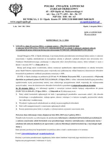 POLSKI ZWIĄZEK ŁOWIECKI ZARZĄD OKRĘGOWY PZ Ł 45 – 029 Opole ul. Malczewskiego 4 tel. / fax. ( 0-77 ) 453 – 84 – 56 / 57 NIP 526 - 030 - 04 - 63 BZ WBK SA. I O / Opole Konto 19 1090 2138 0000 0005 5600 0639 www.zopzl-opole.pl [email protected] L.dz. 364 / JK / 2016 Opole, 1 sierpnia 2016 r. KOŁA ŁOWIECKIE Wszystkie KOMUNIKAT Nr 3 / 2016 I. USTAWA z dnia 22 czerwca 2016 r. o zmianie ustawy – PRAWO ŁOWIECKIE w zakresie SZACOWANIA i WYPŁATY ODSZKODOWAŃ za szkody w plonach i płodach rolnych wyrządzonych przez zwierzynę łowną oraz utworzeniu FUNDUSZU ODSZKODOWAWCZEGO Zarząd Okręgowy PZŁ w Opolu informuje, iż po krętej drodze procedowania nowelizacji tekstu ustawy w zakresie szacowania i wypłaty odszkodowań za wyrządzone szkody w plonach i płodach rolnych oraz utworzeniu tzw. Funduszu Odszkodowawczego, przekazuje w załączeniu tekst znowelizowanej ustawy, która wchodzi w życie z dniem 1 stycznia 2017 r. ( Załącznik nr 1 ). Biorąc pod uwagę nasze oczekiwania, należy zaznaczyć ujednolicenie odpowiedzialności za szkody łowieckie przez Skarb Państwa reprezentowany przez wojewodę oraz jednoznaczny wkład finansowy dzierżawców obwodów łowieckich na podstawie wielkości pozyskania zwierzyny w RPŁ. ZO PZŁ w Opolu działając na podstawie § 133 ust. 9 i 10 Statutu Zrzeszenia PZŁ, w porozumieniu z Wojewodą Opolskim na podstawie pisma IN.III.7123.14.2016.JS z 25 lipca 2016 r. wobec wdrożenia bezkolizyjnej procedury egzekwowania wyżej przytoczonej ustawy oraz właściwego przygotowania służb wojewody do wykonywania nowych zadań, wnosi do dzierżawców obwodów łowieckich o przesłanie w nieprzekraczalnym terminie do 20 sierpnia 2016 r. n/w informacji zgodnie z zawartym wzorem tabelki będącej załącznikiem do pisma IN.III.7123.14.2016.JS z 25 lipca 2016 r. - ( Załącznik nr 2 ) dotyczącej m.in.: 1. Ilości szkód łowieckich zgłaszanych do koła ( sporządzonych protokołów szacowania szkód ) dla obwodu łowieckiego z uwzględnieniem rodzaju upraw, okresu ( miesiąca ) w którym wystąpiły, powierzchni szkody /ha/ całkowitej i zredukowanej. 2. Wysokość wypłaconych odszkodowań za szkody na poszczególnych obwodach. 3. Ilość osób zaangażowanych w szacowanie zgłaszanych szkód. 4. Koszty poniesione przez koła w związku z wykonywaniem czynności szacowania strat. Powyższe dane informacje winne obejmować lata 2014, 2015 oraz I połowę 2016 r. Ponadto koła łowieckie są zobowiązane do przekazania informacji o członkach kół łowieckich przeszkolonych z zakresu szacowania szkód łowieckich oraz przedstawiając właściwe zaświadczenia o ukończeniu kursu / szkolenia lub nabyciu dodatkowych uprawnień z zakresu likwidacji szkód łowieckich itp. ( kserokopie bądź skany ). Dane prosimy przekazywać bezpośrednio na poniższy adres e-mail z zachowaniem w/w terminu: E-mail: [email protected]; [email protected] . Prosimy o poważne potraktowanie zagadnienia, które ułatwi służbom wojewody jego merytoryczne oraz logistyczne przygotowanie i wdrożenie w życie. Zaznaczamy, iż zgodnie z Okólnikiem nr 24/O/16 ZG PZŁ w Warszawie należy mieć na uwadze, iż w nawiązaniu do pisma Ministra Środowiska - Znak sprawy DLP – VIII – 670 – 9 2016 z 1 czerwca 2016 r. ( Załącznik nr 3 ), przed wejściem w życie nowej ustawy opisywanej w przedmiotowym piśmie należy wzmożyć szczególny nadzór nad procesem szacowania szkód łowieckich i mobilizację myśliwych do ich ograniczania. Ponadto dla potrzeb ZO PZŁ w Opolu w nawiązaniu do powyższej tematyki proszę o przesłanie informacji na adres e-mail: [email protected] zgodnie z n/w wzorem: L.p. Nazwisko i imię Wykształcenie Staż w szacowaniu szkód KŁ Rejon szacowania ( Powiat – Gmina ) II. OCENA TROFEÓW ŁOWIECKICH oraz KRYTERIA ODSTRZAŁU SAMCÓW ZWIERZYNY PŁOWEJ Zarząd Okręgowy PZŁ informuje, iż w przypadku odstrzału samców zwierzyny płowej tj. Jelenie i Daniele byki oraz Sarny kozły dokonanych przez myśliwych zagranicznych i komercyjnych krajowych, prosimy organizatora polowania o podanie terminu zakończenia polowania zarówno indywidualnego jak i zbiorowego przynajmniej na 24h przed jego zakończeniem, celem dokonania oceny prawidłowości odstrzału przez komisję powołaną na podstawie § 133 ust. 20 Statutu Zrzeszenia PZŁ zgodnie z art. 42d. Ustawy Prawo łowieckie z dnia 13 października 1995 r. z późn. zm. Z ramienia ZO PZŁ w Opolu odpowiedzialnym za organizację i przeprowadzenie oceny jest Kol. Jan KOWALSKI – St. Instruktor ZO PZŁ w Opolu; członek Komisji Oceny i Wyceny Trofeów Łowieckich przy ORŁ w Opolu tel. mob. 505 755 609 lub tel. 77 453 84 56/57; Ponadto wyjaśniamy, na dzień dzisiejszy obowiązują Zasady selekcji osobniczej i populacyjnej zwierząt łownych w Polsce oraz zasad postępowania przy ocenie prawidłowości odstrzału – Stan prawny na dzień 1 października 2014 r. – Stanowiące Załącznik do Uchwały NRŁ nr 57/2005 z dnia 22 lutego 2005 r. Nowe zasady uchwalone przez NRŁ w Warszawie – Uchwałą nr 14 / 2015 z 15 grudnia 2015 r. w sprawie przyjęcia zasad selekcji populacyjnej i osobniczej zwierząt łownych w Polsce oraz zasad postępowania przy ocenie zgodności odstrzału, wejdą w życie z dniem wejścia nowych przepisów wykonawczych wydanych na podstawie art. 8 ust. 4 Ustawy Prawo łowieckie z dnia 13 października 1995 r. z późn. zm. o czym poinformujemy dzierżawców obwodów łowieckich. III. SPRAWY ORGANIZACYJNE Okręgowa Rada Łowiecka i Zarząd Okręgowy PZŁ w Opolu informuje, iż zgodnie z uchwałą zjazdową Okręgowego Zjazdu Delegatów PZŁ z 2015 r. coroczne „Hubertowiny Opolskie”, w tym roku odbędą się na terenie Muzeum Piastów Śląskich w Brzegu w dniu 5 listopada 2016 r. ( sobota). Ponadto n/w koła łowieckie zgodnie z wcześniejszymi ustaleniami organizują polowania zbiorowe na terenie swoich obwodów łowieckich dla zaproszonych gości i członków KŁ. Szczegółowy 