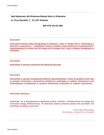 Strona główna Sąd Rejonowy dla Krakowa-Nowej Huty w Krakowie ul. Przy Rondzie 7, 31-547 Kraków NIP 676-10-43-368 Komunikat Komunikat Prezesa Sądu Okręgowego w Krakowie z dnia 17 lutego 2017r. informujący o dyżurach związanych z "Tygodniem Pomocy Osobom Pokrzywdzonym Przestępstwem" organizowanych w dniach od 20 lutego do 26 lutego 2017 roku w Sądzie Okręgowym w Krakowie. Komunikat Komunikat w sprawie zniesienia VIII Wydziału Karnego Komunikat Komunikat w sprawie Zarządzenia Ministra Sprawiedliwości z dnia 30 grudnia 2016 roku w sprawie zniesienia i utworzenia niektórych wydziałów w sądach rejonowych oraz zmieniającym zarządzenie w sprawie utworzenia wydziałów w sądach rejonowych Komunikat Specjalny Informuję, że w postępowaniu sądowym pisma, wnioski i oświadczenia nie mogą być wnoszone drogą elektroniczną. W obecnym stanie prawnym pisma tak przesłane nie wywołują skutków prawnych. Prezes Sądu Rejonowego dla Krakowa – Nowej Huty w Krakowie Strona główna Strona główna Informacji we wszystkich sprawach udziela Biuro Obsługi Interesanta - szczegóły kliknij tutaj Poziom 0 (parter - przy głównym wejściu budynku) tel.: 12 619 50 86 tel.: 12 619 57 70 Ocena satysfakcji interesanta - ankieta Godziny przyjęć interesantów: w poniedziałki od godz. 8:00 do godz. 18:00 od wtorku do piątku od godz. 8:00 do godz. 15:00 Punkty Informacyjne czynne są: w poniedziałki od godz. 7:45 do godz. 18:00 od wtorku do piątku od godz. 7:45 do godz. 15:30 Dziennik podawczy urzęduje: w poniedziałek od 8:00 do 18:00 od wtorku do piątku od 8:00 do 15:00 Czytelnia akt: Czynna w poniedziałki od godz. 8:00 do godz. 18:00, od wtorku do piątku w godzinach: 8:00 - 15:00 . Akta można przeglądać wyłącznie w czytelni - pokój E-217, pawilon E (piętro II) w poniedziałki od godz. 8:00 do godz. 18:00, od wtorku do piątku w godz. 8.00 - 15.00, po wcześniejszej telefonicznej lub osobistej rezerwacji w sekretariacie danego Wydziału. - szczegóły kliknij tutaj. Kasa zlokalizowana w siedzibie sądu ul. Przy Rondzie 7: Kasa przyjmuje wpłaty i wypłaty: - od poniedziałku do piątku od godz. 8:00 do godz. 15:00 - w ostatni dzień roboczy miesiąca w godzinach od 8:00 do 13:30 przerwy: pierwsza 11:45 - 12:00, druga 14:00 - 14:15 tel. 12 619-55-13 Strona główna Strona główna Kasa zlokalizowana w budynku w Proszowicach przy Wydziale V Ksiąg Wieczystych, ul. Kosynierów 28: Kasa przyjmuje wpłaty i wypłaty w dni robocze: - w poniedziałki od godz. 9:00 do godz. 18:00 - od wtorku do piątku w godzinach od 08:00 do 15:00 - w ostatni dzień roboczy miesiąca jest nieczynna tel. 12 347-37-03 lub 12 386-10-30 wew. 203 Dojazd do sądu. Linie autobusowe - 115, 124, 125, 128, 152, 182, 184, 192, 424, 425, 501, 502, 522 Linie tramwajowe - 4, 5, 9, 10, 14, 15, 20, 40, 50, 51 Wskazówki dla trasy pieszej z dworca kolejowego kliknij tutaj: "Dworzec Główny PKP Kraków" Wskazówki dla trasy pieszej z dworca autobusowego kliknij tutaj: "Dworzec Autobusowy PKS Kraków" Pokaż Sąd Rejonowy dla Krakowa-Nowej Huty w Krakowie na większej mapie Strona główna