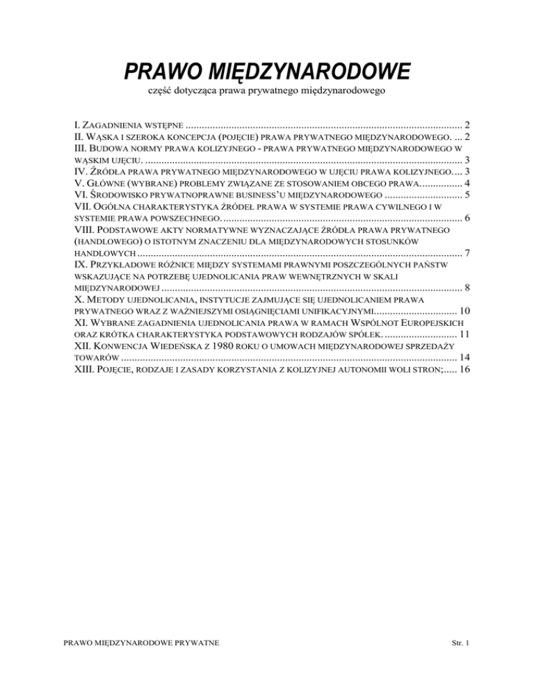PRAWO MIĘDZYNARODOWE część dotycząca prawa prywatnego międzynarodowego I. ZAGADNIENIA WSTĘPNE ....................................................................................................... 2 II. WĄSKA I SZEROKA KONCEPCJA (POJĘCIE) PRAWA PRYWATNEGO MIĘDZYNARODOWEGO. ... 2 III. BUDOWA NORMY PRAWA KOLIZYJNEGO - PRAWA PRYWATNEGO MIĘDZYNARODOWEGO W WĄSKIM UJĘCIU. ...................................................................................................................... 3 IV. ŹRÓDŁA PRAWA PRYWATNEGO MIĘDZYNARODOWEGO W UJĘCIU PRAWA KOLIZYJNEGO. ... 3 V. GŁÓWNE (WYBRANE) PROBLEMY ZWIĄZANE ZE STOSOWANIEM OBCEGO PRAWA. ............... 4 VI. ŚRODOWISKO PRYWATNOPRAWNE BUSINESS’U MIĘDZYNARODOWEGO ............................. 5 VII. OGÓLNA CHARAKTERYSTYKA ŹRÓDEŁ PRAWA W SYSTEMIE PRAWA CYWILNEGO I W SYSTEMIE PRAWA POWSZECHNEGO. ......................................................................................... 6 VIII. PODSTAWOWE AKTY NORMATYWNE WYZNACZAJĄCE ŹRÓDŁA PRAWA PRYWATNEGO (HANDLOWEGO) O ISTOTNYM ZNACZENIU DLA MIĘDZYNARODOWYCH STOSUNKÓW HANDLOWYCH ......................................................................................................................... 7 IX. PRZYKŁADOWE RÓŻNICE MIĘDZY SYSTEMAMI PRAWNYMI POSZCZEGÓLNYCH PAŃSTW WSKAZUJĄCE NA POTRZEBĘ UJEDNOLICANIA PRAW WEWNĘTRZNYCH W SKALI MIĘDZYNARODOWEJ ................................................................................................................ 8 X. METODY UJEDNOLICANIA, INSTYTUCJE ZAJMUJĄCE SIĘ UJEDNOLICANIEM PRAWA PRYWATNEGO WRAZ Z WAŻNIEJSZYMI OSIĄGNIĘCIAMI UNIFIKACYJNYMI............................... 10 XI. WYBRANE ZAGADNIENIA UJEDNOLICANIA PRAWA W RAMACH WSPÓLNOT EUROPEJSKICH ORAZ KRÓTKA CHARAKTERYSTYKA PODSTAWOWYCH RODZAJÓW SPÓŁEK. ........................... 11 XII. KONWENCJA WIEDEŃSKA Z 1980 ROKU O UMOWACH MIĘDZYNARODOWEJ SPRZEDAŻY TOWARÓW ............................................................................................................................. 14 XIII. POJĘCIE, RODZAJE I ZASADY KORZYSTANIA Z KOLIZYJNEJ AUTONOMII WOLI STRON;..... 16 PRAWO MIĘDZYNARODOWE PRYWATNE Str. 1 I. Zagadnienia wstępne 1. Cel uzyskania wiedzy z zakresu prawa prywatnego międzynarodowego a) zapoznanie się z zasadami, które decydują o tym, jakie normy prawa znajdują zastosowania do stosunków czy sytuacji z zakresu prawa prywatnego, zawierających w swej treści elementy międzynarodowe (elementy obce) b) zapoznanie się ze stanem ujednolicenia przez państwa w drodze umów (konwencji) międzynarodowych krajowych systemów prawa prywatnego, głównie w zakresie norm odnoszących się do stosunków handlowych 2) Ogólna specyfika tej części przedmiotu kierunkowego - prawo międzynarodowe, dotycząca prawa prywatnego a) Różnice między prawem prywatnym a prawem publicznym Prawo prywatne odnosi się do stosunków, w których prawa i obowiązki stron regulowane są na zasadzie równości i niepodporządkowania, natomiast prawo publiczne ma za przedmiot stosunki, w których jeden z podmiotów posiada uprawnienia zwierzchnicze (władcze) wobec drugiego podmiotu b) Różnice między prawem publicznym międzynarodowym a prawem prywatnym międzynarodowym Źródła prawa publicznego międzynarodowego maj ą charakter międzynarodowy (umowy i zwyczaje międzynarodowe), natomiast źródła prawa prywatnego międzynarodowego maja charakter wewnętrzny (każde państwo ma swoje własne prawo międzynarodowe). II. Wąska i szeroka koncepcja (pojęcie) prawa prywatnego międzynarodowego. 1. Wąskie rozumienie pojęcia prawa prywatnego międzynarodowego Utożsamiane jest z koncepcją tzw. prawa kolizyjnego, tzn. takiego prawa, które stanowi zespół norm prawnych o charakterze wewnętrznym określających, jakiego państwa system prawny należy zastosować przy ocenie sytuacji (np. zdolności prawnej czy zdolności do czynności prawnych) lub stosunków (np. umowy sprzedaży) z dziedziny obrotu cywilnego, w przypadku gdy w danej sytuacji (czy w treści danego stosunku) zawarty jest element obcy tzn. wskazujący na powiązanie danej sytuacji (czy stosunku) ze zwierzchnictwem terytorialnym lub osobowym innych państw. 2. Szeroka koncepcja prawa prywatnego międzynarodowego Łączy w ramach pojęcia takiego prawa prawo kolizyjne z tzw. prawem obcych oraz tą częścią wewnętrznego (krajowego) prawa prywatnego, która została ujednolicona na podstawie umów (konwencji) międzynarodowych - prawo obcych stanowi tą część prawa wewnętrznego, która ma za przedmiot sytuację prawną cudzoziemców. 3. Rozstrzygnięcia kolizyjne między systemami prawa materialnego Są często łączone z rozstrzygnięciami kolizyjnymi w zakresie prawa formalnego (procesowego); prowadzi to do łączenia międzynarodowego prawa prywatnego z międzynarodowym prawem procesowym. 4. W Polsce i w Niemczech przeważa wąska koncepcja prawa prywatnego międzynarodowego jako prawa kolizyjnego, szwajcarska ustawa o prawie prywatnym międzynarodowym z 1987r. zawiera normy z zakresu prawa kolizyjnego zarówno z dziedziny prawa materialnego jak i procesowego, w Wielkiej Brytanii i w USA regulacje w zakresie kolizji prawnomaterialnych i kolizji procesowych ujmowane są jako jedna, PRAWO MIĘDZYNARODOWE PRYWATNE Str. 2 wzajemnie powiązana całość, najszersza koncepcja prawa prywatnego międzynarodowego występuje w doktrynie i praktyce Francji. III. Budowa normy prawa kolizyjnego - prawa prywatnego międzynarodowego w wąskim ujęciu. 1. Odróżnienie normy kolizyjnej od normy merytorycznej. Norma kolizyjna nie rozstrzyga o prawach i obowiązkach osób występujących w stosunkach prawnych, jej znaczenie polega na wskazaniu na ten system prawny, który zadecyduje o takich prawach i obowiązkach normy decydujące wprost o prawach i obowiązkach są w odróżnieniu od norm kolizyjnych normami merytorycznymi. 2. Budowa normy kolizyjnej Podporządkowana jest funkcji ja