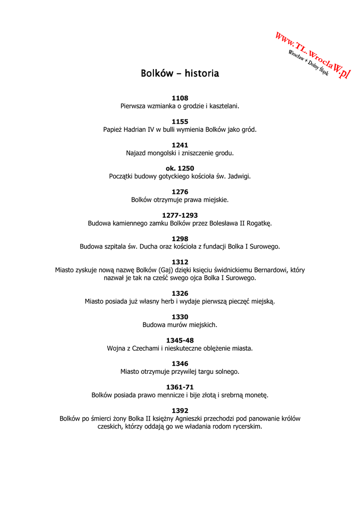Bolków Bolków - historia 1108 Pierwsza wzmianka o grodzie i kasztelani. 1155 PapieŜ Hadrian IV w bulli wymienia Bolków jako gród. 1241 Najazd mongolski i zniszczenie grodu. ok. 1250 Początki budowy gotyckiego kościoła św. Jadwigi. 1276 Bolków otrzymuje prawa miejskie. 1277-1293 Budowa kamiennego zamku Bolków przez Bolesława II Rogatkę. 1298 Budowa szpitala św. Ducha oraz kościoła z fundacji Bolka I Surowego. 1312 Miasto zyskuje nową nazwę Bolków (Gaj) dzięki księciu świdnickiemu Bernardowi, który nazwał je tak na cześć swego ojca Bolka I Surowego. 1326 Miasto posiada juŜ własny herb i wydaje pierwszą pieczęć miejską. 1330 Budowa murów miejskich. 1345-48 Wojna z Czechami i nieskuteczne oblęŜenie miasta. 1346 Miasto otrzymuje przywilej targu solnego. 1361-71 Bolków posiada prawo mennicze i bije złotą i srebrną monetę. 1392 Bolków po śmierci Ŝony Bolka II księŜny Agnieszki przechodzi pod panowanie królów czeskich, którzy oddają go we władania rodom rycerskim. 29.VIII.1428-1430 Miasto zostaje zdobyte i zniszczone przez Husytów w czasie wojen husyckich. 1461 Odbudowa szpitala św. Ducha. 1463 Król czeski Jerzy z Podiebradu zdobywa zamek i oddaje jako lenno burgrabiowi Hansowi von Tschirnhausowi (Janowi z Czernej), który zasłynął w okolicy z rozbojów, co pięć lat później staje się powodem zbrojnej wyprawy mieszczan na zamek. 1465 Bolków kupuje wieś Wolbromek. 1468 Zbrojna wyprawa mieszczan ze Świdnicy i Wrocławia na zamek w Bolkowie kończy się zdobyciem zamku i zabiciem przez powieszenie Jana z Czernej. Pieczę nad miastem i zamkiem przejmuje król Maciej Korwin. 1483 Maciej Korwin umacnia zamek. 1490 Po wstąpieniu na tron Węgier Władysława Jagiellończyka Bolków zostaje odbity przez namiestnika królewskiego – księcia cieszyńskiego Kazimierza II z rąk zwolenników nieŜyjącego juŜ króla Macieja Korwina. 1493-94 Zamek i miasto zostaje oblęŜony i zdobyty przez księcia Kazimierza II Cieszyńskiego i przekazany przez Władysław Jagiellończyka Fabianowi von Tschirnhaus. 27.IV.1495 Król Władysław Jagiellończyk potwierdza wszystkie nadane wcześniej miastu przywileje. XVI w. Wiek ciągłych nieszczęść i kataklizmów nawiedza miasto – zaraza, dŜuma, powodzie, trzęsienie ziemi. 1508 Miasto zdobywa przywilej wyboru rady miejskiej. 1526 Przejście miasta pod panowanie dynastii Habsburgów i króla Czech i Węgier Ferdynanda (syna Filipa i Joanny). 09.IX.1526 Miastu nadane zostaje przywilej jarmarku na Trzech Króli i w dzień św. Michała (29.IX). 1534 Biskup wrocławski i nyski Jakub rozszerza przywilej jarmarków na Niedzielę Palmową, Wniebowstąpienie i dzień św. Jakuba (25.VII). 1539-40 Architekt z Lombardii Jakub Parr (Pahr, de Pario) przebudowuje zamek na styl renesansowy i powiększa fortyfikacje. 1544 Kościół św. Jadwigi zostaje przemianowany na luterański. 1551 Miasto liczy 120 domów. 1553 Epidemia dŜumy – umiera 1/3 mieszkańców. 1555 Powstaje cech piekarzy. 1567 Wielka powódź, wystąpienie z brzegów Nysy Szalonej. 1570 Druga powódź Nysy Szalonej. 1573 Kolejna wielka powódź. 1583 Zaraza w mieście – umiera 342 mieszkańców. 1590 Kolejny kataklizm nawiedza Bolków – tym razem trzęsienie ziemi przynosi znaczne straty materialne. 1596 Właścicielem zamku zostaje Maciej Łoga. 1622 PoŜar szpitala św. Ducha. 23.V.1618 Początek Wojny Trzydziestoletniej, podczas której miasto zostanie kilkakrotnie oblęŜane, zdobyte i splądrowane. 1629 Austriacki dragon von Bibra zajmuje miasto podczas Wojny Trzydziestoletniej i zmienia kościół z powrotem na katolicki. Mieszkańcy Bolkowa, w większości protestanci, są zmuszani wyznawać katolicyzm. 23.03.1632 Wielki poŜar miasta w święta Wielkanocne – tylko ratusz i cztery domy zostają oszczędzone. 1640-42 Podczas Wojny Trzydziestoletniej wojska szwedzkie pod dowództwem fińskiego oficera Torstena Stålhandske dwukrotnie bezskutecznie oblegają miasto. IX.1646 Trzecie oblęŜenie Bolkowa przez Szwedów tym razem pod dowództwem Arvida Wittenberga i kapitulacja miasta, dowódcą obrony Bolkowa dowodzi baron von Zedlitz. 1646-50 Kościół ponownie zostaje przemianowany na protestancki. 24.X.1648 Koniec Wojny Trzydziestoletniej – populacja Bolkowa liczy zaledwie 100 mieszkańców, a straty materialne po wojnie wynoszą wg róŜnych wyliczeń 30-35 tys. guldenów. 1650 Dynamiczny rozwój tkactwa w rejonie w tym takŜe w Bolkowie. 08.V.1650 Wymarsz wojsk szwedzkich z miasta. 1669 Cesarz Leopold I potwierdza przywileje miasta. 1670 Miasto buduje nowy ratusz. 1674 Budowa nowego szpitala. 1688 Populacja Bolkowa wynosi juŜ 456 mieszkańców. 1704 Zakon cystersów z Krzeszowa kupuje miasto. Wchodzi takŜe w posiadanie zamku, po śmierci ostatnich właścicieli von Zedlitzów i rozpoczyna jego remont i przebudowę. 1707 Zorganizowano pierwszy targ na płótno lniane i przędzę, powstaje takŜe pierwszy drewniany wodociąg z Wierzchosławic. 1720 Piorun uderza w zamek i budowlę trawi poŜar. 1727 Powstaje figura św. Jana Nepomucena. 1742 Śląsk pod panowaniem pruskim – w mieście na rynku (w miejscu gdzie teraz stoi anielska fontanna) powstaje drewniano-murowany ewangelicki kościół. 1745 Miasto liczy 1033 mieszkańców. 1756-63 Wojna Siedmioletnia pomiędzy Wielką Brytanią i Prusami a Francją, Austrią, Rosją i Szwecją. 1761 Mieszczanie Bolkowa płacą Prusom kontrybucję w wysokości 5 tys. talarów. 1763 Przemarsz wojsk rosyjskich, które plądrują miasto i okolicę, od tej pory zamek w Bolkowie stoi opuszczony. 1775 Król Prus Fryderyk II Wielki uwalnia miasto od słuŜby wojskowej, poniewaŜ przemysł lniany ma duŜe znaczenie dla zaopatrzenia gromady i tworzy straŜ obywatelską. 1792 W mieście wybudowane zostają wodociągi. 25.III.1793 Powstanie tkaczy. 1795 Powstaje kronika „Bolkowskie osobliwości na podstawie rękopisów, dokumentów i ksiąŜek, zebrane i opracowane przez Benjamina Gottlieba Steige, kup