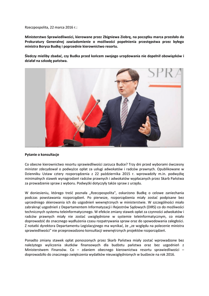 Rzeczpospolita, 22 marca 2016 r.: Ministerstwo Sprawiedliwości, kierowane przez Zbigniewa Ziobrę, na początku marca przesłało do Prokuratury Generalnej zawiadomienie o możliwości popełnienia przestępstwa przez byłego ministra Borysa Budkę i poprzednie kierownictwo resortu. Śledczy mieliby zbadać, czy Budka przed końcem swojego urzędowania nie dopełnił obowiązków i działał na szkodę państwa. Pytanie o konsultacje Co obecne kierownictwo resortu sprawiedliwości zarzuca Budce? Trzy dni przed wyborami ówczesny minister zdecydował o podwyżce opłat za usługi adwokatów i radców prawnych. Opublikowane w Dzienniku Ustaw cztery rozporządzenia z 22 października 2015 r. wprowadziły m.in. podwyżkę minimalnych stawek wynagrodzeń radców prawnych i adwokatów wypłacanych przez Skarb Państwa za prowadzenie spraw z wyboru. Podwyżki dotyczyły także spraw z urzędu. W doniesieniu, którego treść poznała „Rzeczpospolita", oskarżono Budkę o celowe zaniechania podczas powstawania rozporządzeń. Po pierwsze, rozporządzenia miały zostać podpisane bez uprzedniego skierowania ich do uzgodnień wewnętrznych w ministerstwie. W szczególności miało zabraknąć uzgodnień z Departamentem Informatyzacji i Rejestrów Sądowych (DIRS) co do możliwości technicznych systemu teleinformatycznego. W efekcie zmiany stawek opłat za czynności adwokatów i radców prawnych miały nie zostać uwzględnione w systemie teleinformatycznym, co miało doprowadzić do znacznego wydłużenia czasu rozpatrywania spraw oraz do spowodowania zaległości. Z notatki dyrektora Departamentu Legislacyjnego ma wynikać, że „ze względu na polecenie ministra sprawiedliwości" nie przeprowadzono konsultacji wewnętrznych projektów rozporządzeń. Ponadto zmiany stawek opłat ponoszonych przez Skarb Państwa miały zostać wprowadzone bez należytego wyliczenia skutków finansowych dla budżetu państwa oraz bez uzgodnień z Ministerstwem Finansów. Co – zdaniem obecnego kierownictwa resortu sprawiedliwości – doprowadziło do znacznego zwiększenia wydatków nieuwzględnionych w budżecie na rok 2016. Co więcej, istotne uwagi zgłaszane choćby przez szefową KPRM oraz inne instytucje państwowe nie zostały w ogóle wzięte pod uwagę. Polityczna zemsta? Złożenie zawiadomienia do prokuratury przeciwko jednemu z najważniejszych ministrów w rządzie Platformy wpisuje się w zapowiadane przez PiS rozliczanie obecnej opozycji z jej ostatnich ośmiu lat rządów. Ponadto – jak słyszymy od polityków PiS – Budka sam jest radcą prawnym i gdyby nie dostał się do Sejmu, prawdopodobnie wróciłby do wykonywanego przez siebie zawodu. Podwyższając więc stawki, mógł działać na własną korzyść. Borys Budka w rozmowie z „Rzeczpospolitą" całą sprawę określa mianem zemsty politycznej PiS. – Chciałbym poznać treść stawianych mi zarzutów i oczywiście jeśli którykolwiek z organów ścigania skontaktuje się ze mną w tej sprawie, to będę z całą otwartością na ten temat rozmawiał – zapewnia Budka. Jak tłumaczy, zmiana rozporządzeń dotycząca stawek za usługi radcowskie i adwokackie była konieczna, bo nie były one zmieniane od 13 lat. – Rozporządzenia te były szeroko konsultowane zarówno w samym Ministerstwie Sprawiedliwości, jak i z samorządami prawniczymi i innymi ministerstwami, w tym z resortem finansów – zapewnia. Były minister sprawiedliwości jest przekonany, że zawiadomienie motywowane jest politycznie. – Dwukrotnie obnażyłem przed Trybunałem Konstytucyjnym kłamstwa PiS. Wiem dobrze, że od pierwszego dnia przejęcia przez Zbigniewa Ziobrę resortu sprawiedliwości niektóre osoby dostały polecenie, że mają coś na mnie znaleźć, by mnie zdyskredytować. Teraz to się dzieje – przekonuje Budka. Resort sprawiedliwości uważa, że zaniedbania były. – Tak szybkie i nieudolne procedowanie ważnych rozporządzeń na trzy dni przed wyborami spowodowało spowolnienie w pracach sądów i rozpatrywania spraw. Ponadto rzuca poważne podejrzenie, że minister Budka jako radca prawny mógł działać we własnym interesie, gdyż podejmując decyzje, nie mógł być pewny mandatu posła – mówi nam rzecznik Sebastian Kaleta. – Sytuacja jest przedziwna, bo sam minister Ziobro na mnie donosi, a teraz jako prokurator generalny będzie decydował o wszczęciu i przebiegu ewentualnego śledztwa – zauważa Budka.