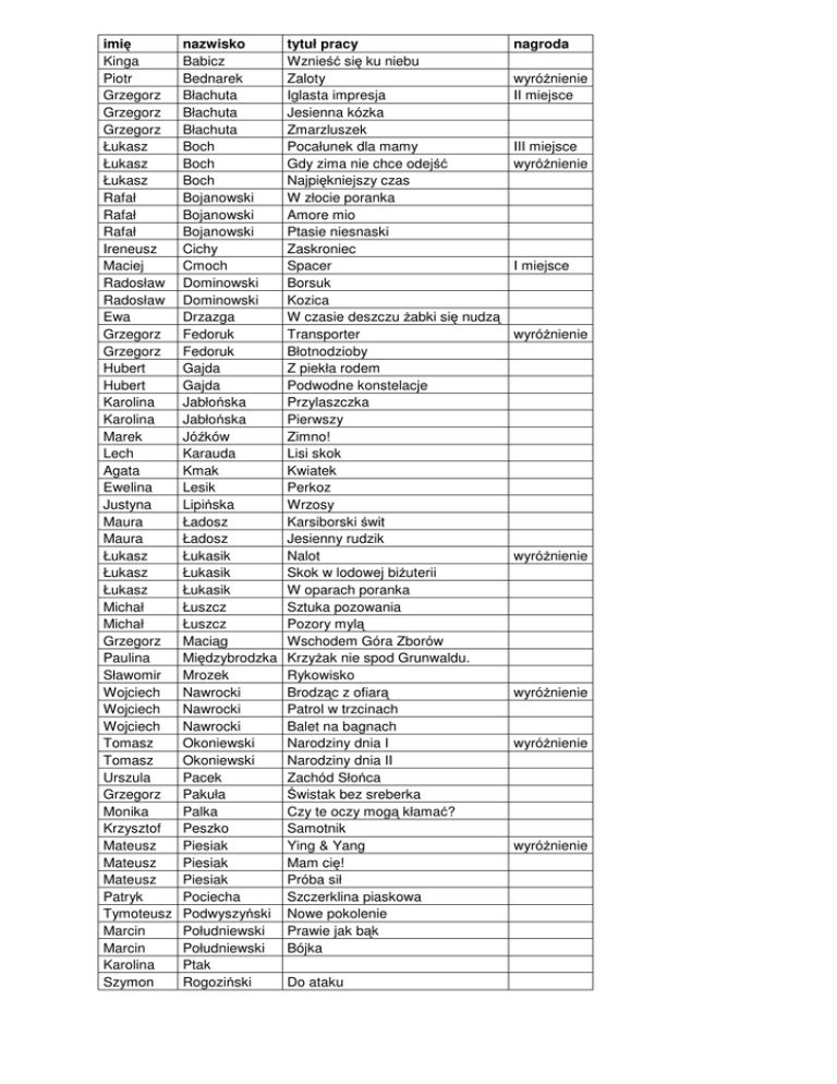 imię Kinga Piotr Grzegorz Grzegorz Grzegorz Łukasz Łukasz Łukasz Rafał Rafał Rafał Ireneusz Maciej Radosław Radosław Ewa Grzegorz Grzegorz Hubert Hubert Karolina Karolina Marek Lech Agata Ewelina Justyna Maura Maura Łukasz Łukasz Łukasz Michał Michał Grzegorz Paulina Sławomir Wojciech Wojciech Wojciech Tomasz Tomasz Urszula Grzegorz Monika Krzysztof Mateusz Mateusz Mateusz Patryk Tymoteusz Marcin Marcin Karolina Szymon nazwisko Babicz Bednarek Błachuta Błachuta Błachuta Boch Boch Boch Bojanowski Bojanowski Bojanowski Cichy Cmoch Dominowski Dominowski Drzazga Fedoruk Fedoruk Gajda Gajda Jabłońska Jabłońska Jóźków Karauda Kmak Lesik Lipińska Ładosz Ładosz Łukasik Łukasik Łukasik Łuszcz Łuszcz Maciąg Międzybrodzka Mrozek Nawrocki Nawrocki Nawrocki Okoniewski Okoniewski Pacek Pakuła Palka Peszko Piesiak Piesiak Piesiak Pociecha Podwyszyński Południewski Południewski Ptak Rogoziński tytuł pracy Wznieść się ku niebu Zaloty Iglasta impresja Jesienna kózka Zmarzluszek Pocałunek dla mamy Gdy zima nie chce odejść Najpiękniejszy czas W złocie poranka Amore mio Ptasie niesnaski Zaskroniec Spacer Borsuk Kozica W czasie deszczu żabki się nudzą Transporter Błotnodzioby Z piekła rodem Podwodne konstelacje Przylaszczka Pierwszy Zimno! Lisi skok Kwiatek Perkoz Wrzosy Karsiborski świt Jesienny rudzik Nalot Skok w lodowej biżuterii W oparach poranka Sztuka pozowania Pozory mylą Wschodem Góra Zborów Krzyżak nie spod Grunwaldu. Rykowisko Brodząc z ofiarą Patrol w trzcinach Balet na bagnach Narodziny dnia I Narodziny dnia II Zachód Słońca Świstak bez sreberka Czy te oczy mogą kłamać? Samotnik Ying & Yang Mam cię! Próba sił Szczerklina piaskowa Nowe pokolenie Prawie jak bąk Bójka Do ataku nagroda wyróżnienie II miejsce III miejsce wyróżnienie I miejsce wyróżnienie wyróżnienie wyróżnienie wyróżnienie wyróżnienie Szymon Agnieszka Katarzyna Michał Michał Tomasz Tomasz Marcin Małgorzata Małgorzata Jagoda Piotr Grzegorz Paweł Adrian Elżbieta Krzysztof Krzysztof Marek Ewelina Ewelina Jacek Rogoziński Rusinowska Salamon Skałba Skałba Skorupka Skorupka Stańczyk Stępniak Stępniak Sytniewska Szewczyk Szkutnik Szymura Ślązok Urbaniak Wojciechowski Wojciechowski Zarankiewicz Zuba Zuba Żbikowski Kanibal Kózka Nowy dom Beskidzki smok Przebudzenie Wstrząśnięty, nie zmieszany W pełnym majestacie Zwiastun wiosny Przybysz z daleka Portret pustułki Let's rock'n'roll W bukowym lesie Dzięcioł zielony Pogromca gąsienic leśny strażnik Kula ognia Bóbr w nocnej kołdrze Bryzgacz Las bukowy – Góra św. Anny Disco pająk Larwa ćwika Perkozie gody wyróżnienie wyróżnienie wyróżnienie